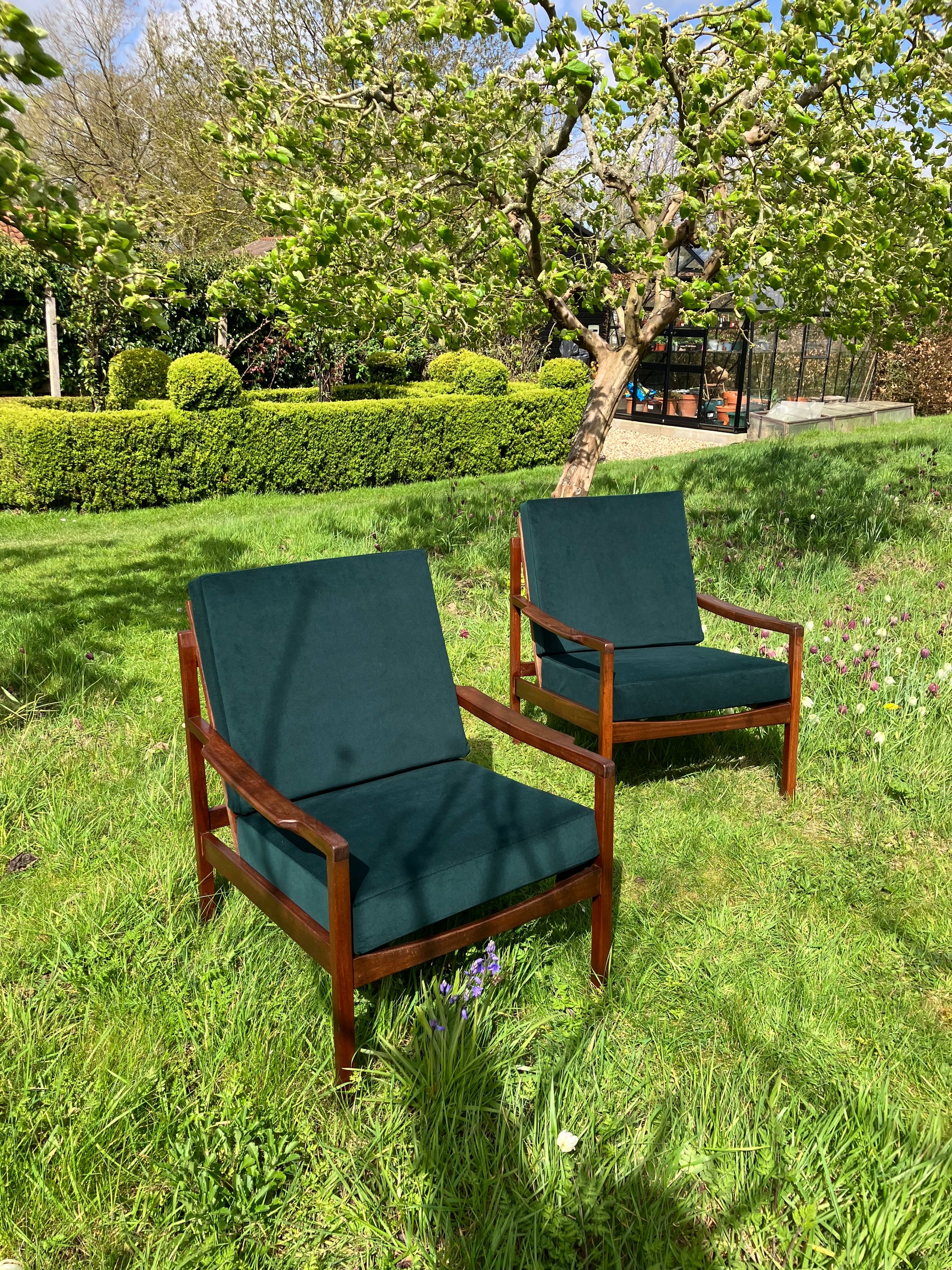 Lovely pair of teak lounge chairs. Newly upholstered in luxury green velvet. All new foam and webbing. The frames have also been completely restored.