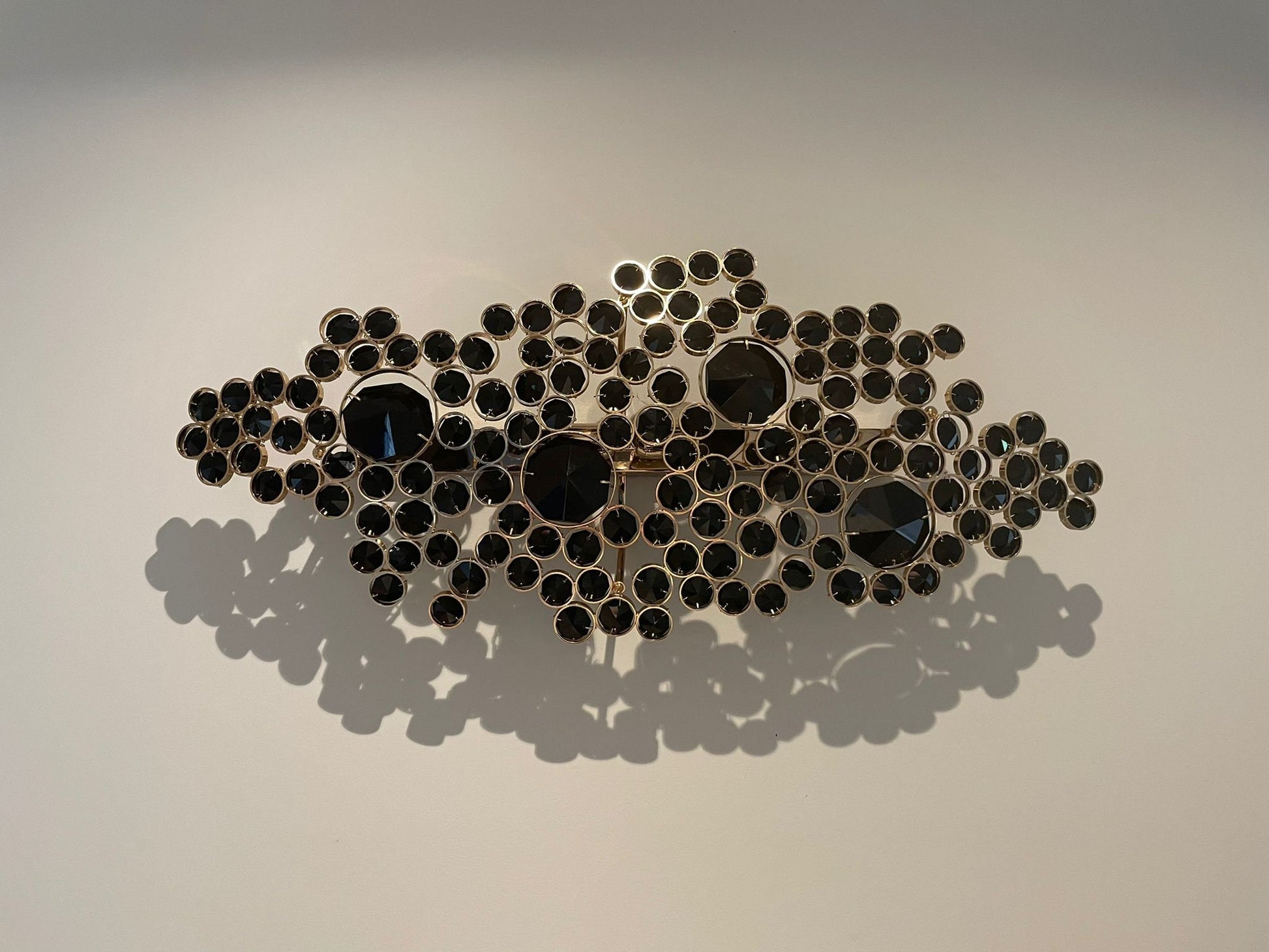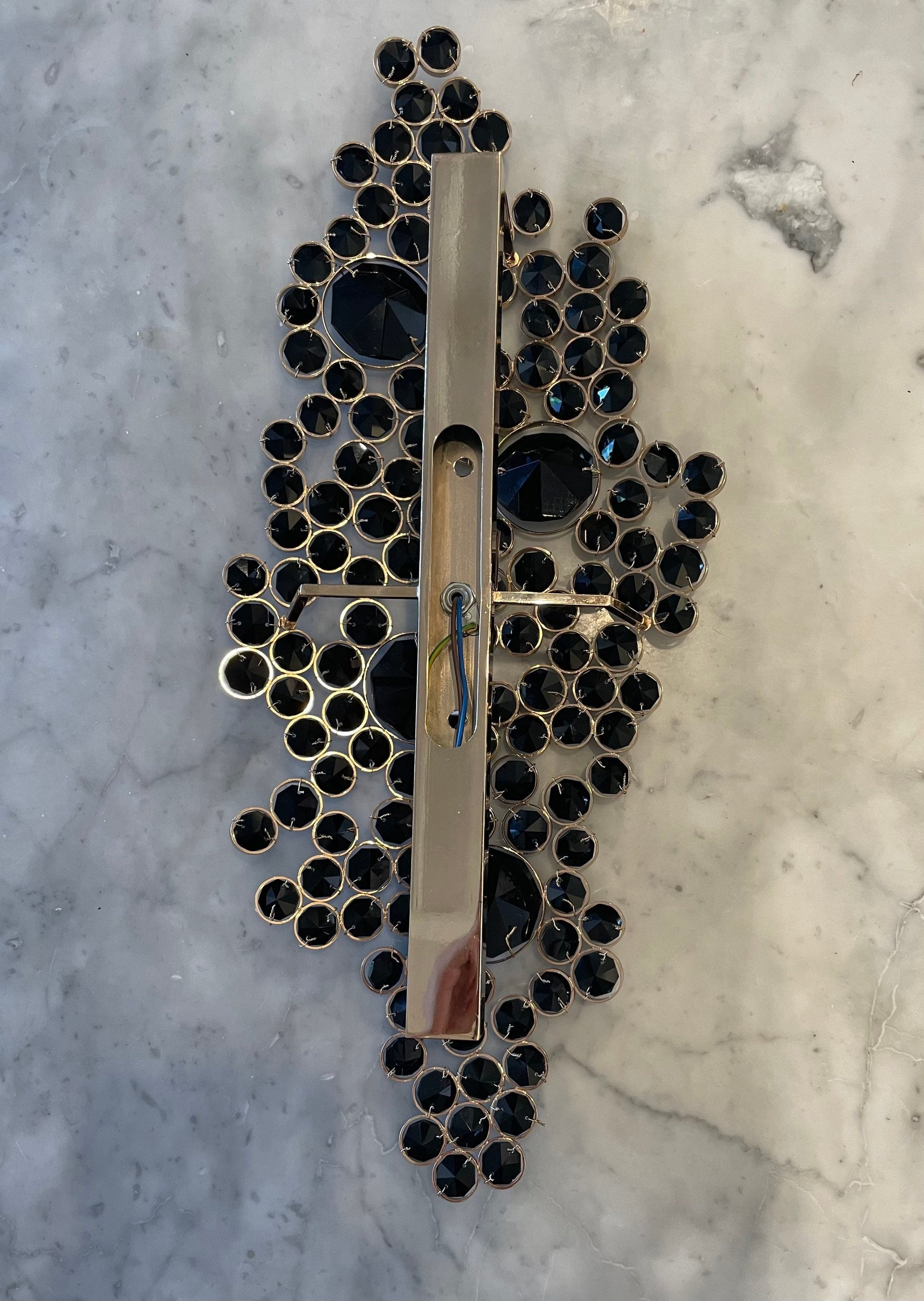 These wall fixtures are really striking in their contrasting black and gold features but also their large size. Due to their nature, you can choose how you place them on the wall, whether it is horizontal, vertical or even at a more obscure and fun angles. They would look fantastic in a dining room, living room or a jazzy bedroom. The light shines through the gems in a cool way, and this adds a wonderful atmosphere to the room. They are in excellent vintage condition.