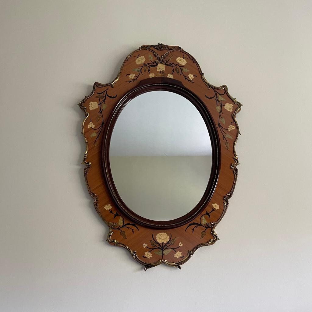 This stylish mirror is a real showstopper. It is very unusual and was originally made in Spain in the 1960s. It has inlaid marquetry and wonderful floral detail and ormule trim. The wood has a lovely warm tone and contrasts beautifully with the gold. It would look perfect in a bathroom or even over a console table in a hall way.