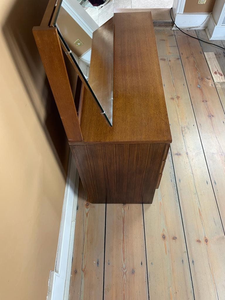 Super cute and practical British made Meredew teak Vanity unit or dressing table. It has been restored and is in good condition, with small marks consistent with its age.