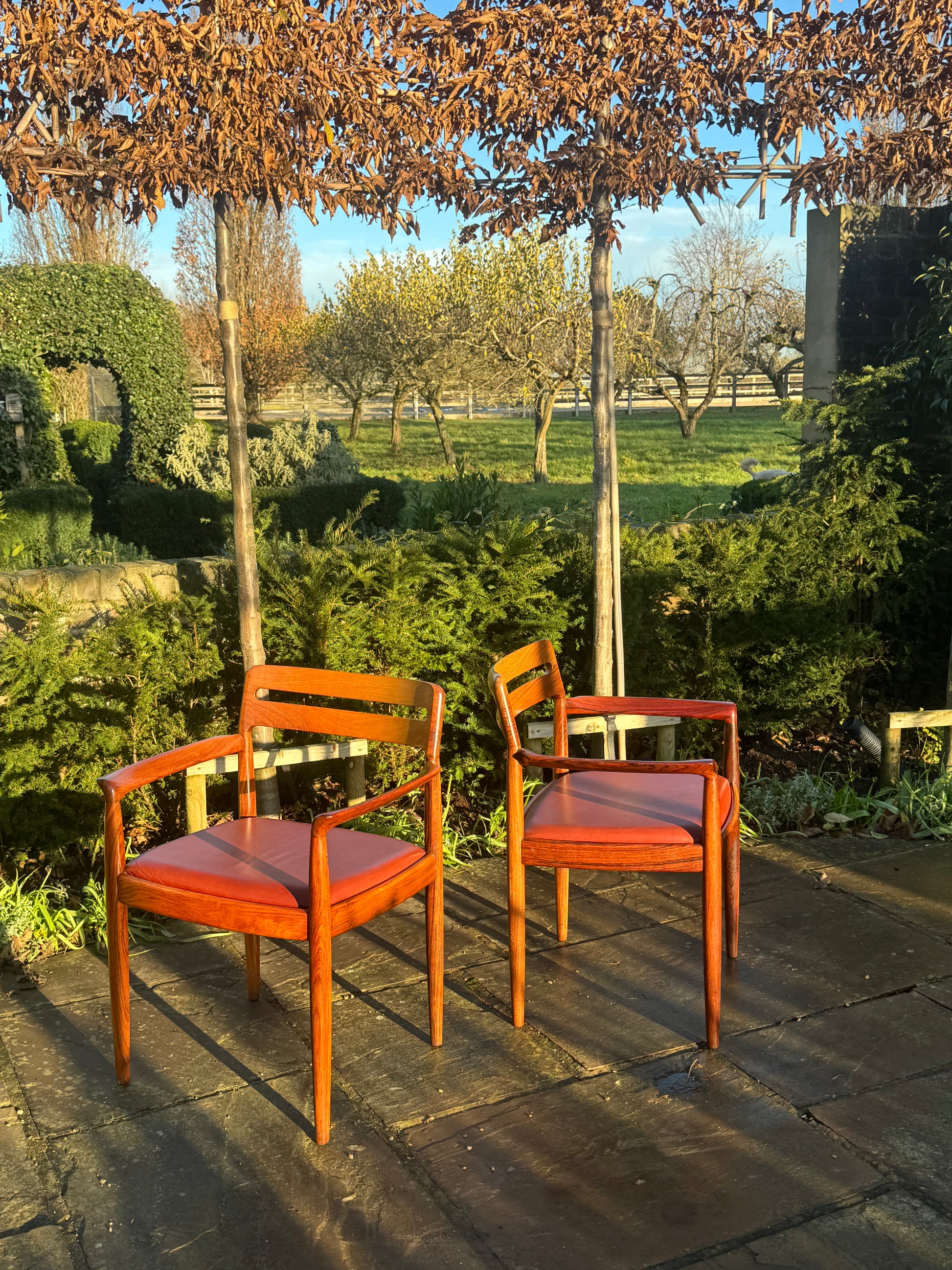 Eight exceptional rosewood dining chairs including two carvers. These beautiful chairs were designed by H W Klein for manufacturers Bramin. They are model 682 chairs and are extremely rare. They exude class with stunning fluid lines.