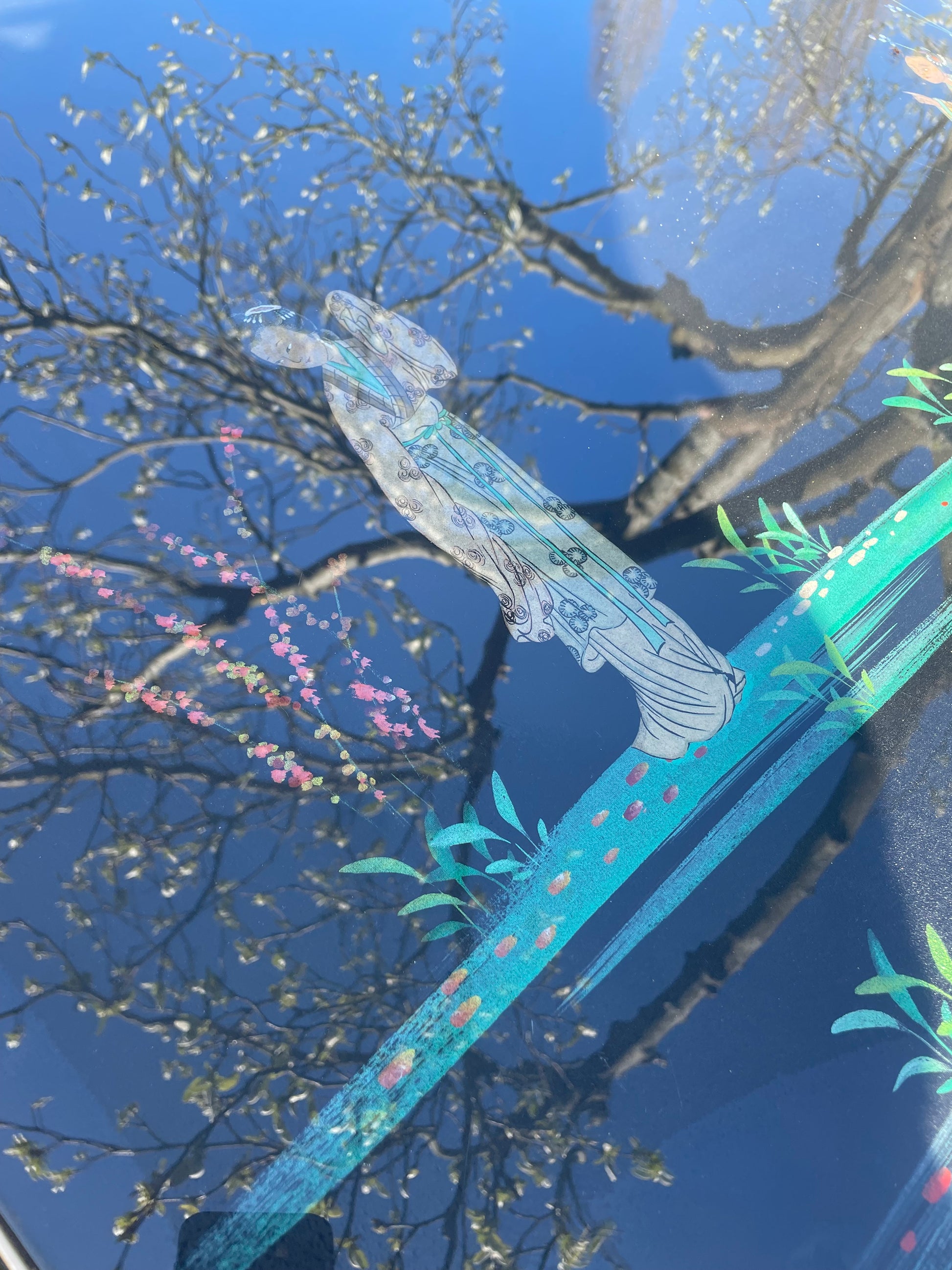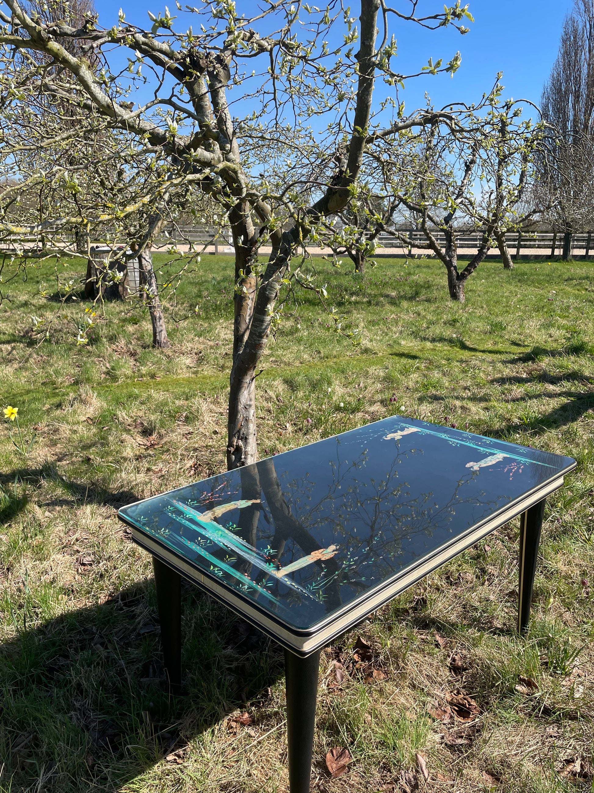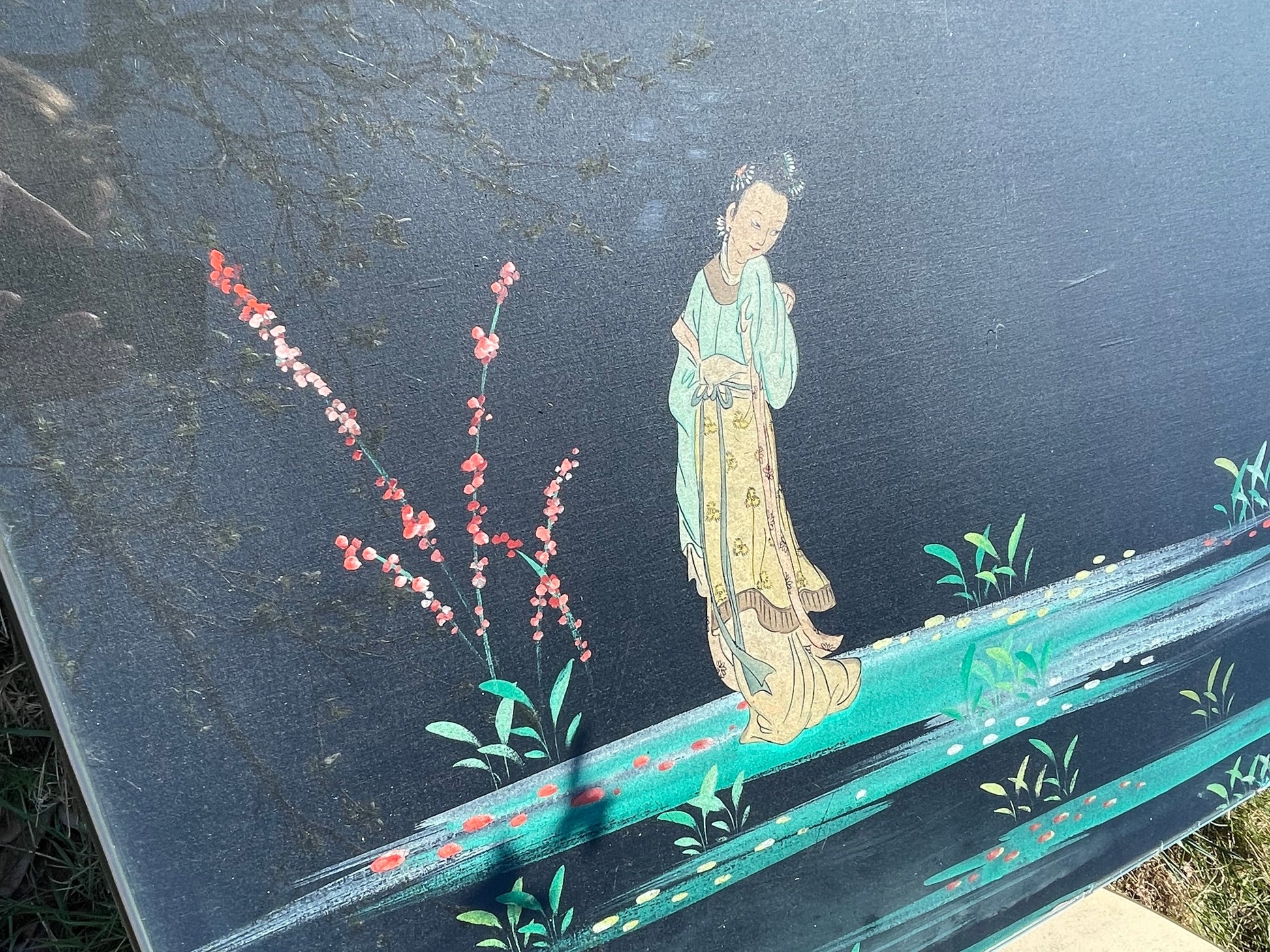 The top is cloth painted with painted chinoiserie figures and foliage detail behind glass.