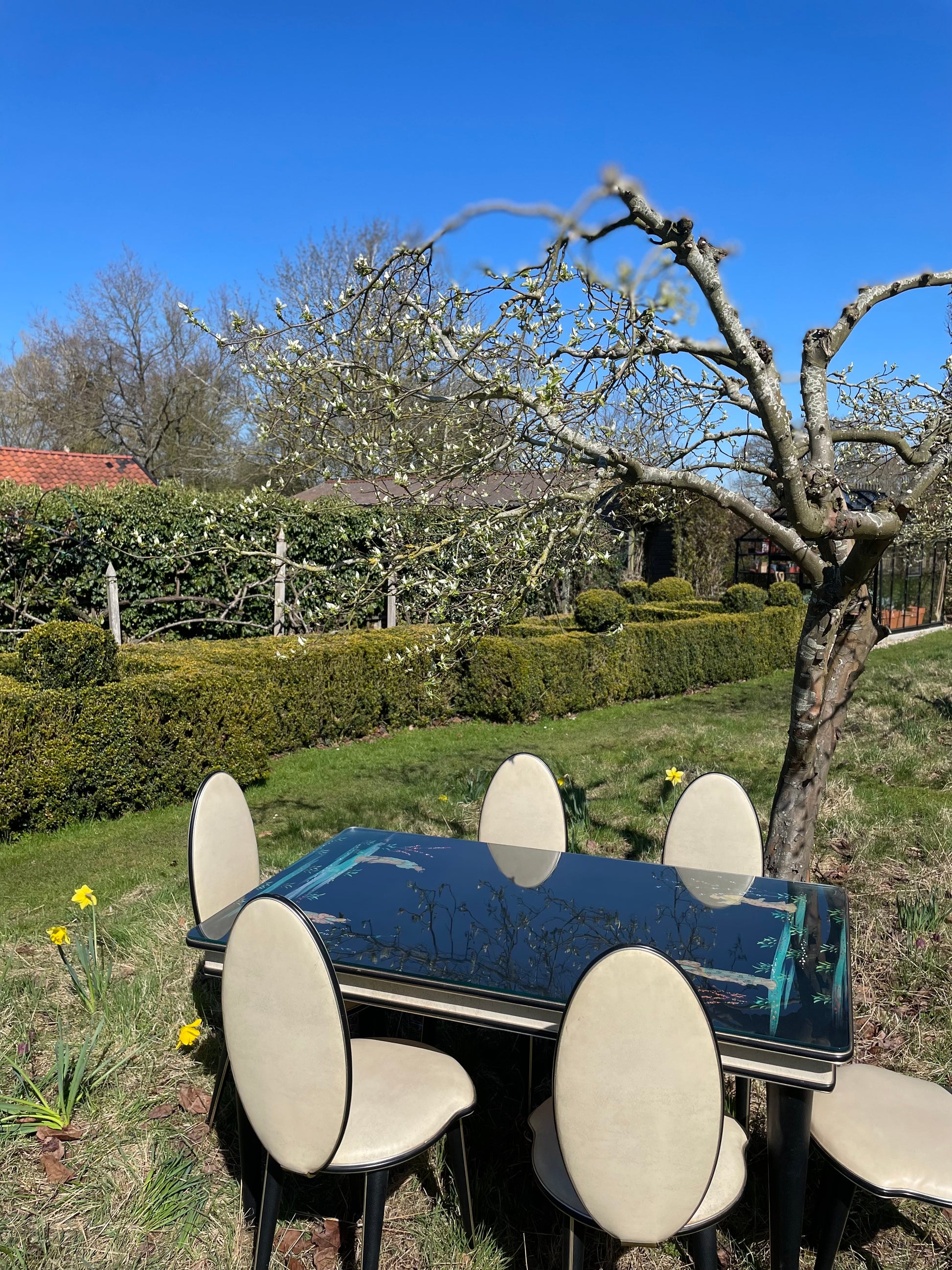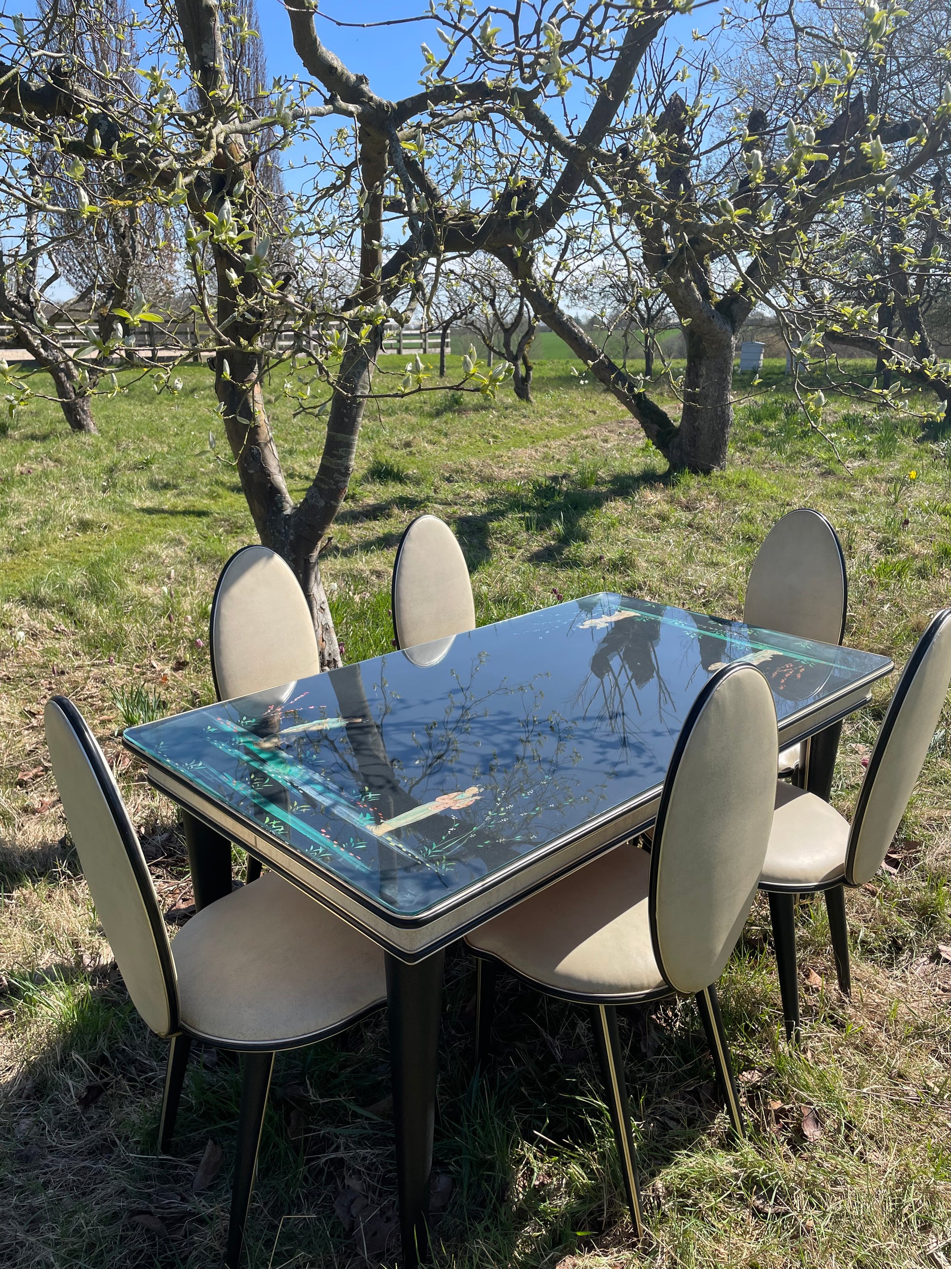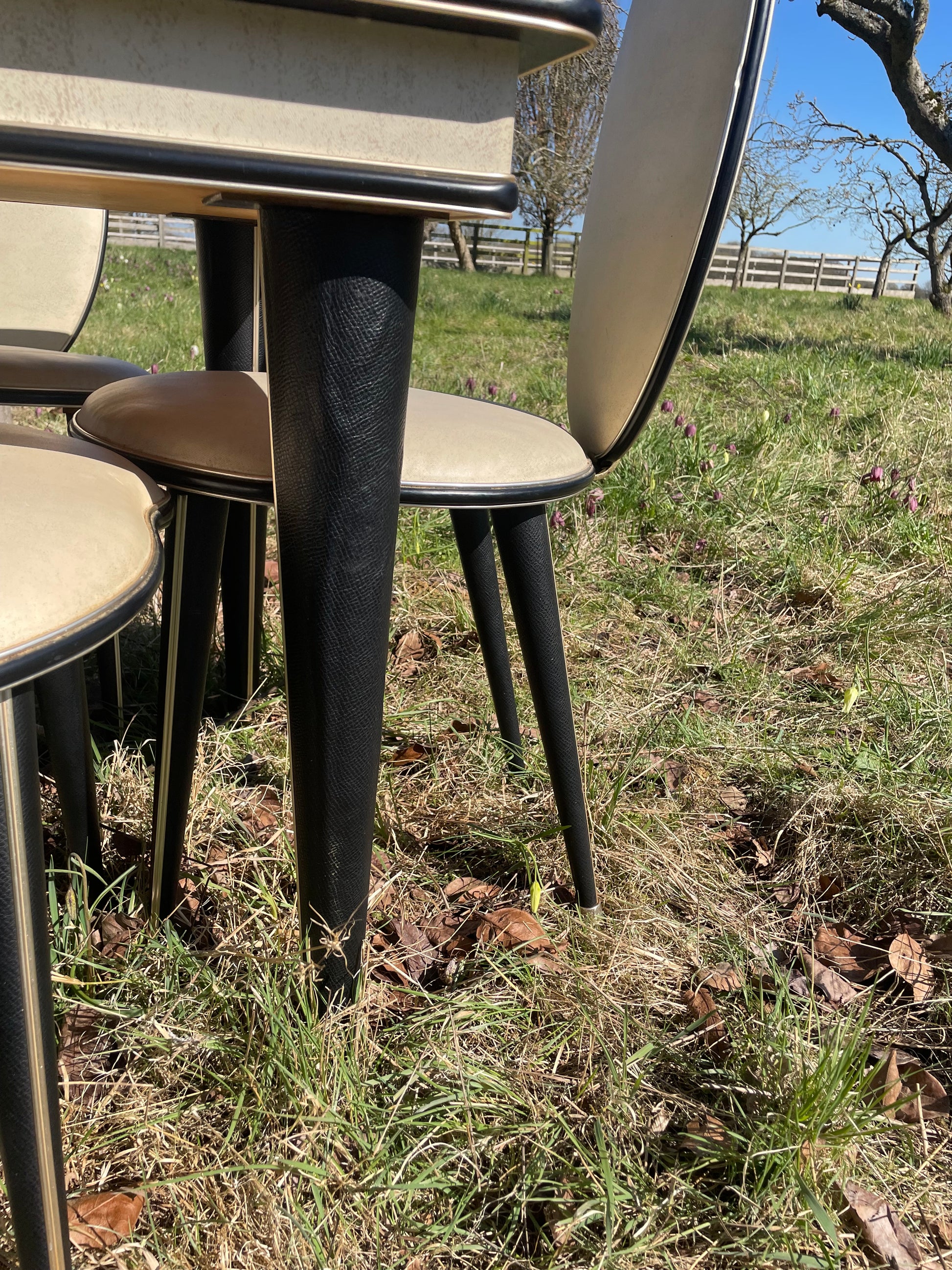 A fabulous chinoiserie dining set by Italian designer Umberto Mascagni. This set was exclusively retailed through the famous department store Harrods of London. The set was designed in 1950s. The table has gold coloured anodized aluminium edging and cream piping. It table stands on tapering legs in faux leather.