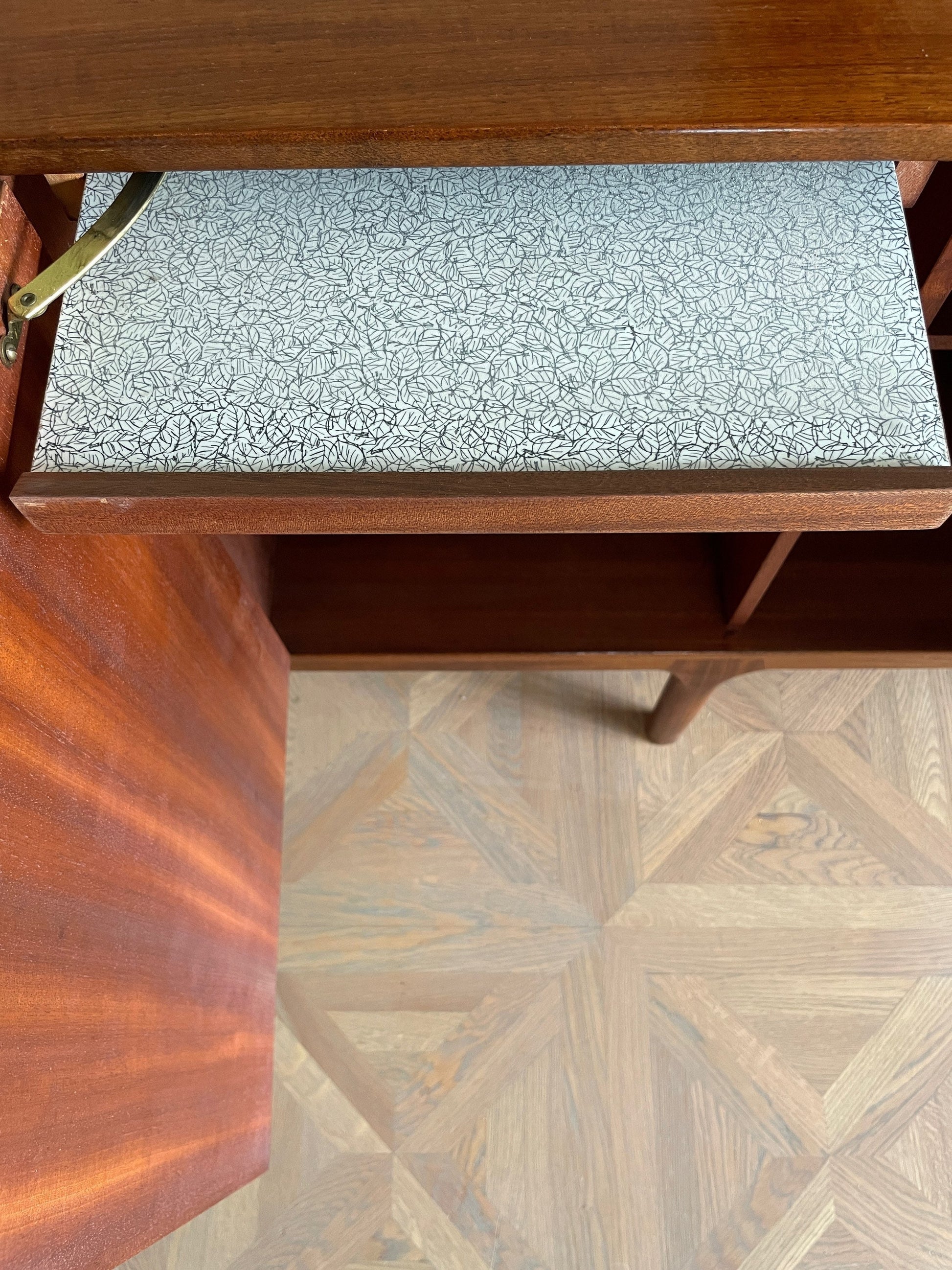 It has a four of drawers in the middle and two cupboards on each side. The right hand cupboard side has a pull-out tray to shape the cocktail storage.