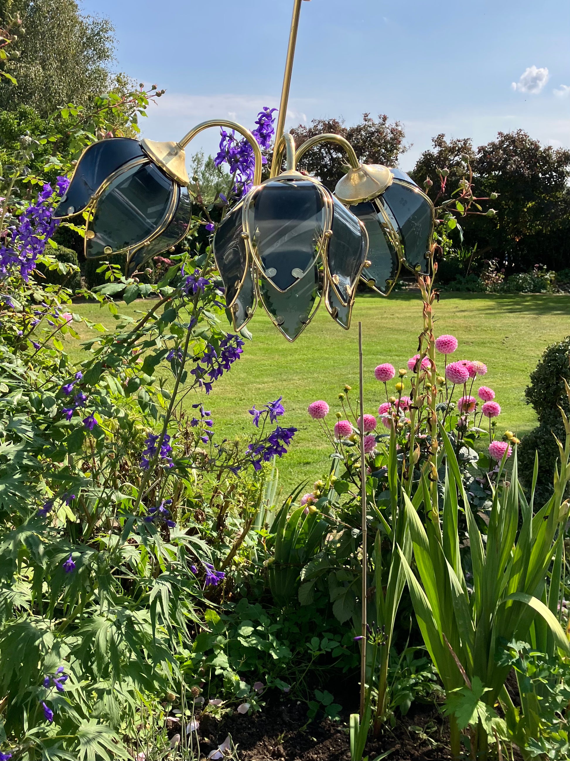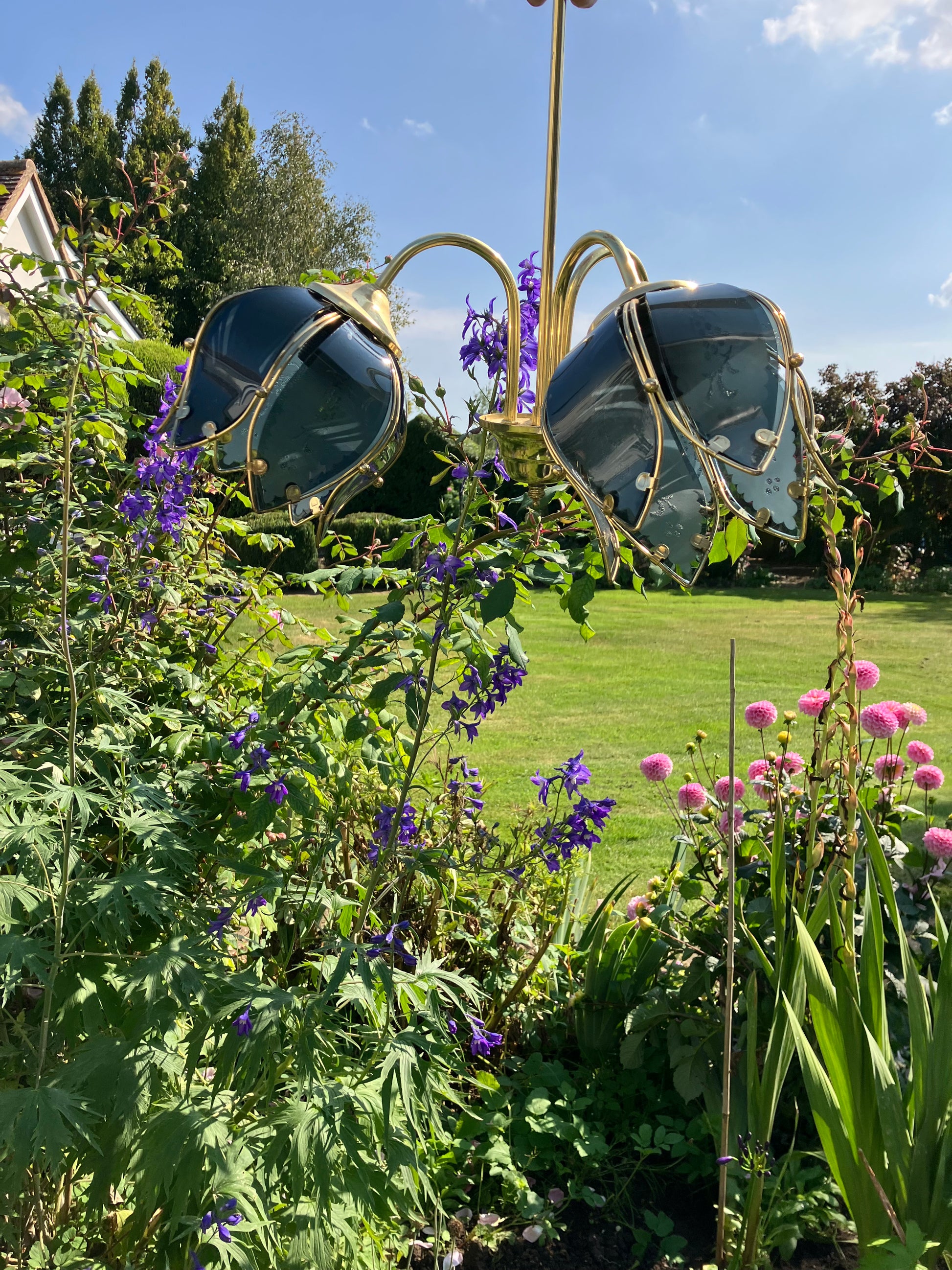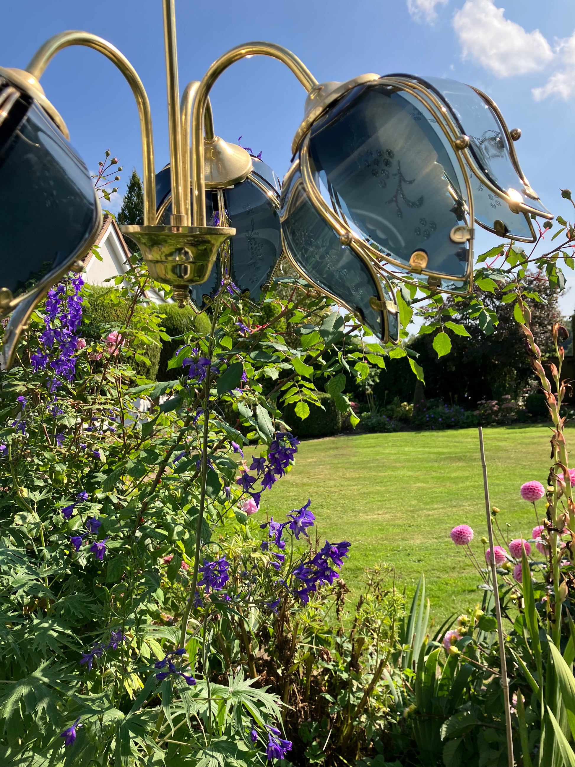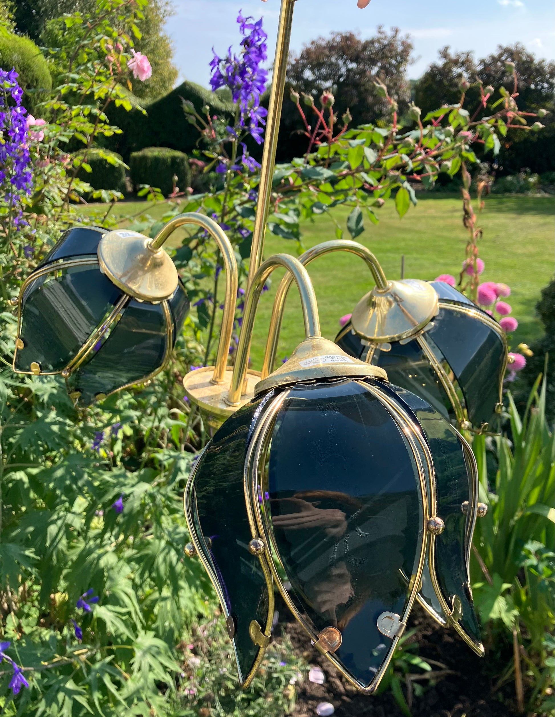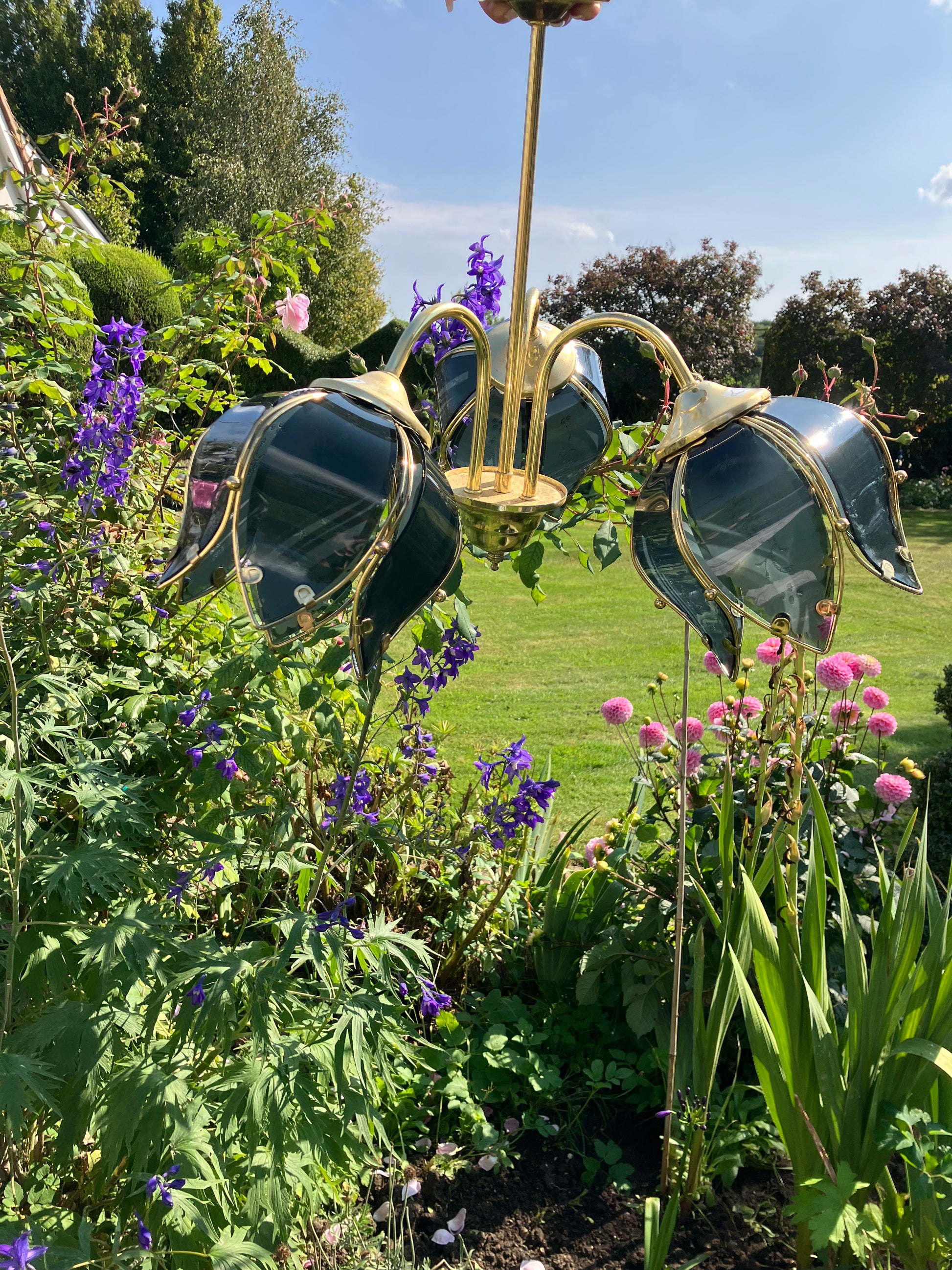 A spectacular Vintage Hollywood Regency Blue Glass Lotus Flower Light with three huge glass flowers.The light makes a beautiful statement both day and night. It is a bouquet of flowers that will bloom 365 day's a year, 24/7.