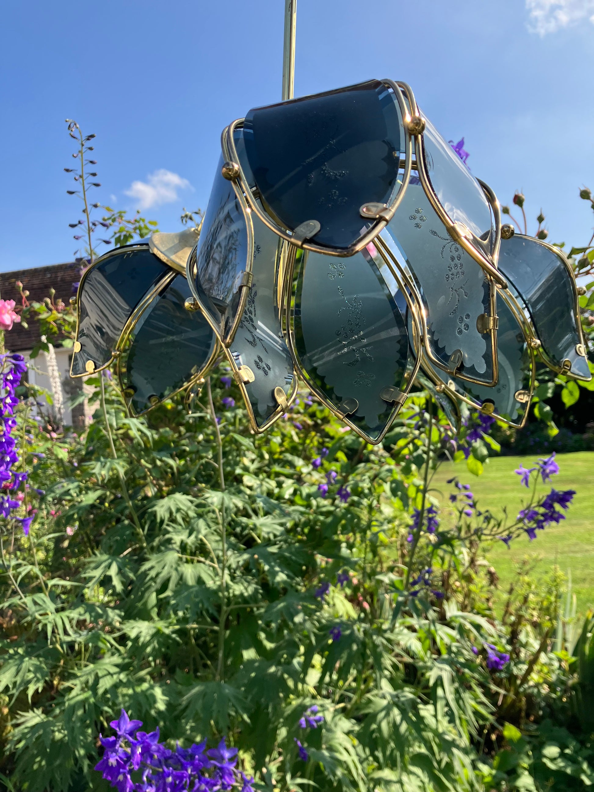 Mid Century Modern Vintage Hollywood Regency Dark Blue Glass Lotus Flower Chandelier