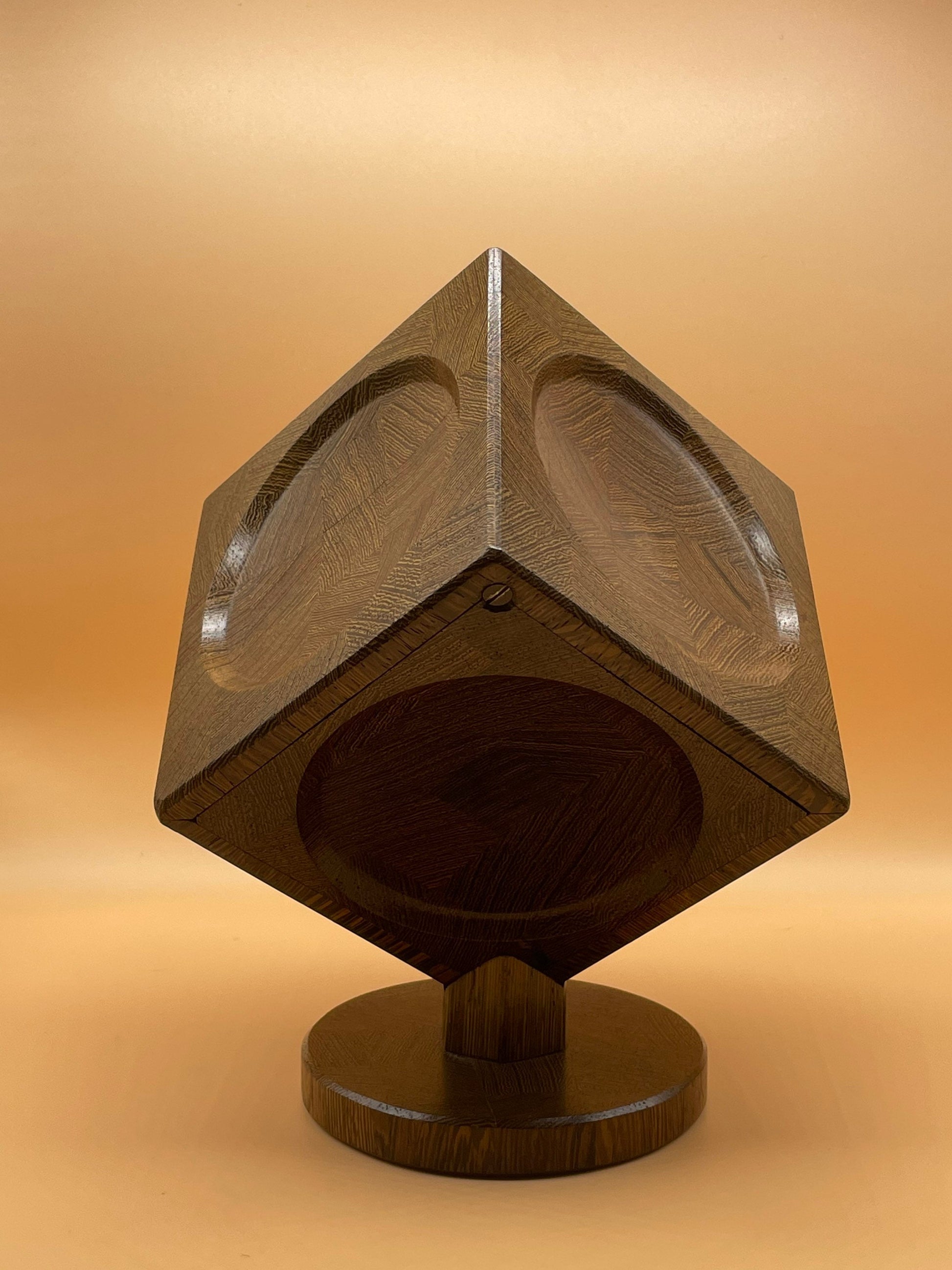 A Danish wenge cube desk clock, 1970s, with brass hands and a dished 'face', raised on an hexagonal plinth on a circular foot, 23cm high
