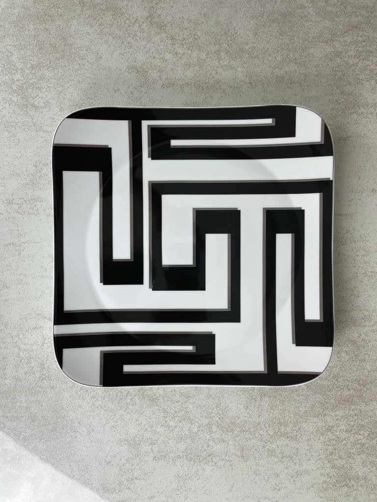 Wonderful Black and White dinner plates / service charger in the Versace 'Dedalo' greek key design. The colour scheme of this collection displays anthracite-platinum on white porcelain, with shiny finishes forming an exquisite constellation that is repeated throughout the entire Dedalo collection. They look wonderful with our Italian dining suite by Umberto Mascagni featured in our shop. They are in used but excellent condition with minor defects. They are originally chargers but would make perfect serving platters / plates.