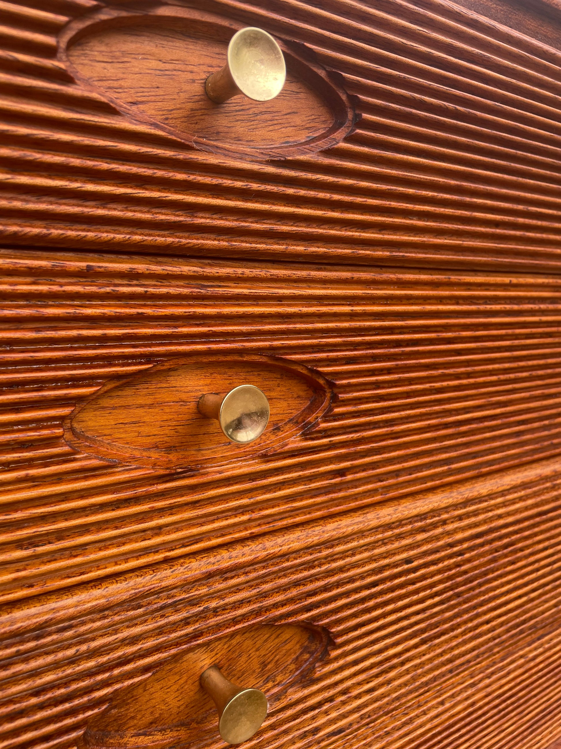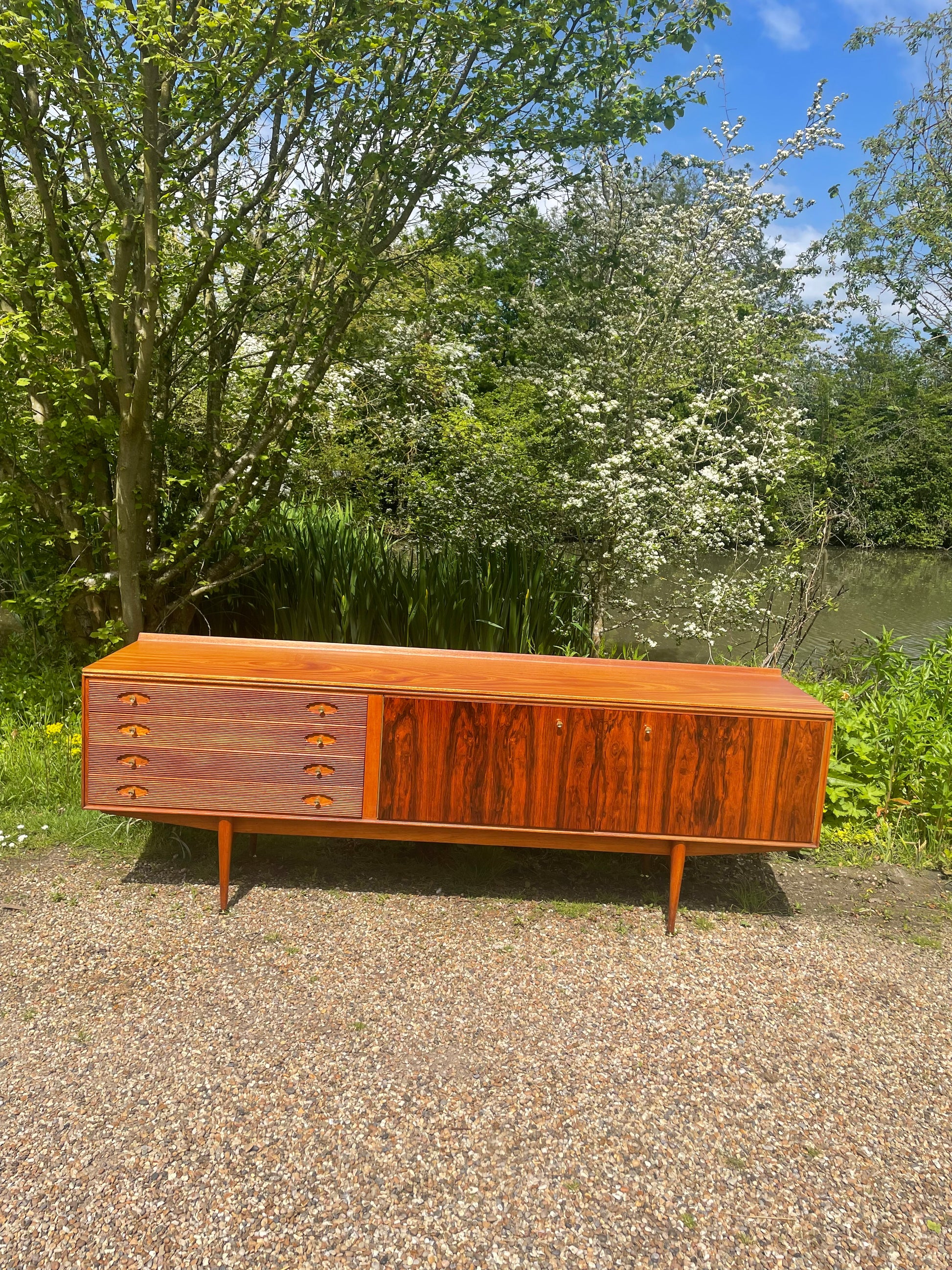 This delightfully original sideboard in Ribbon Figured Sapele & Teak features four drawers with Reeded finish, The top one with original intact green baize lined cutlery inserts, The rosewood double doors open out to reveal 2 large, 2 tiered shaped shelved cupboards with a vast storage space.