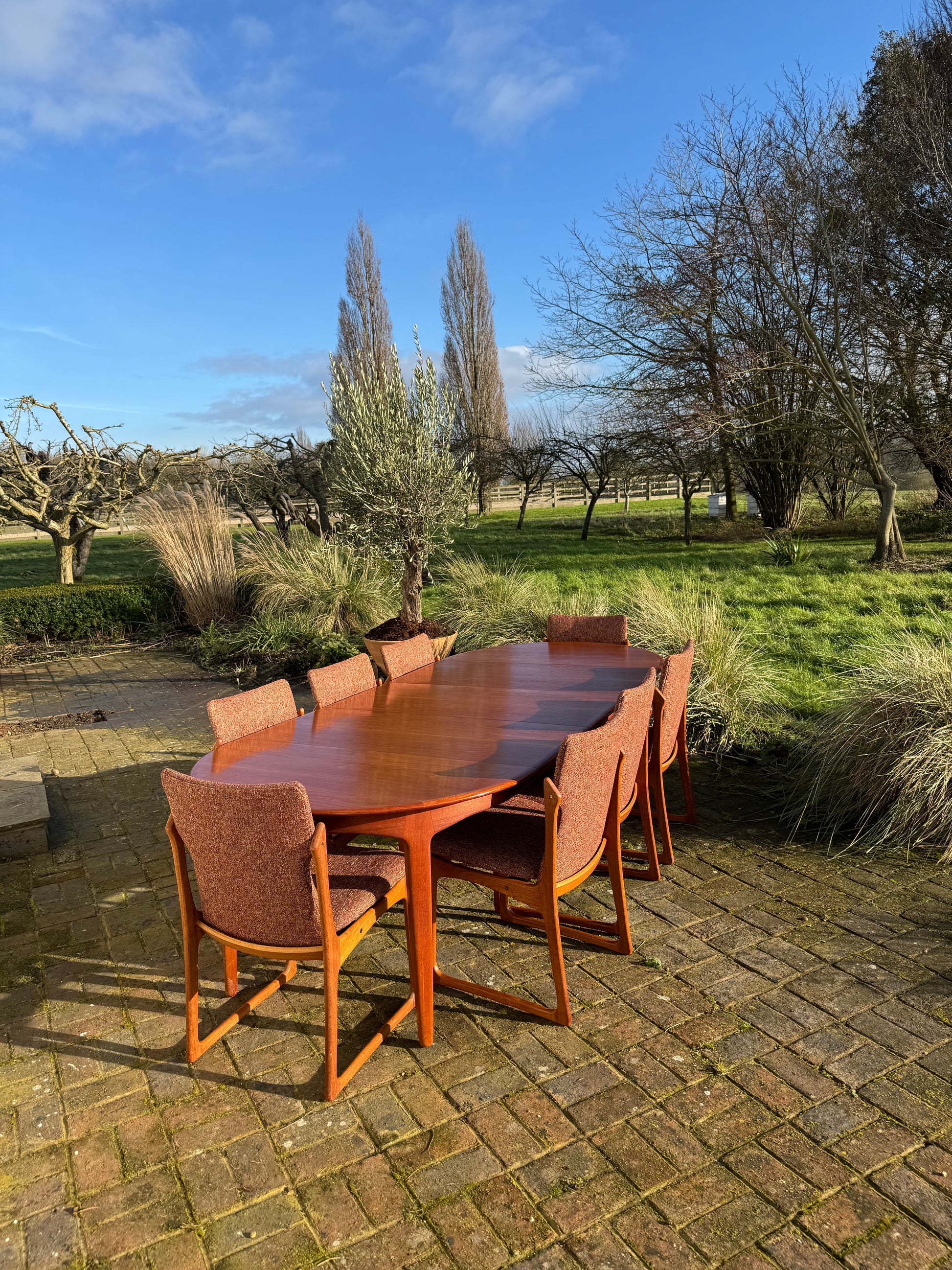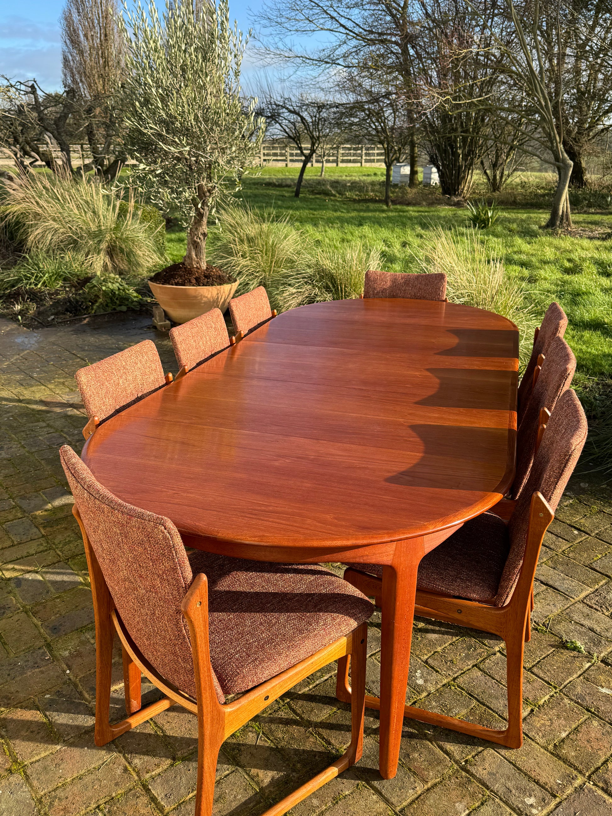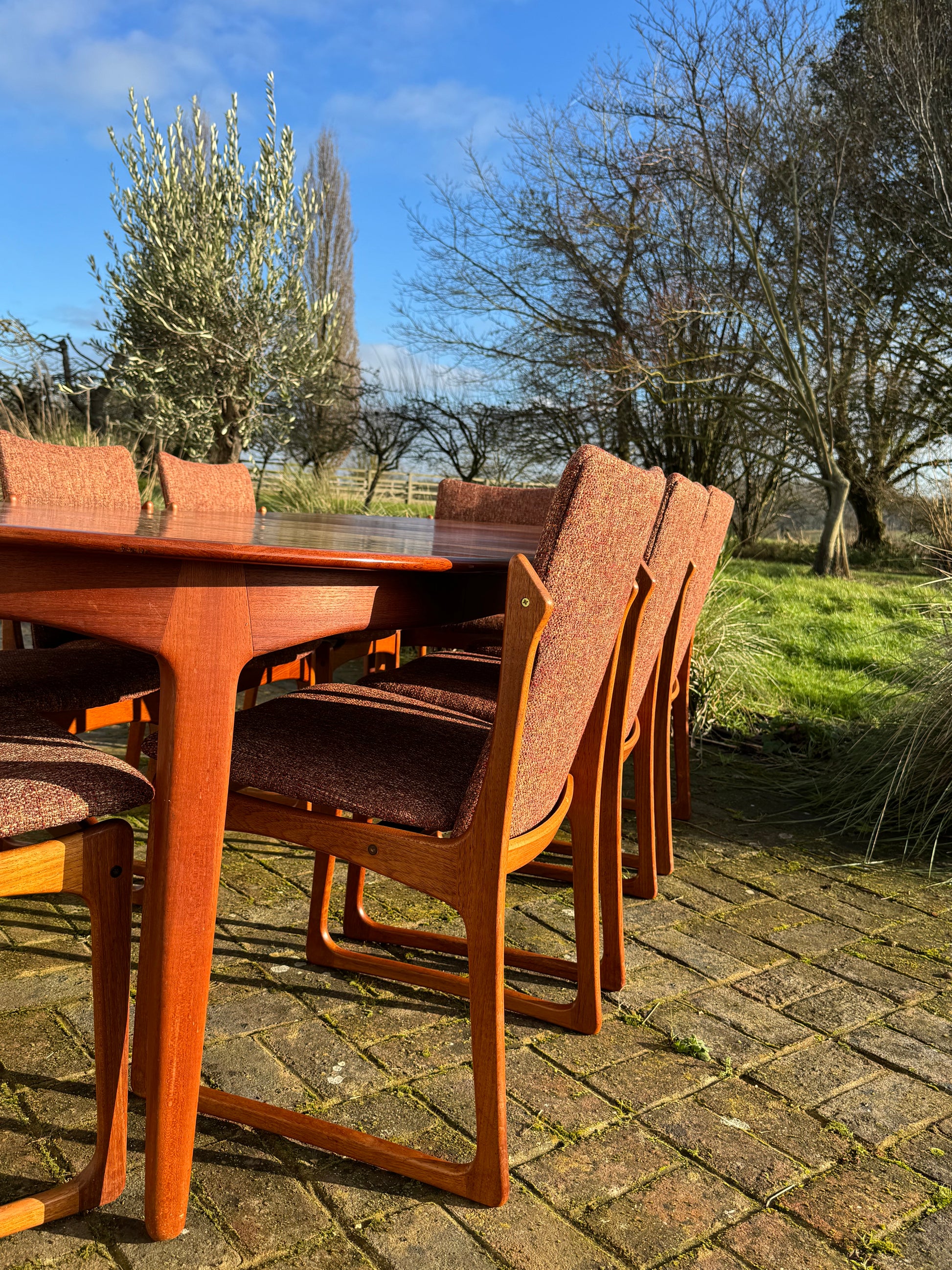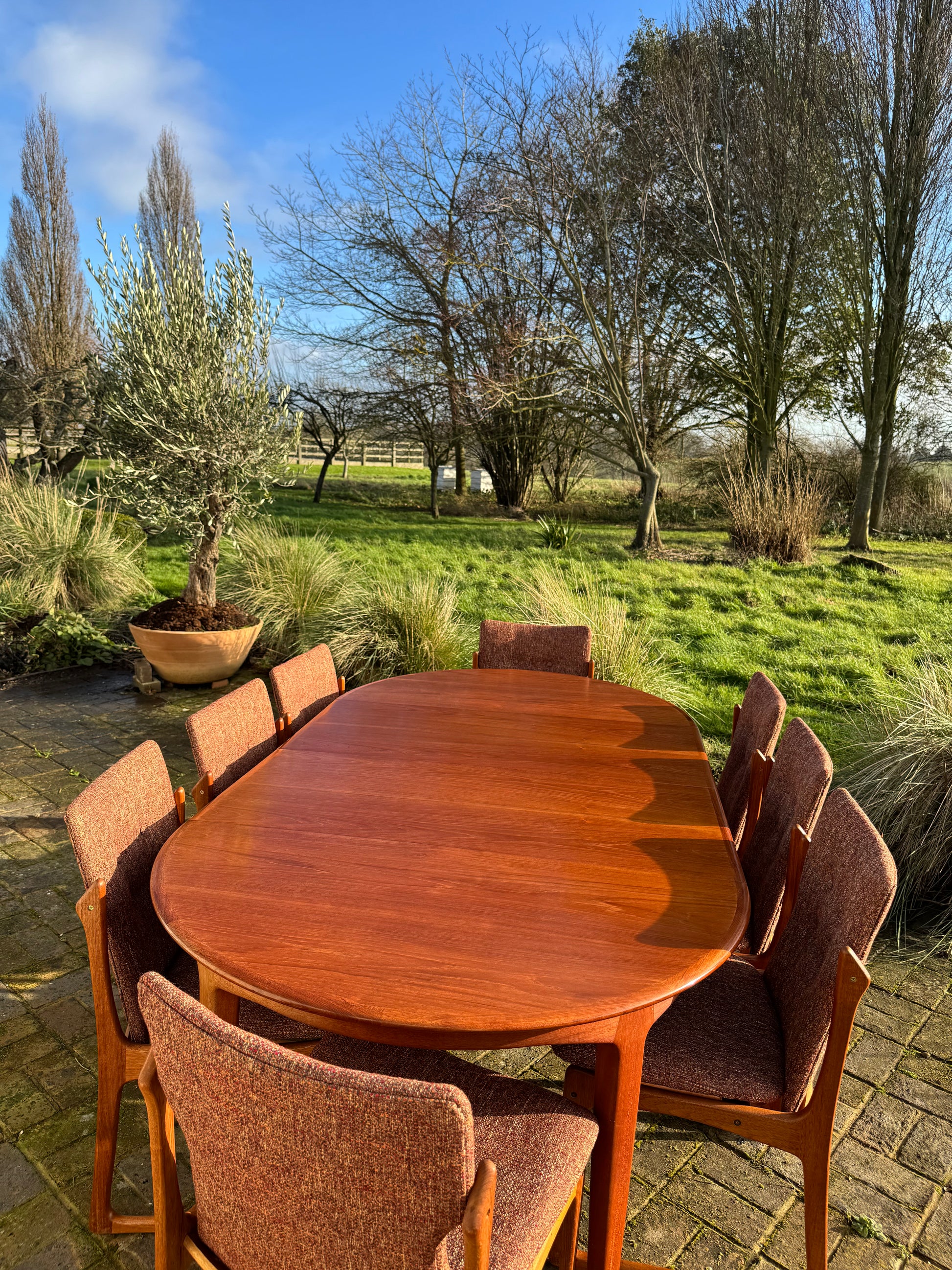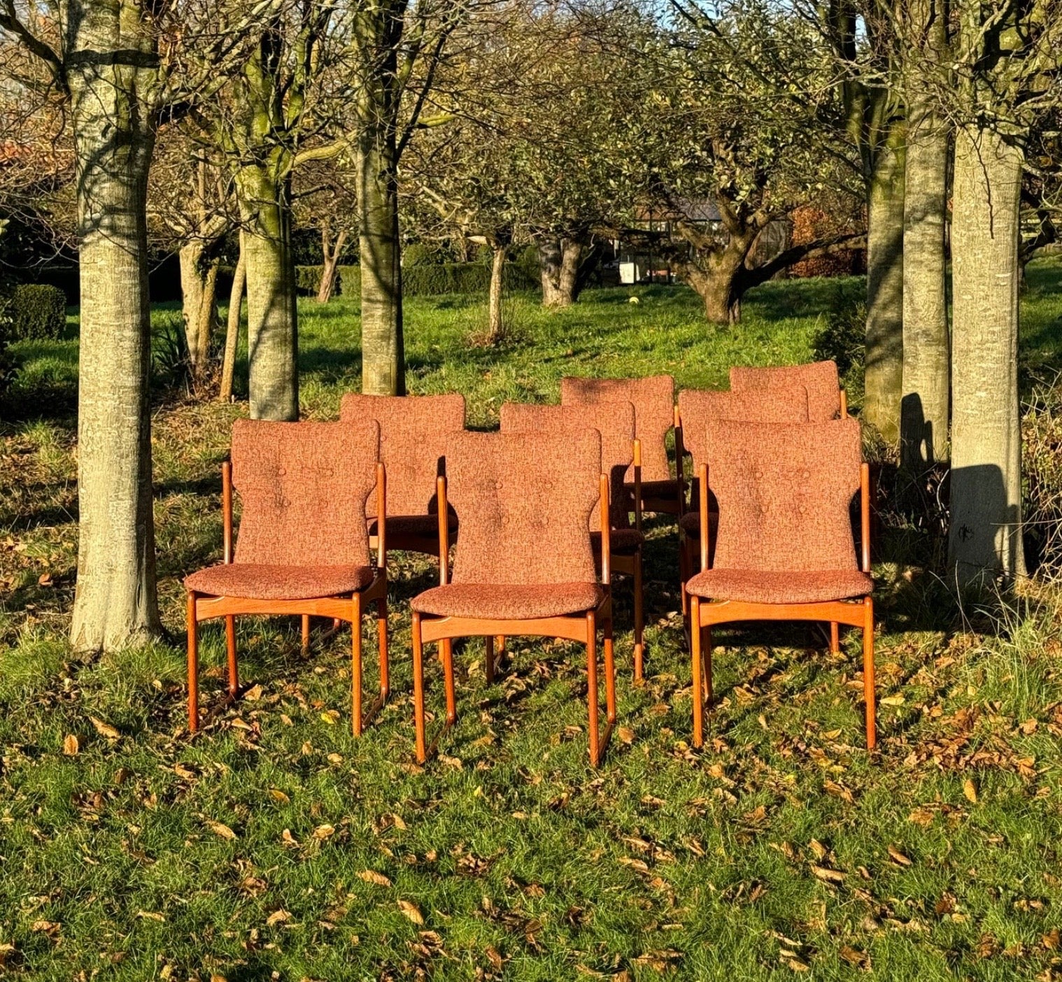 Beautiful set of eight Scandinavian Modern Vamdrup Stolefabrik. These fabulous chairs have had a full revamp. Teak frames fully refinished. All new foam and buttons. And finally professionally reupholstered in hard wearing luxuries tweed fabric in rich warm tones.