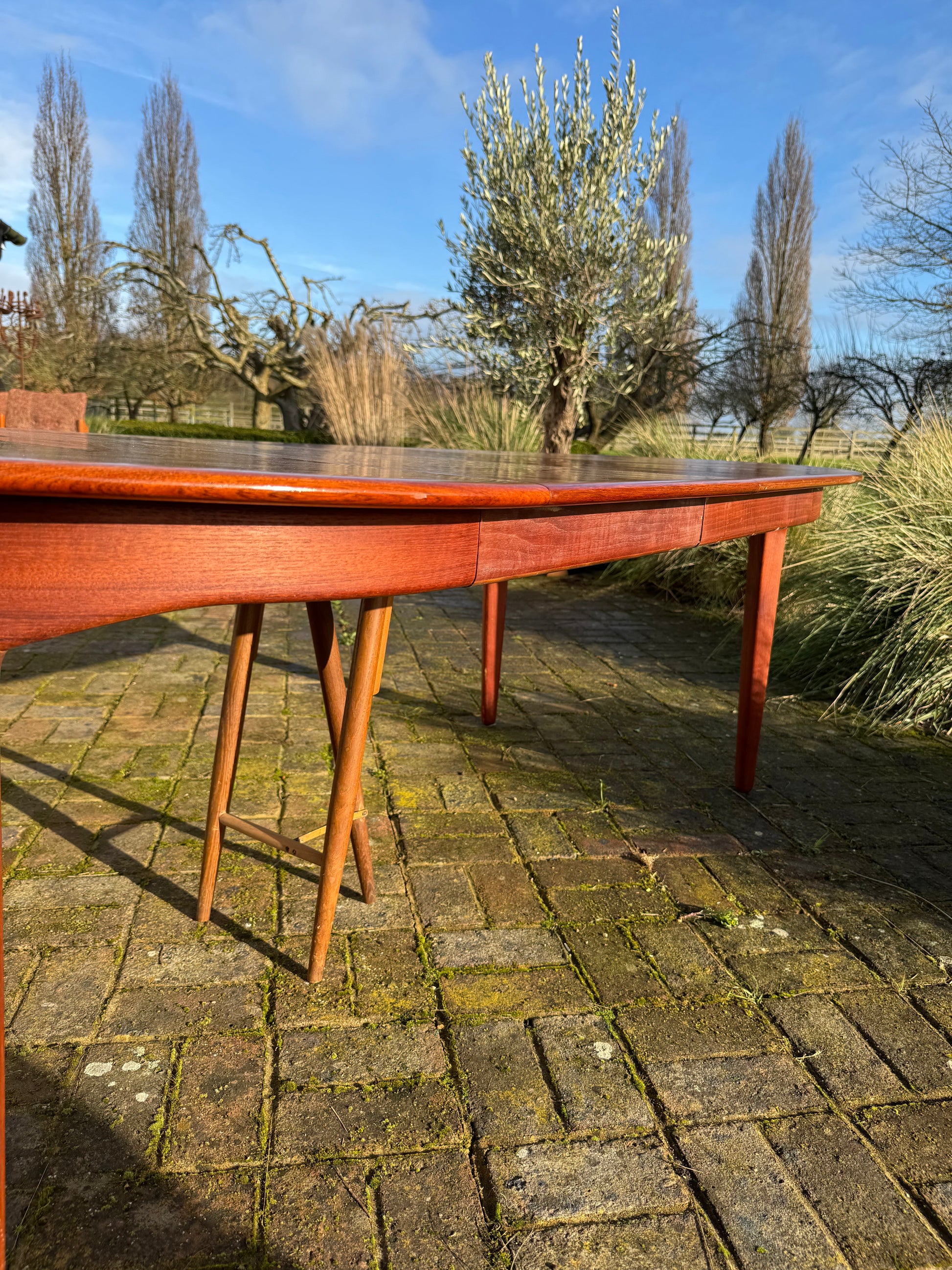 This large extendable "model 32" dining table was designed by Henning Kjærnulf and produced by Sorø Stolefabrik in Denmark in 1958. Made from teak, the table comes with three original leaves, that's extends table from 125cm to a maximum of 275cm. It is a beautiful example of Scandinavian craftsmanship, which looks wonderful both in its extended and original form. The three extra leaves can be used for as many or as little guests as desired and due to their size, are easy to store away.