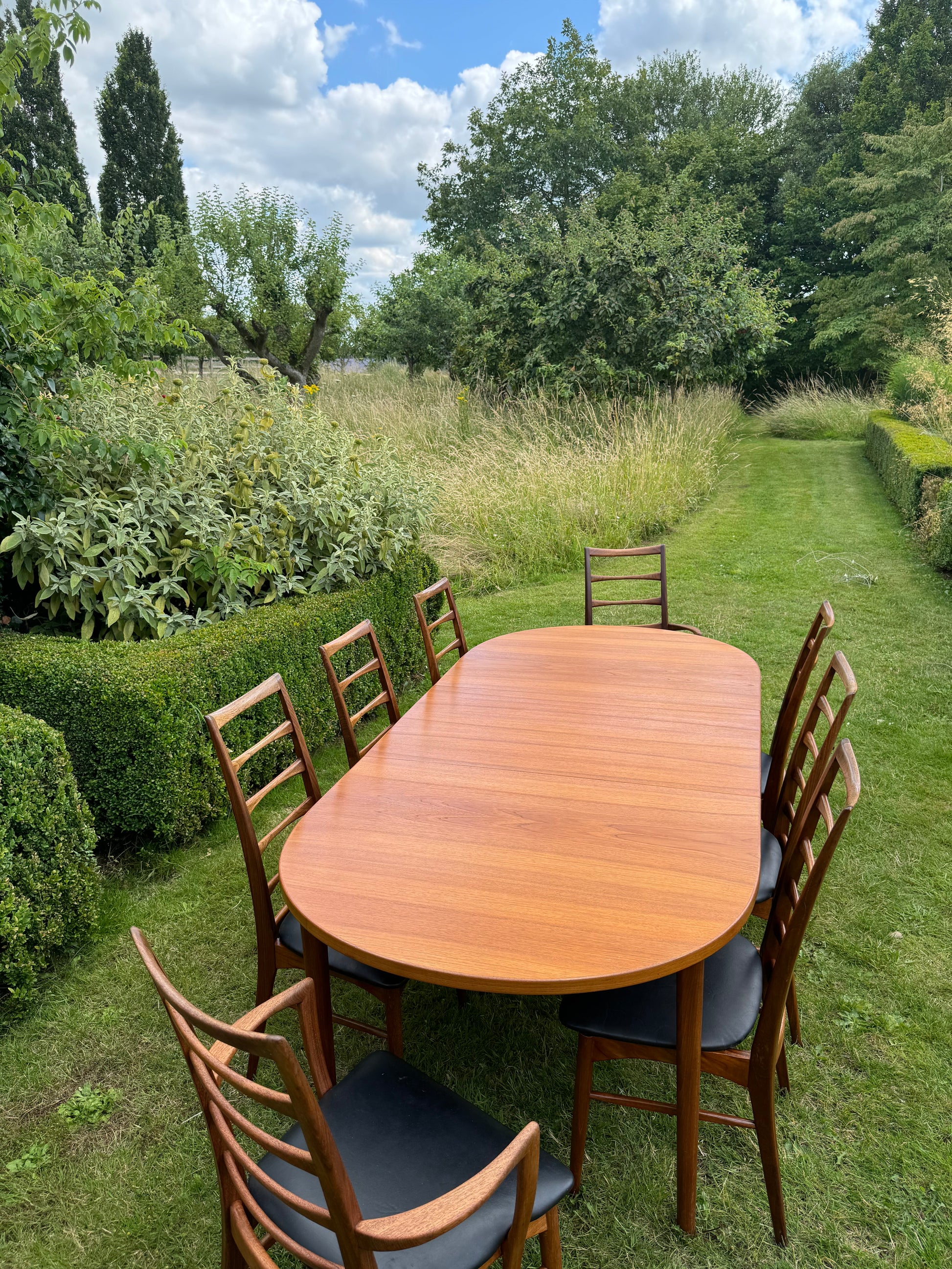 Mid Century Modern Extending Teak Table by Nils Jonsson for Hugo Troeds with 8 'Lis' Chairs by Niels Koeofoed for Mobelfabrik Dining Set