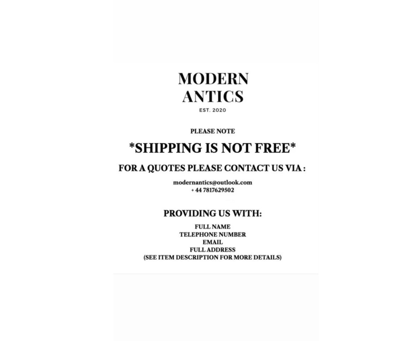 As we specialise in bespoke, one-off pieces, at Modern Antics, not one of our item’s shares the same dimensions as another. This makes it impossible for us to standardise our shipping rates, but is also another reason why every of our items is so special.