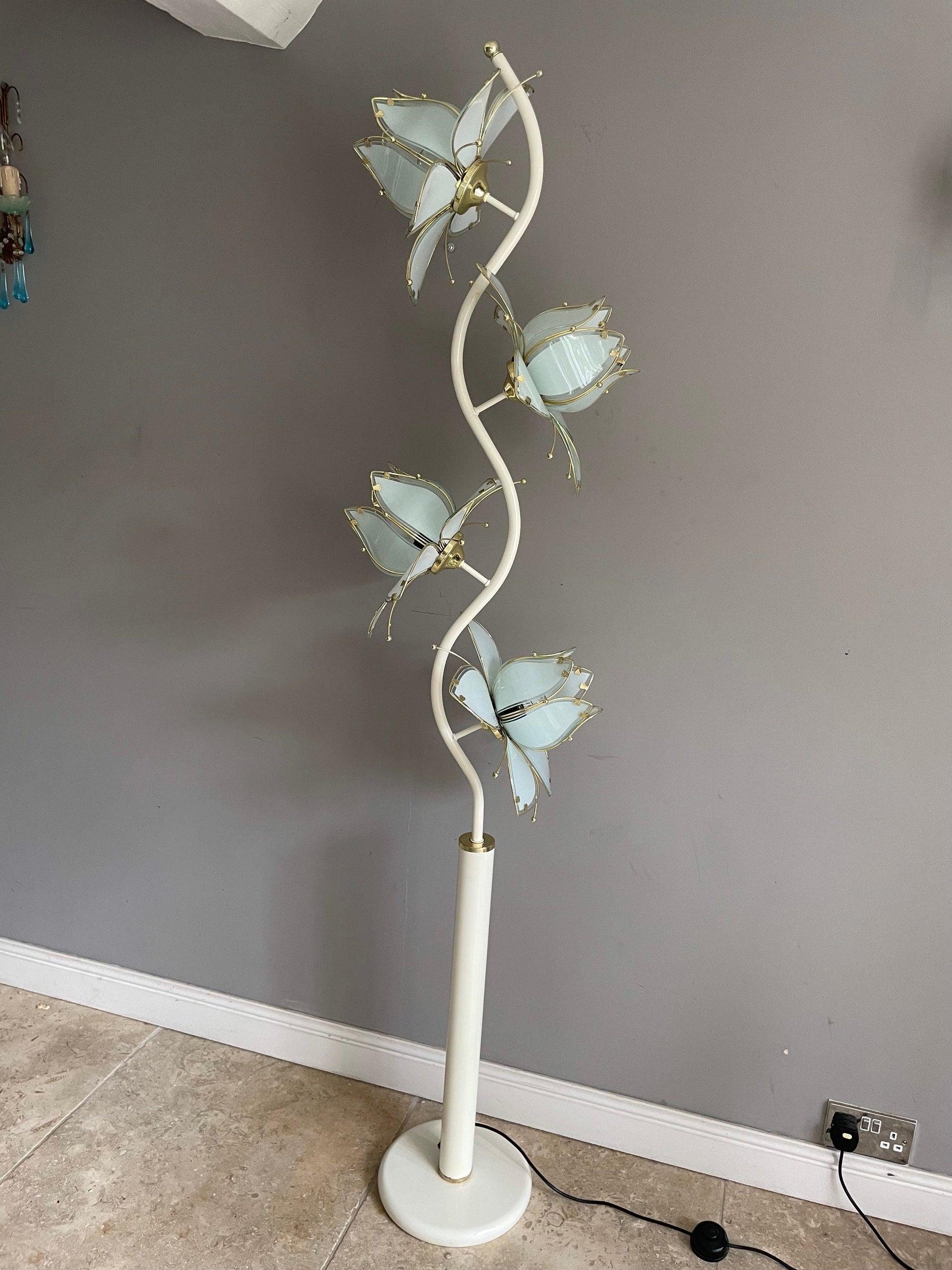 This huge white floor lamp boasts four huge white flowers. It is a towering masterpiece. A real statement piece. Being white it has a lovely fresh modern feel. It would be just at home in an Uber modern setting as a traditional one. The flowers are huge a whopping 38cm. It boasts a floor button switch and is present in very good vintage condition with a small amount of pitting on the metal work.