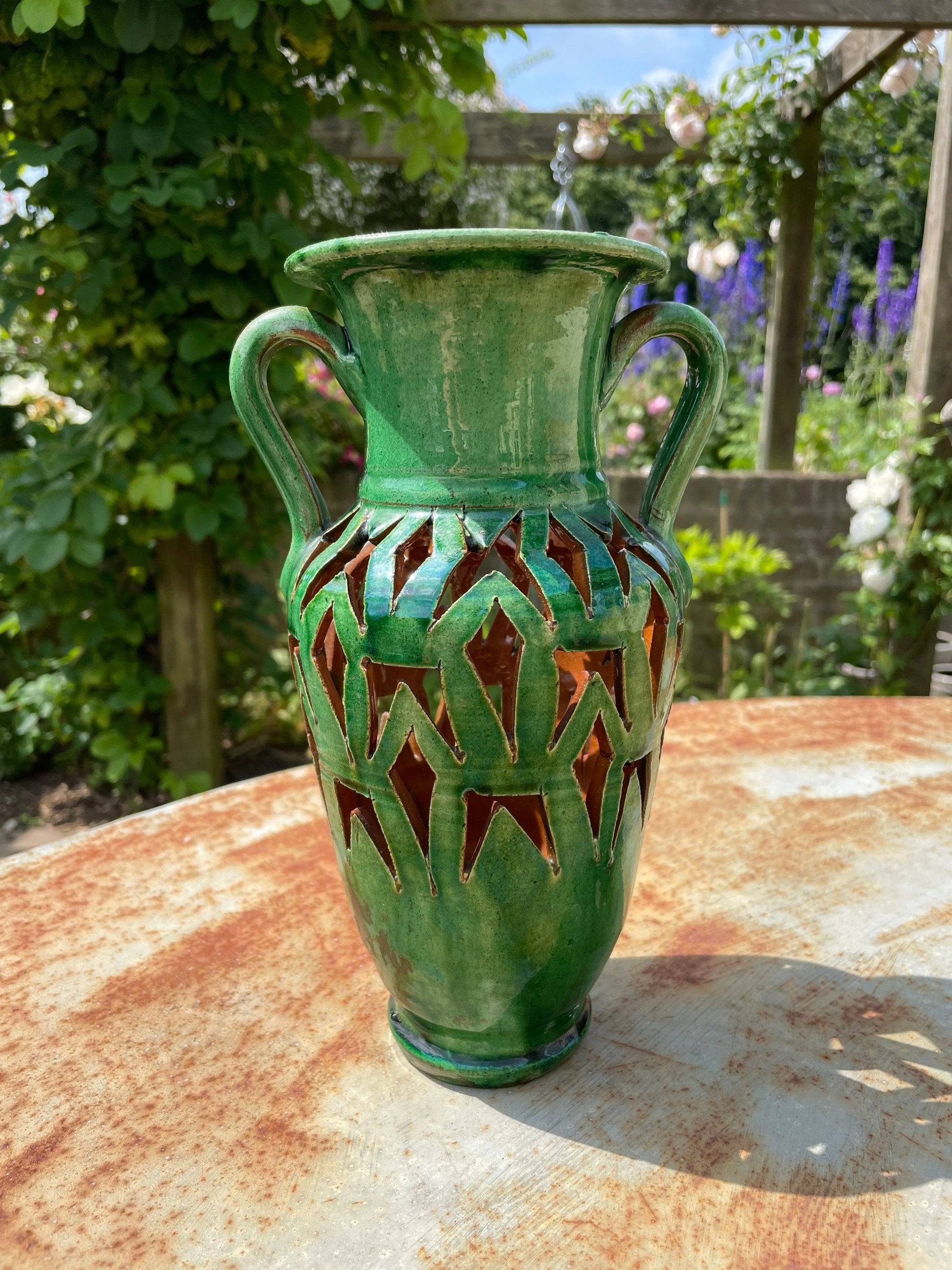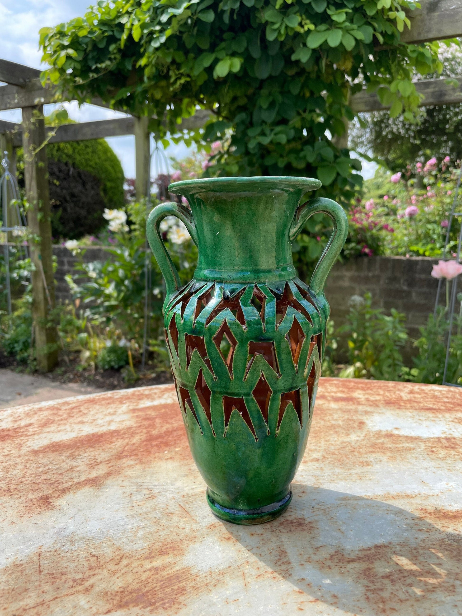 Wonderful little decorative green urn/vase. In great condition and would look very pretty in any setting this Christmas. Also would make a wonderful Christmas gift for someone.