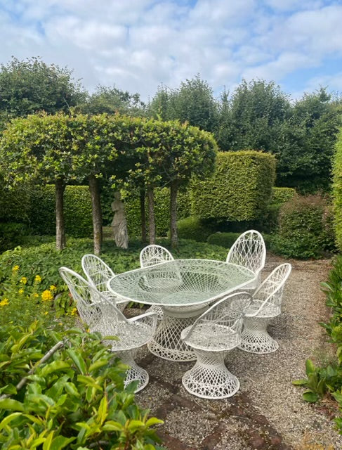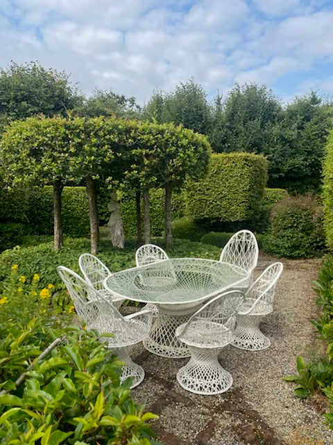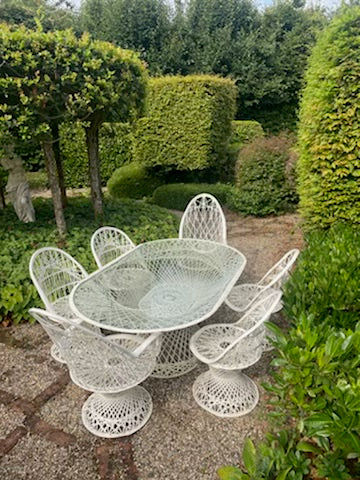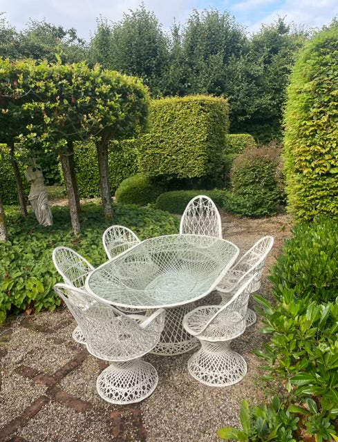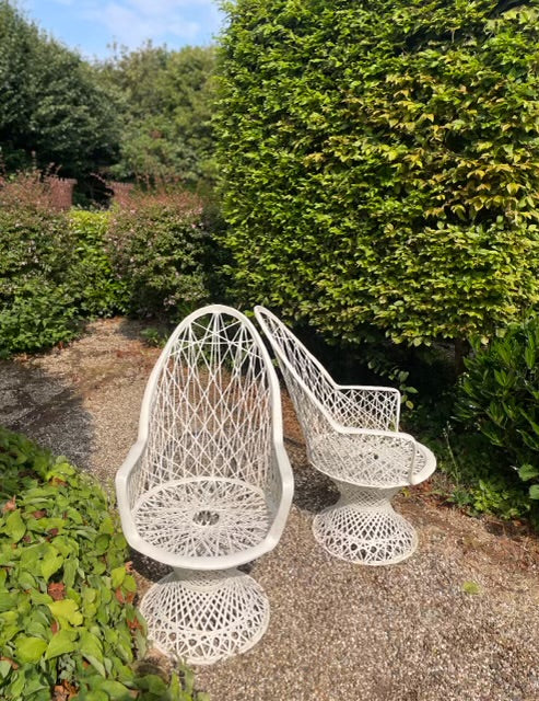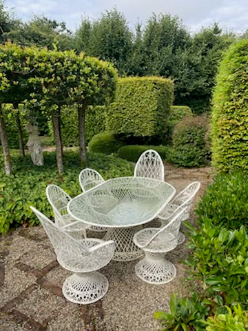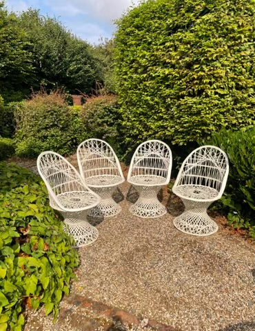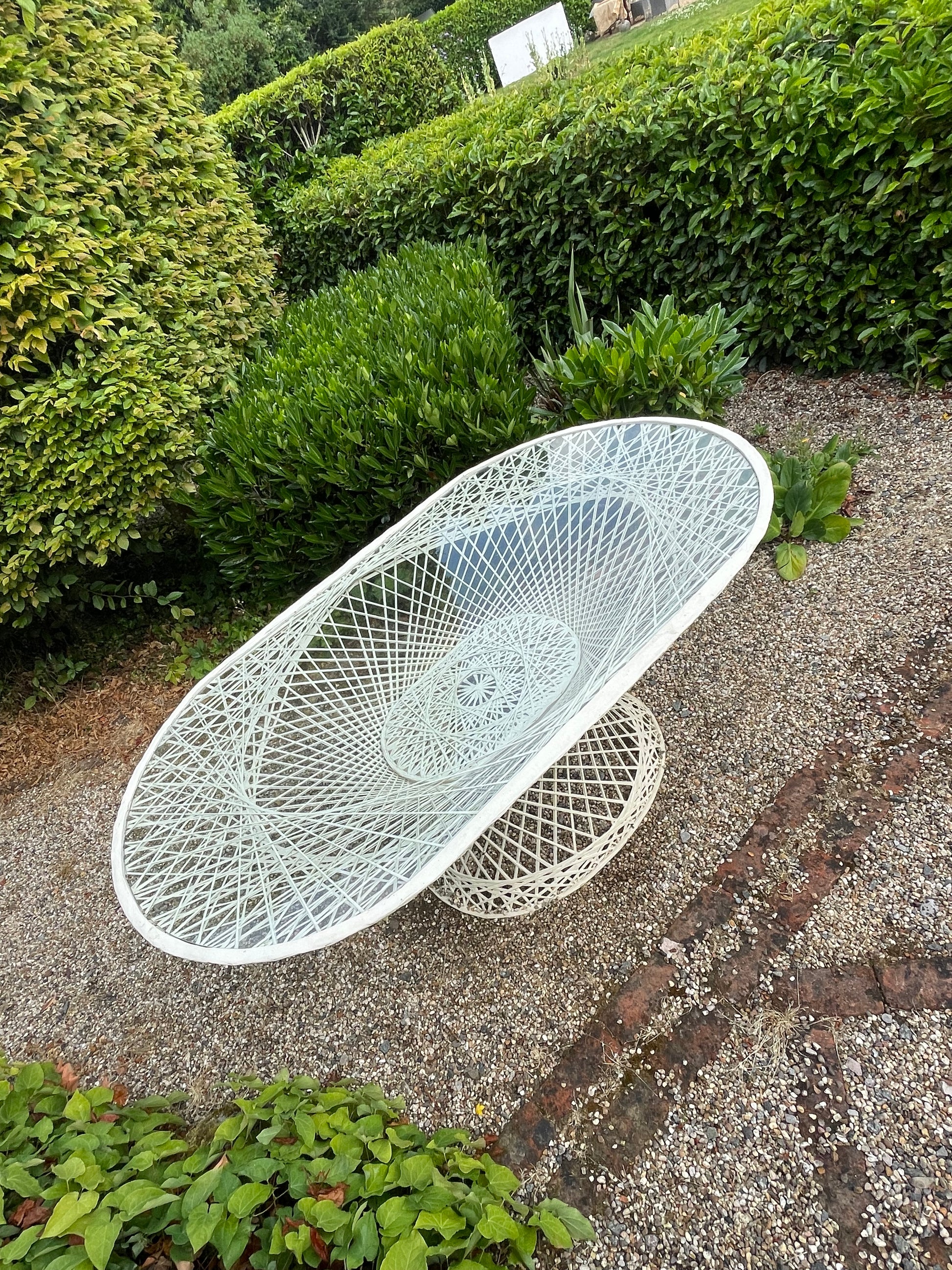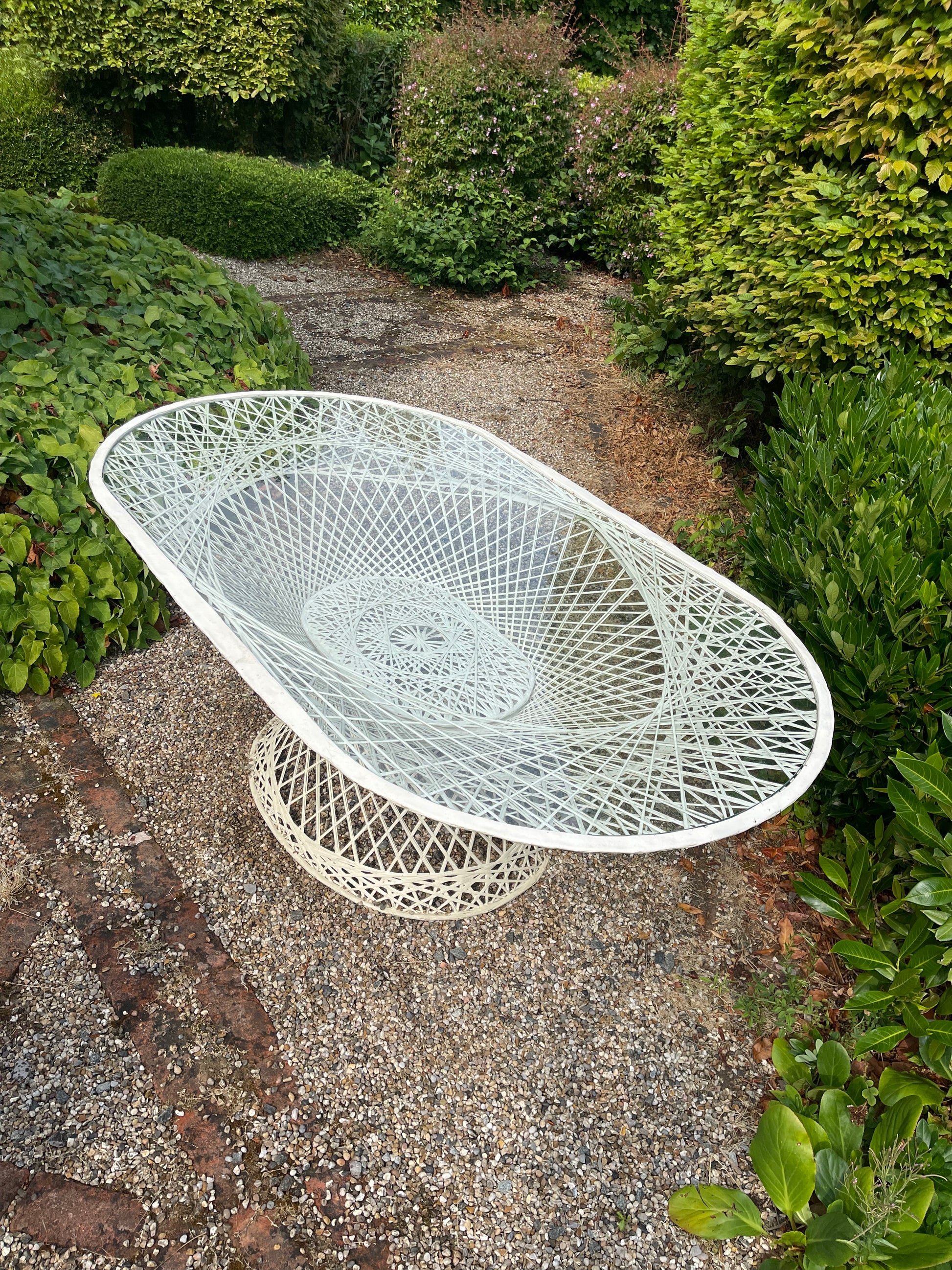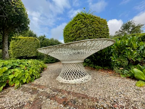 Mid Century spun fibreglass rattan white patio set by Russell Woodard. A timeless and unique set for that trendy patio. Can be used indoors or outdoors.