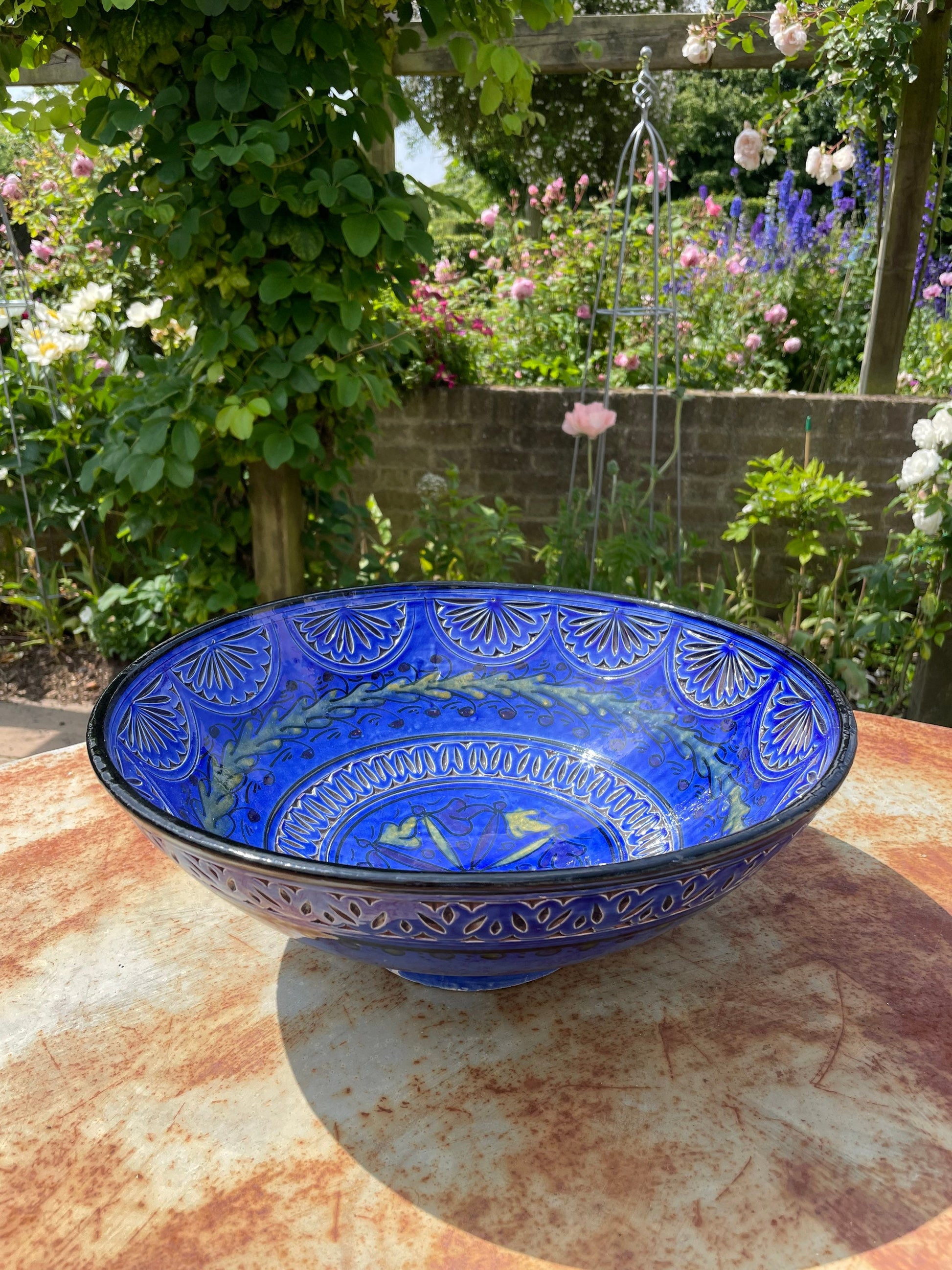 Beautiful and vibrantly coloured large blue decorative bowl. It would look wonderful as a centrepiece on a table but also has some small holes in the back, should you wish to hang it on the wall.