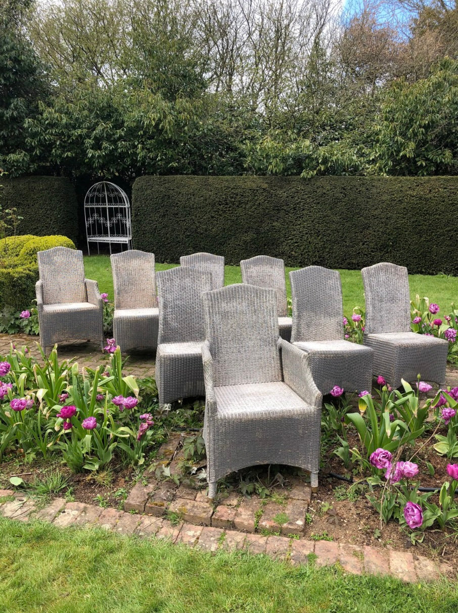 Set of eight fabulous century modern indoor/outdoor dining chairs by Vincent Sheppard for Lloyd loom.