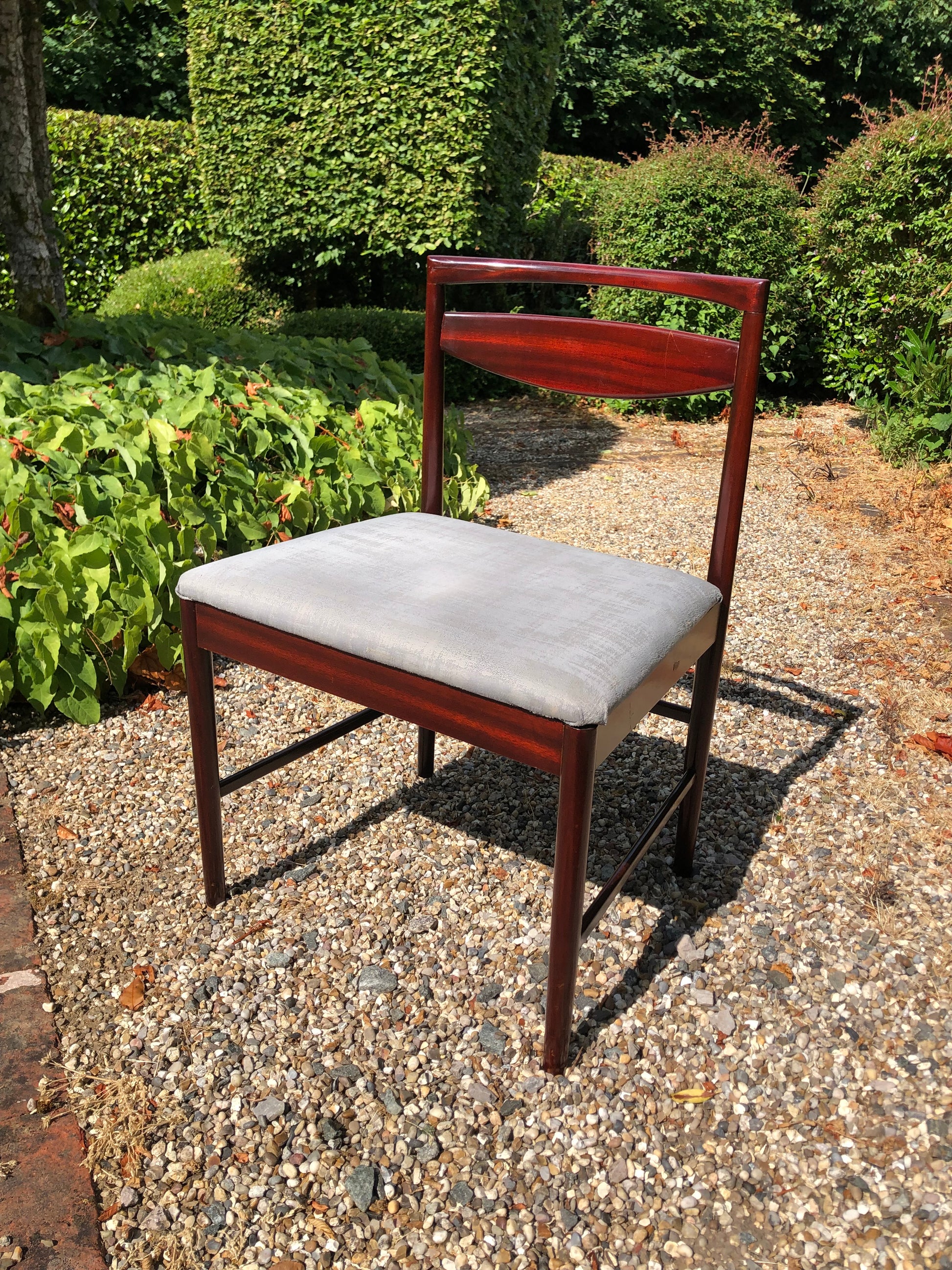 Mid-century dining chairs were designed by Tom Robertson for McIntosh in the seventies. The chairs have a minimalist Japanese-style frame with organic rounded edges. The chairs have stylish design, with a bowed back rest and the seat cushions covered in a blue/grey velvet.