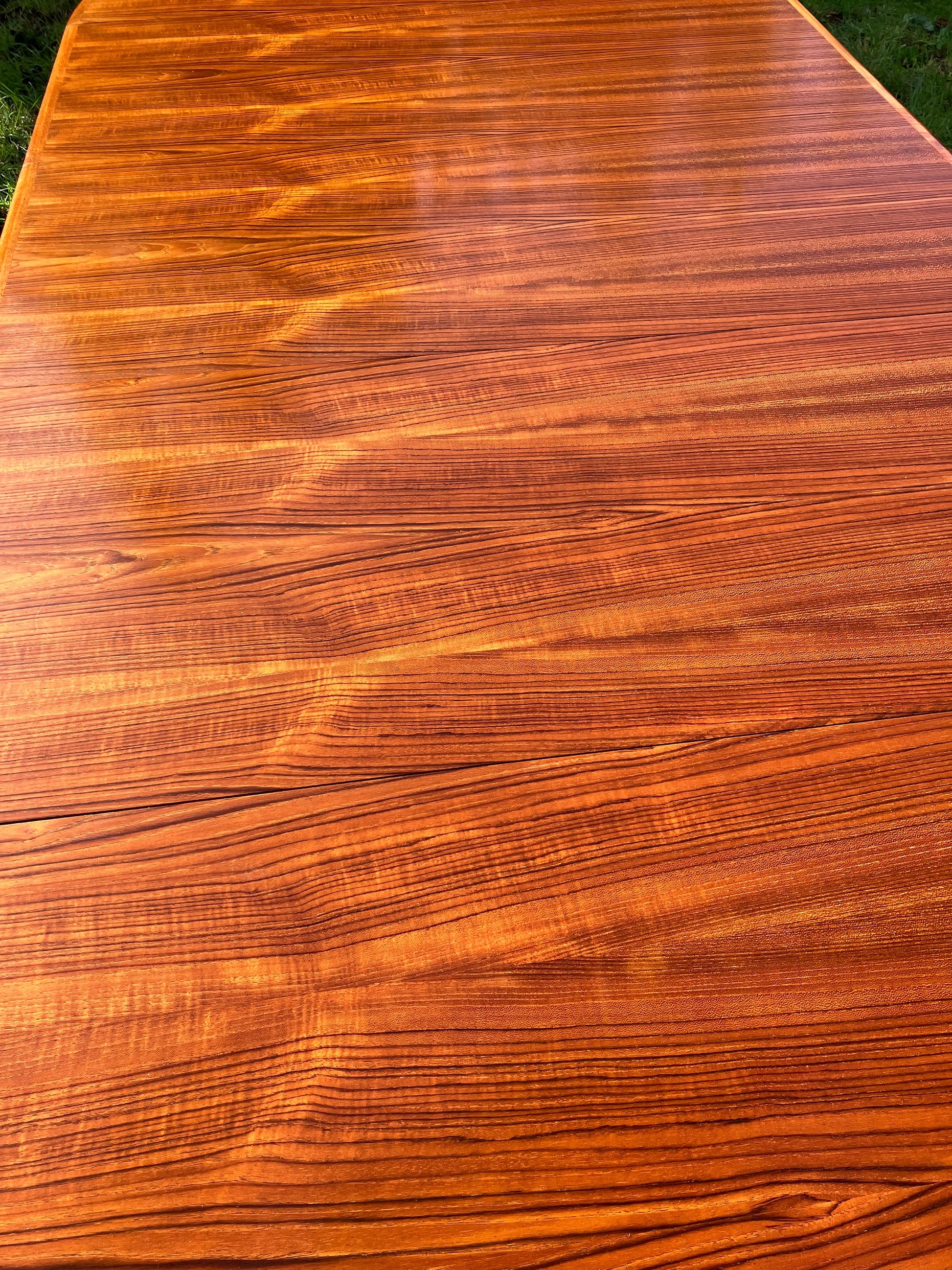 This table is fully restored. All the panels match. It is by far the most beautiful of these tables we have had the privilege to restore. The wood grain is exceptional.