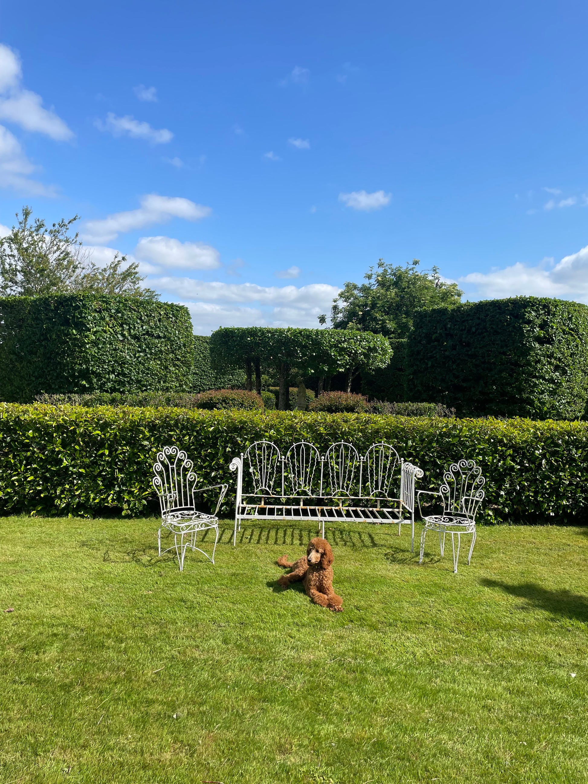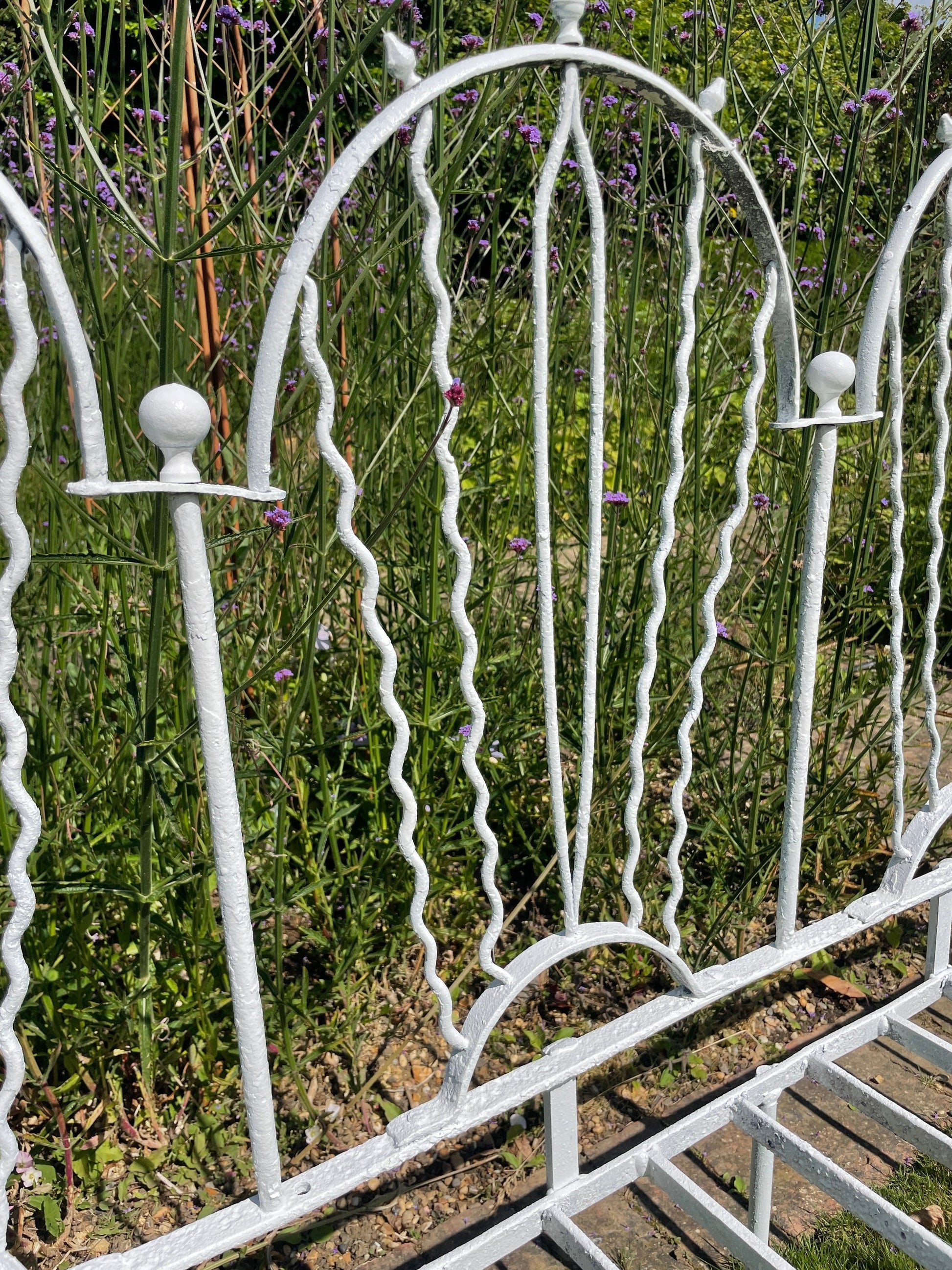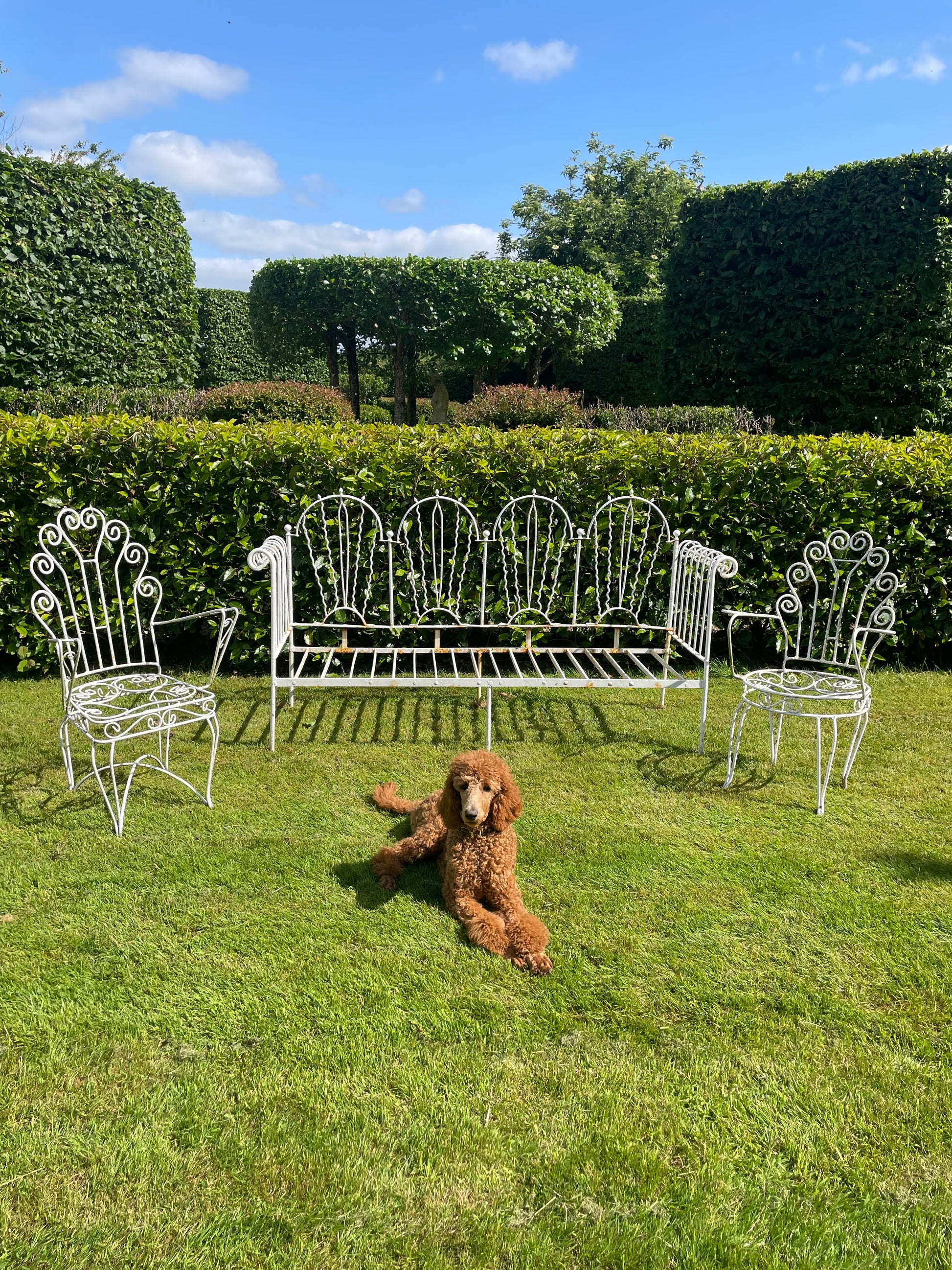 A great set of garden seating comprising of a pair of wrought iron arm chairs and a substantial outdoor sofa. The sofas design is quirky and unique. The chairs are a very pretty pair, with very slight differences in their design.