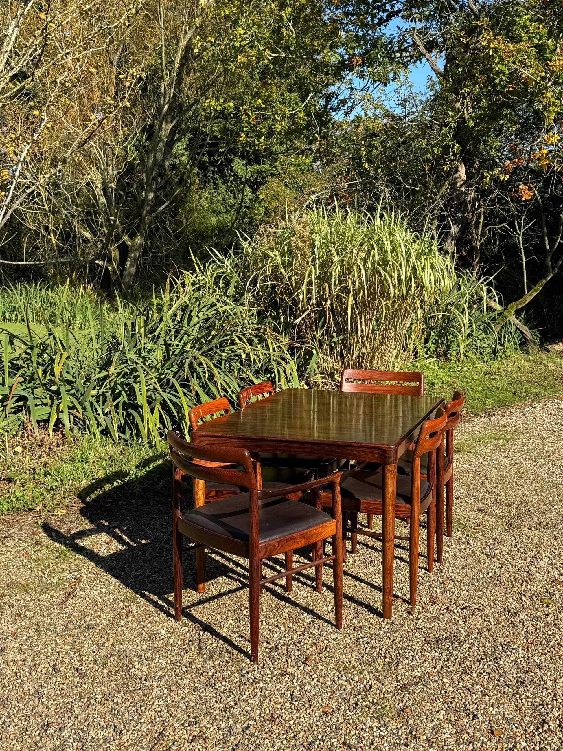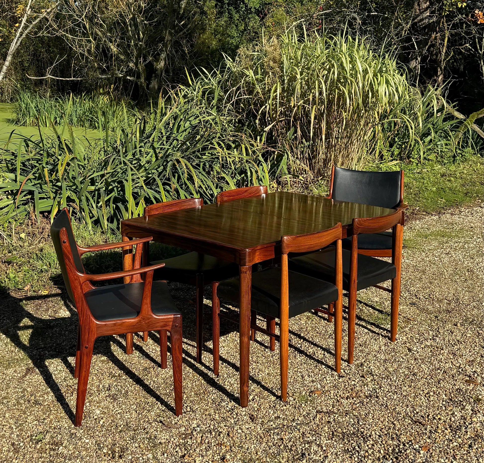 Four exceptional rosewood Bramin dining chairs. All in excellent condition. They have their original coverings. These guys are extremely elegant. The matching table is also available.