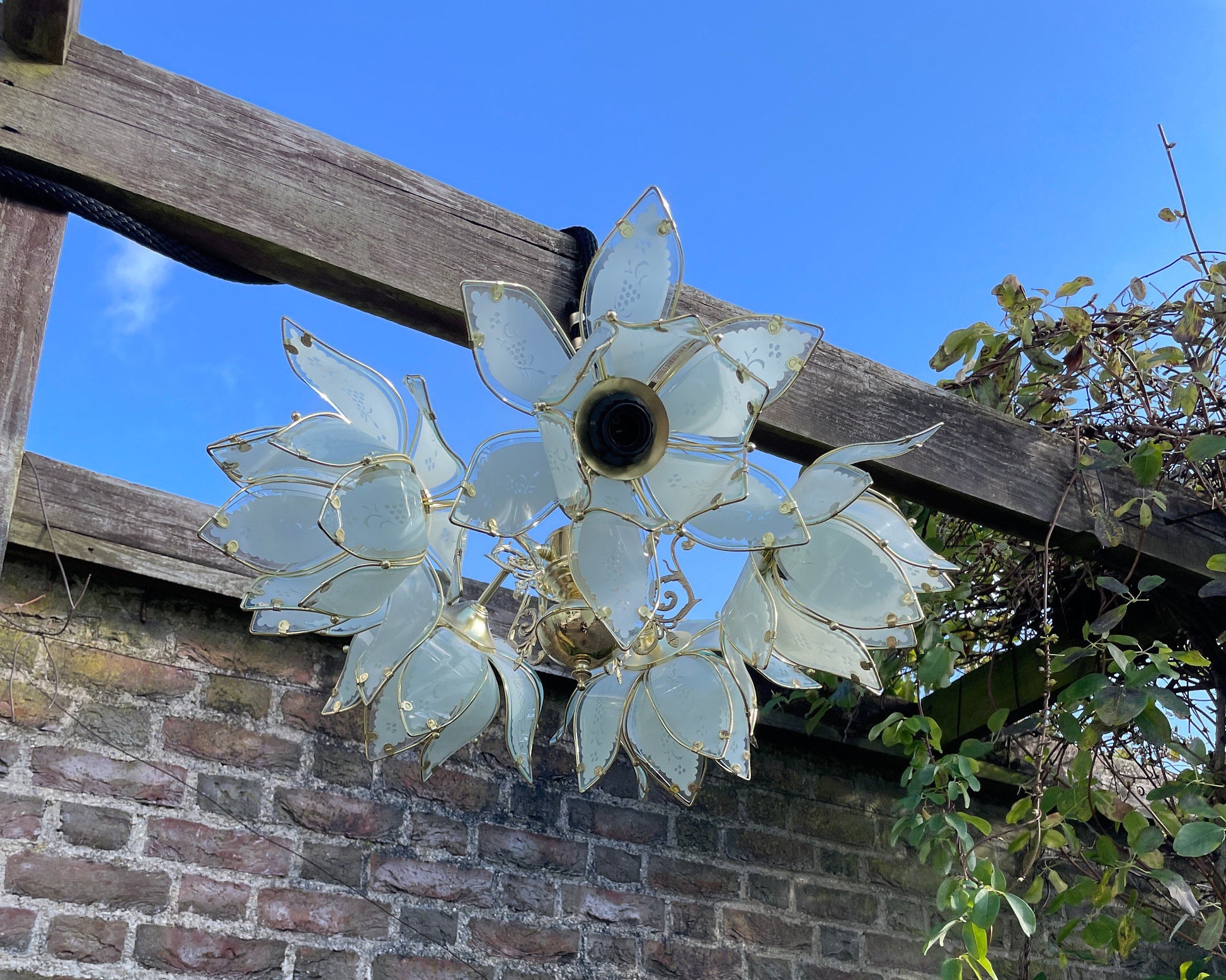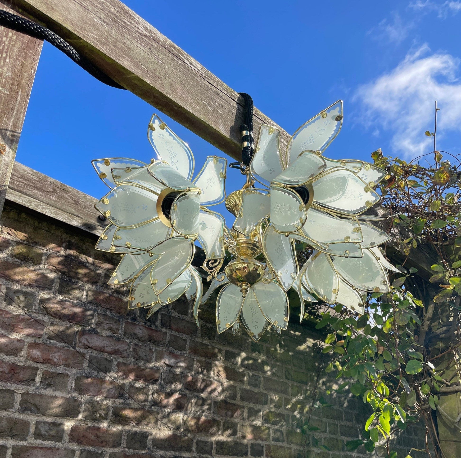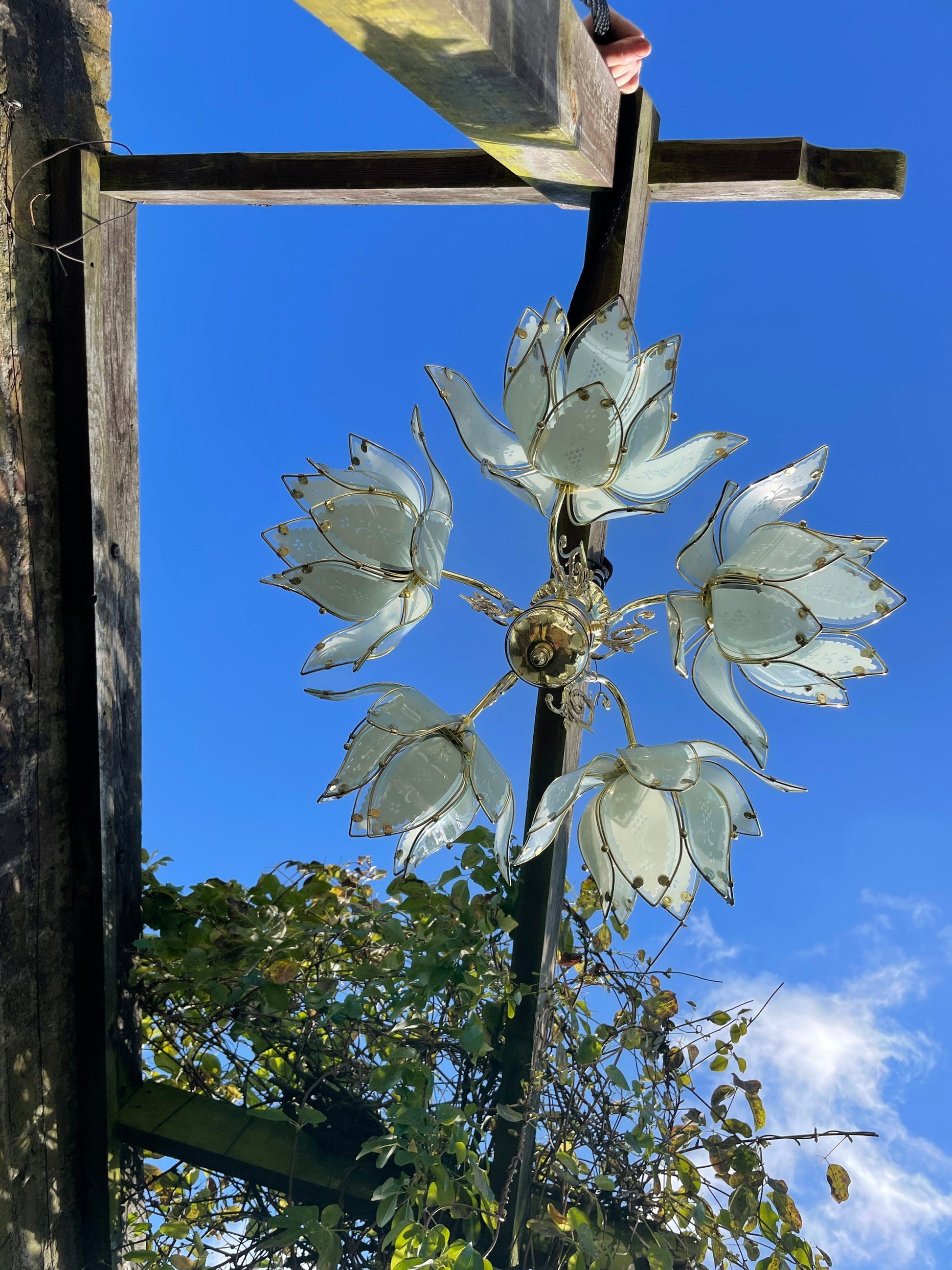 Mid Century Modern Vintage Hollywood Regency Lotus Lamp Large White/Light green glass etched Chandelier