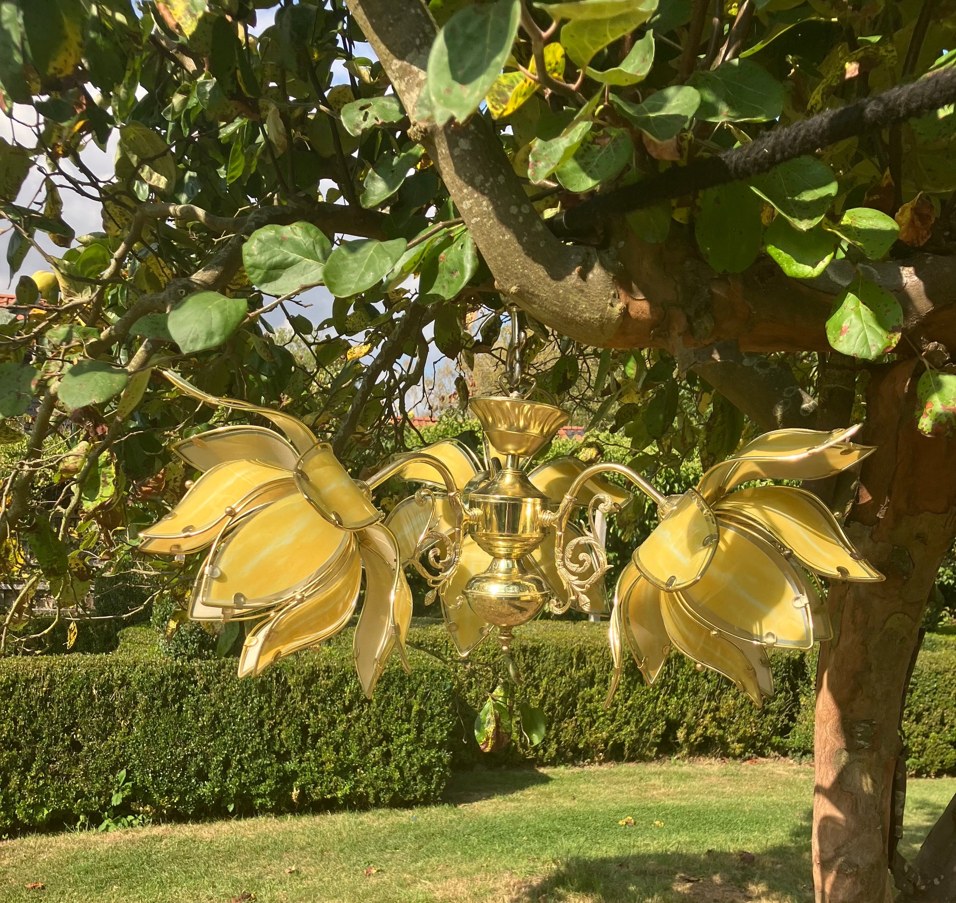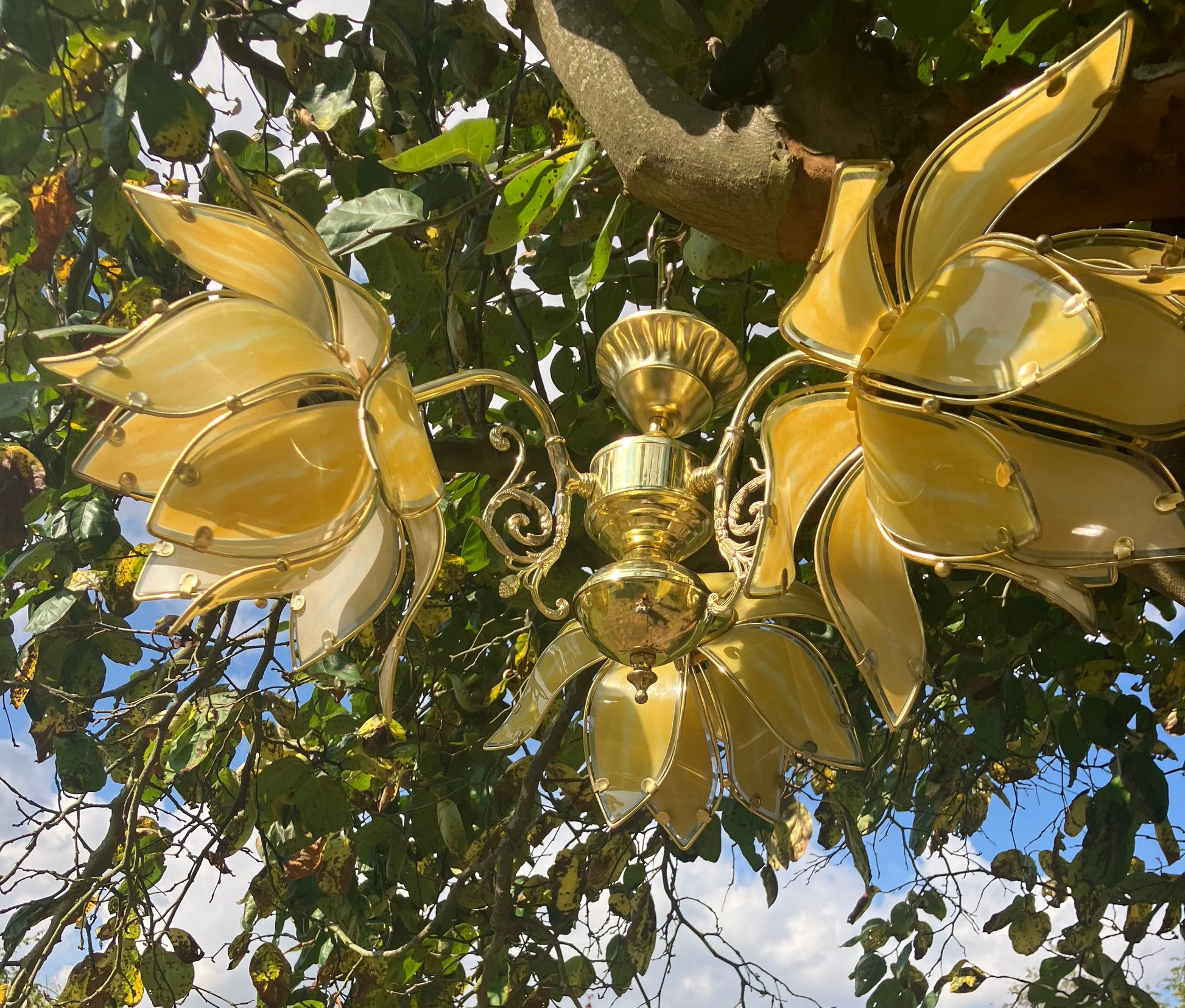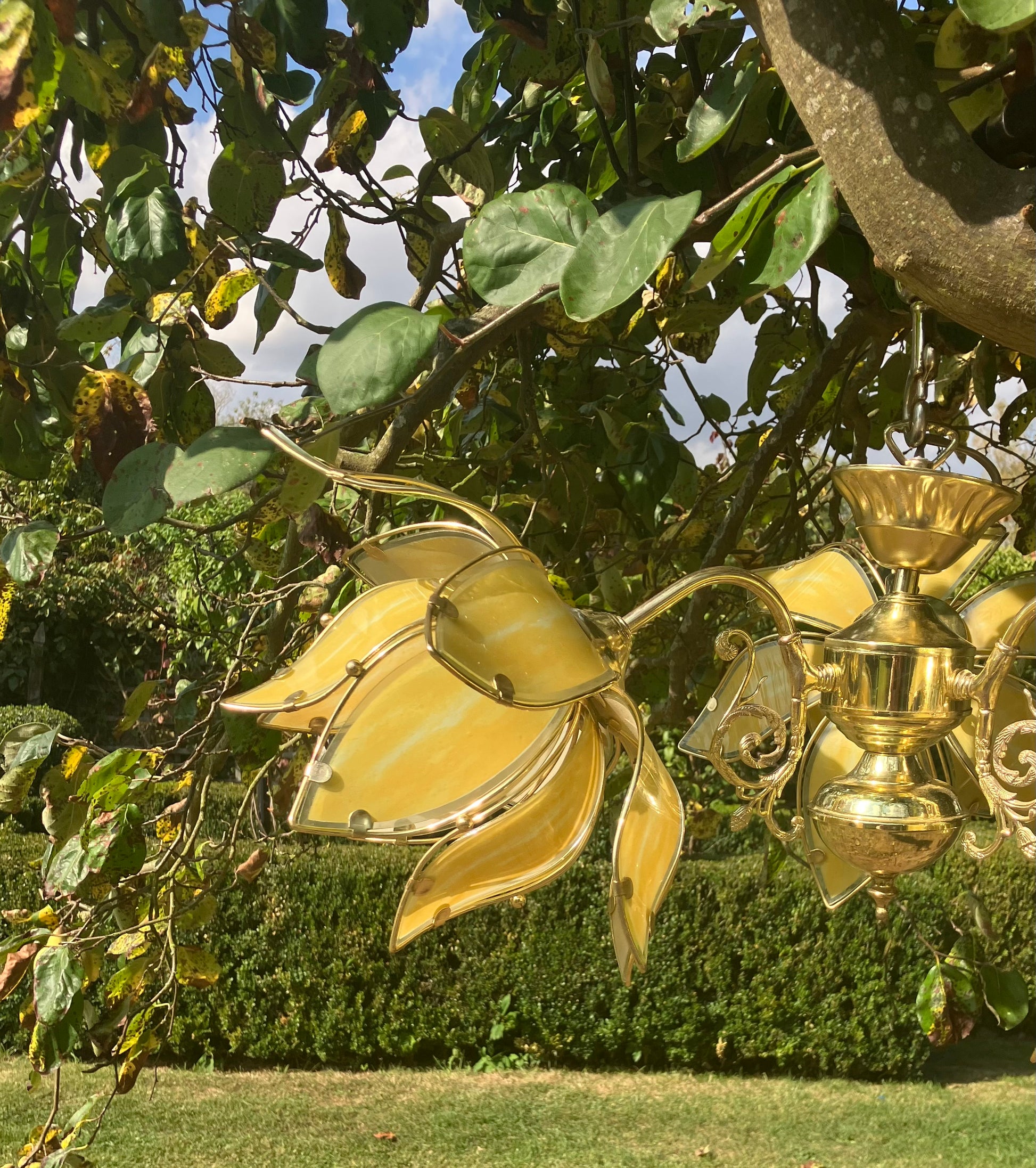 For Sophia ** Price includes shipping ***Mid Century Modern Vintage Hollywood Regency Lotus Lamp Large Yellow glass etched Chandelier