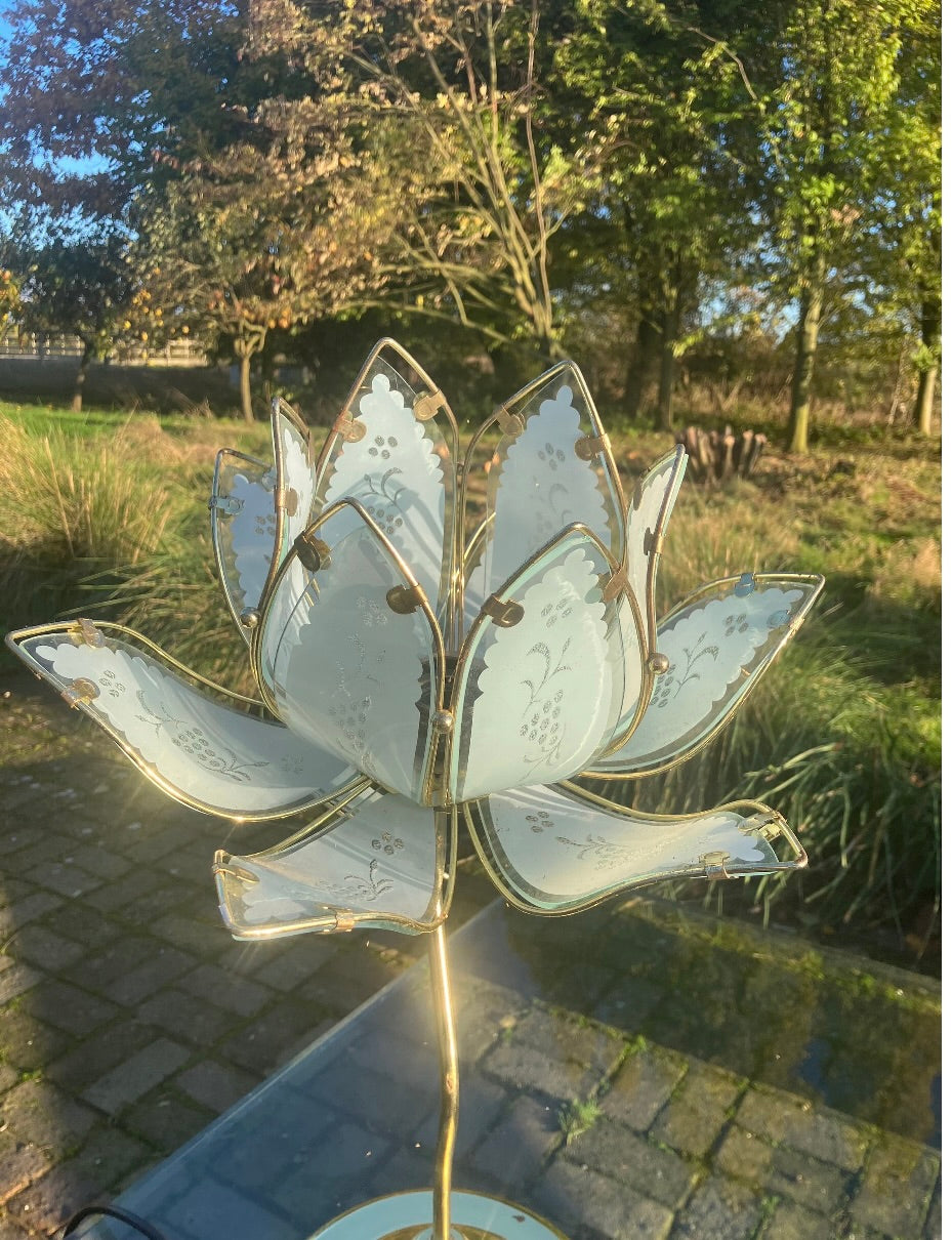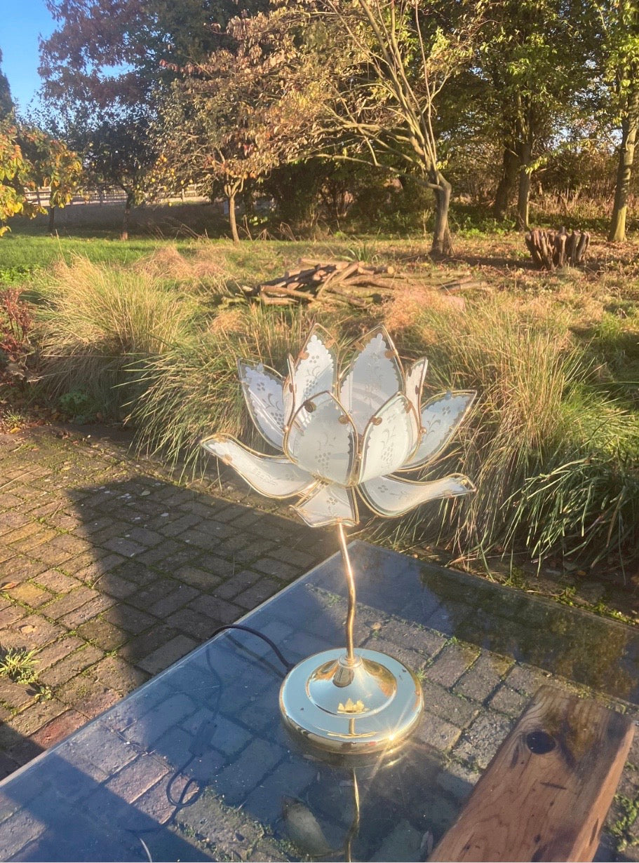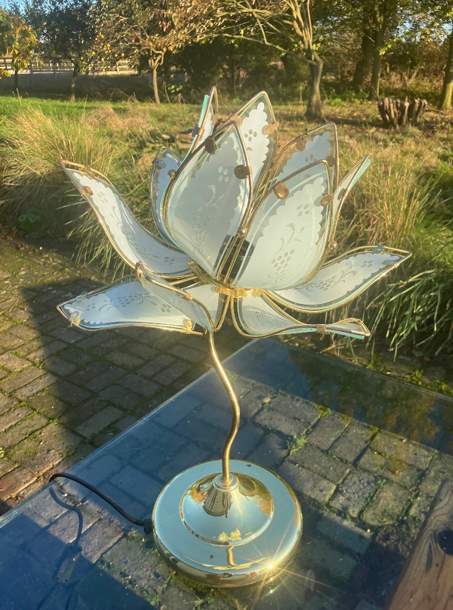 A wonderful little example of a beautiful hollywood regency lotus flower table lamp. It would look excellent on a console table, bedside unit or even as a unique desk light to brighten up working from home. It gives off a beautiful aurora and certainly brings the feeling of outside inside.