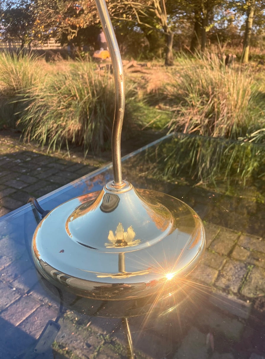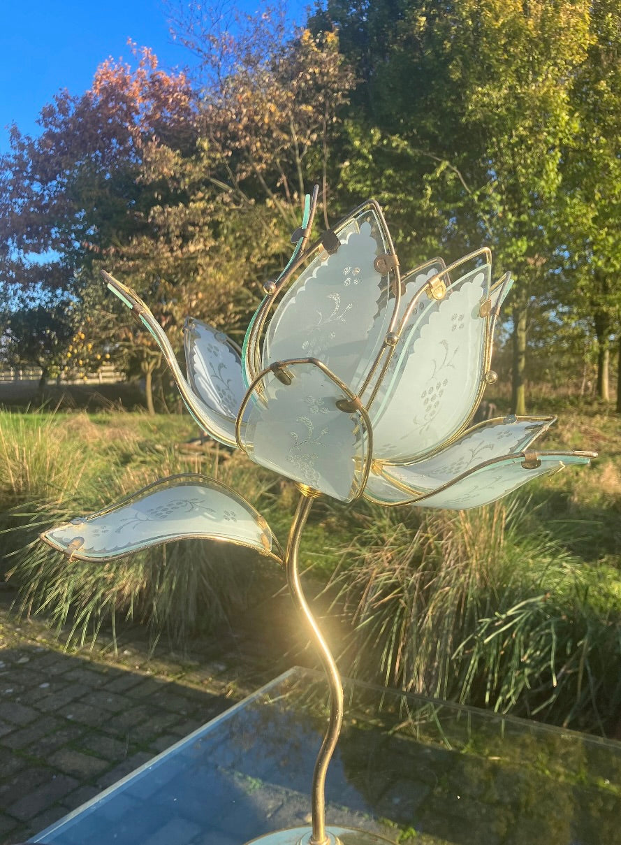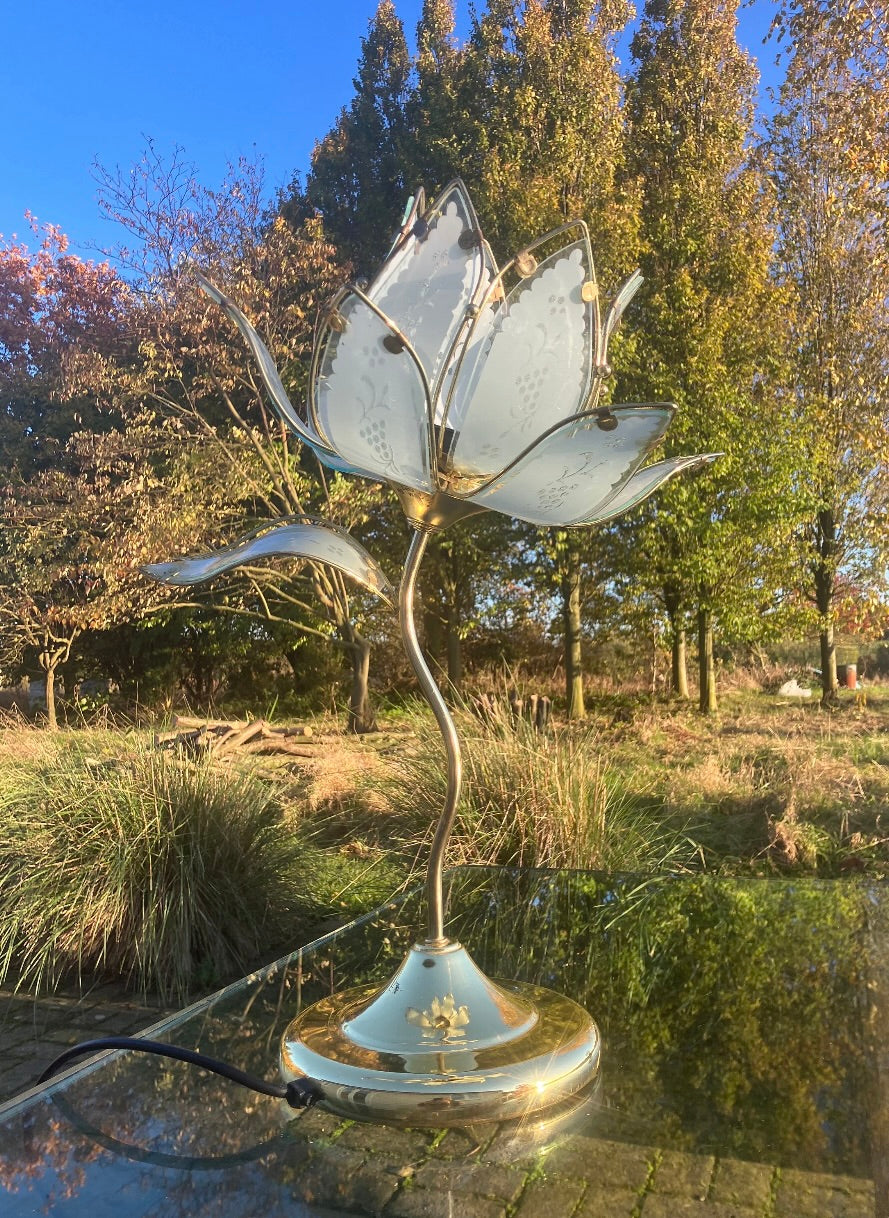 A wonderful little example of a beautiful hollywood regency lotus flower table lamp. It would look excellent on a console table, bedside unit or even as a unique desk light to brighten up working from home. It gives off a beautiful aurora and certainly brings the feeling of outside inside.