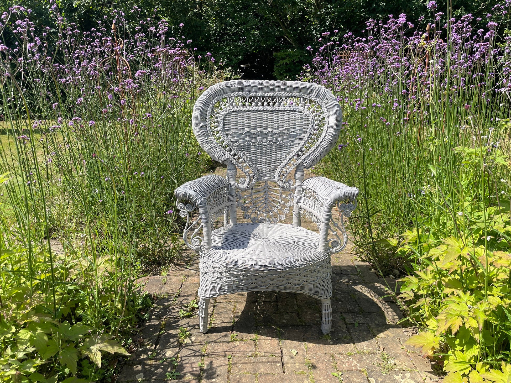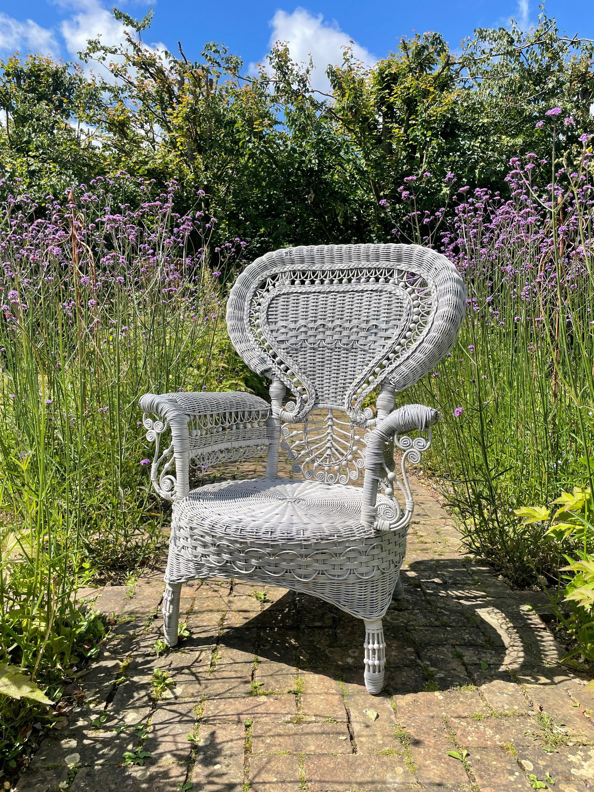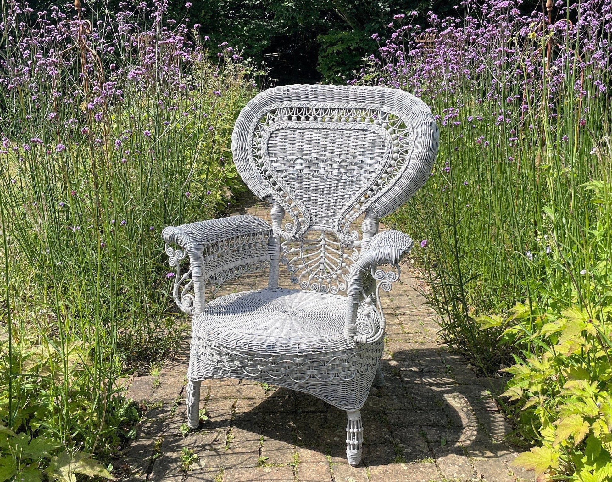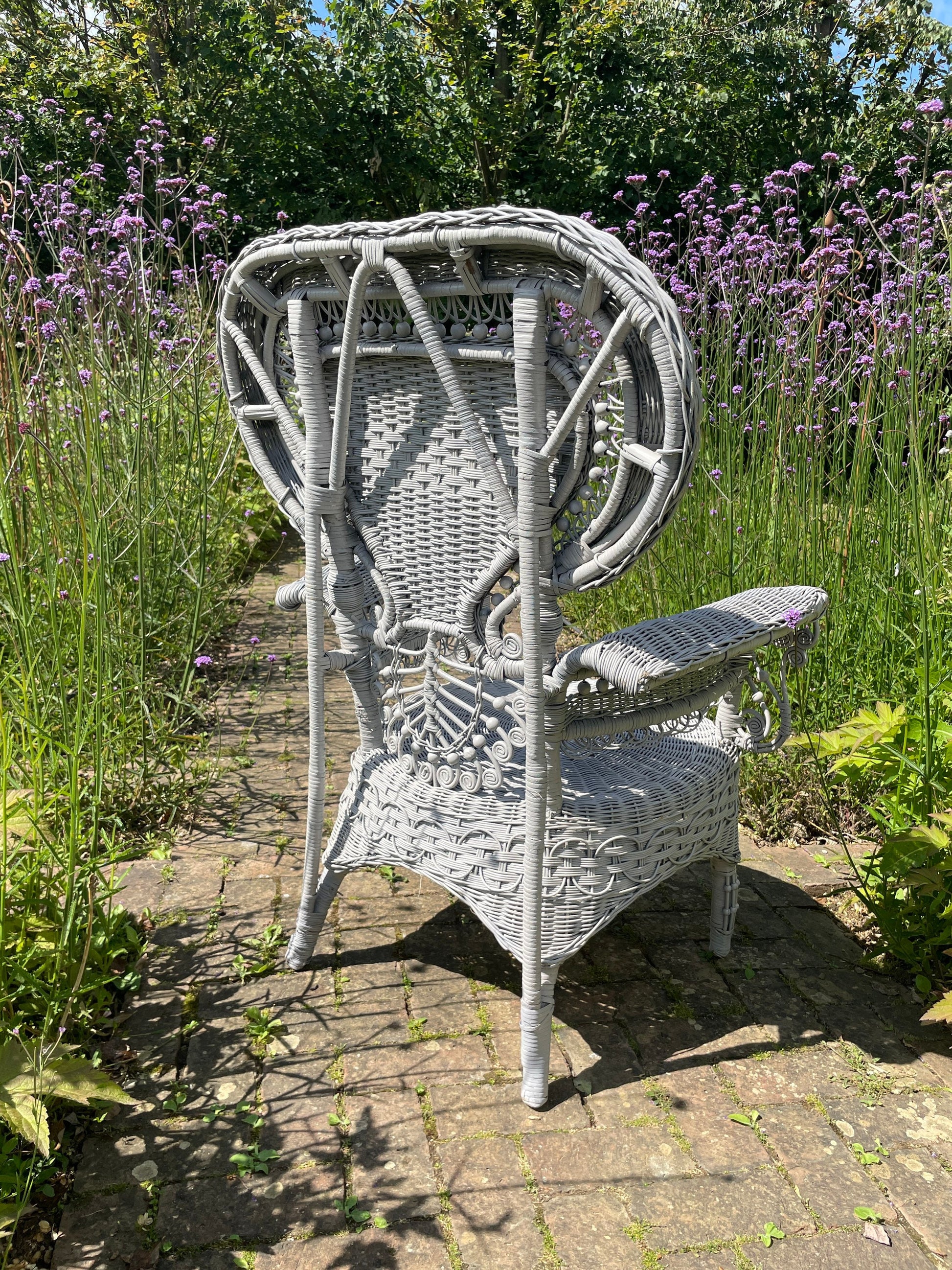 This peacock chair, is painted in a light grey. It is covered in wonderful detail making it a real eye pleaser. It would look great both inside and out.