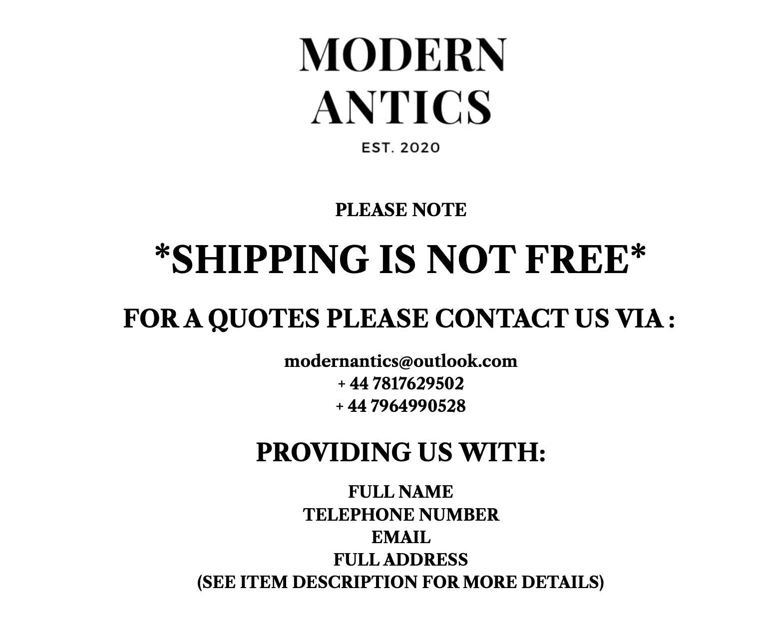 As we specialise in bespoke, one-off pieces, at Modern Antics, not one of our item’s shares the same dimensions as another. This makes it impossible for us to standardise our shipping rates, but is also another reason why every of our items is so special.