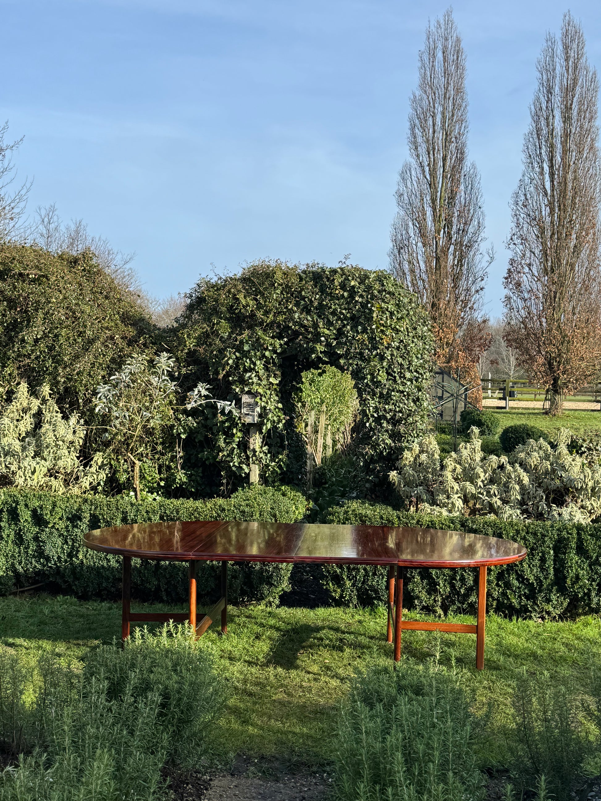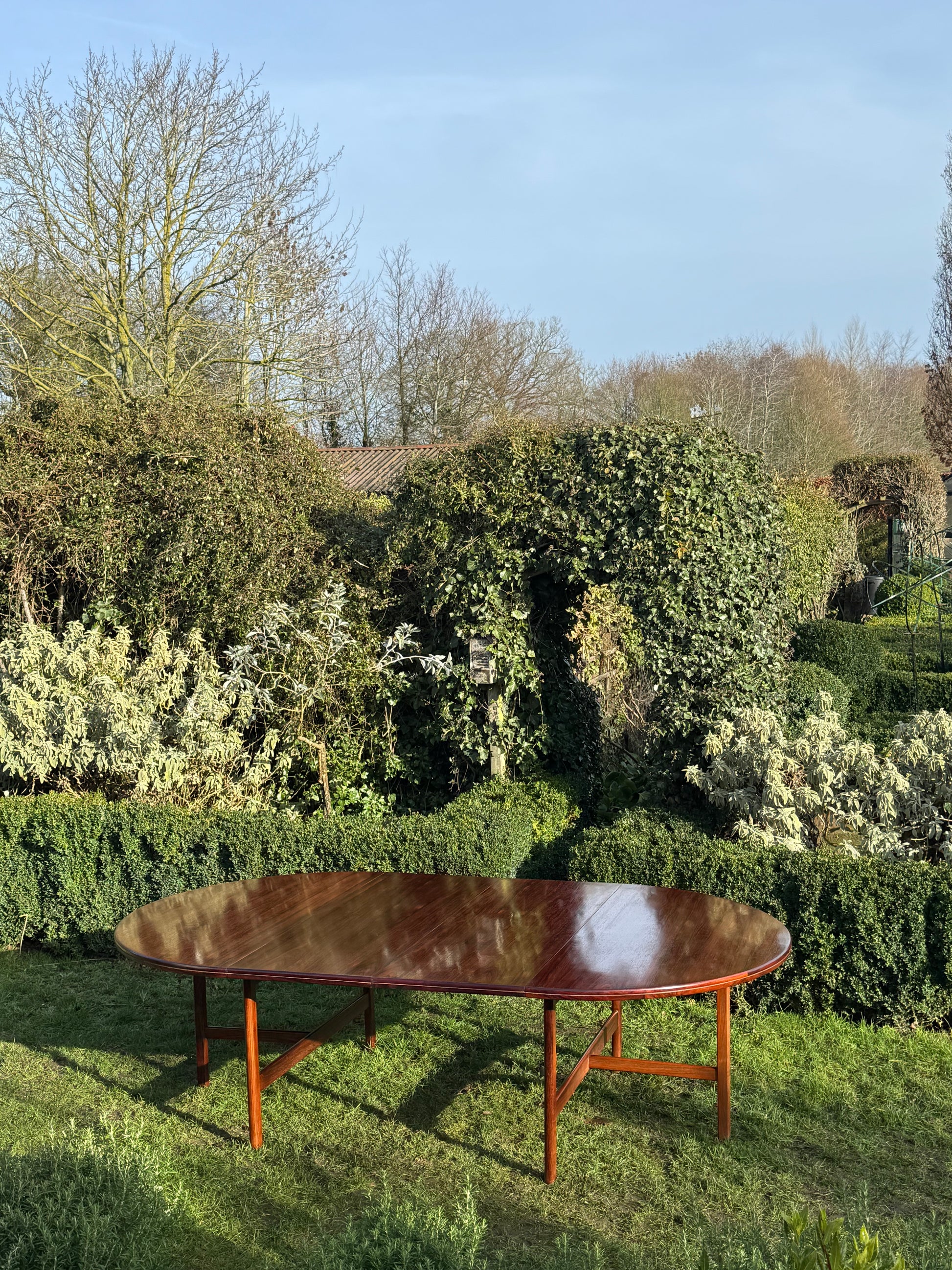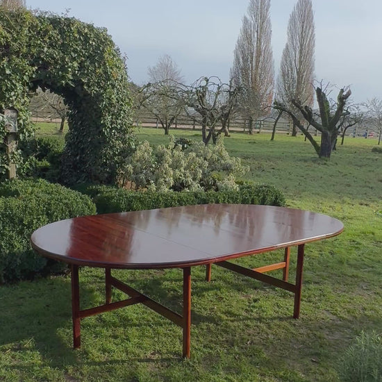 Exceptional Mid Century Rosewood dining table. This table has the most beautiful fully book matched rosewood top. The grain is exceptional. The table has been professionally restored to a very high standard. All the panels match perfectly. It is truly magnificent.