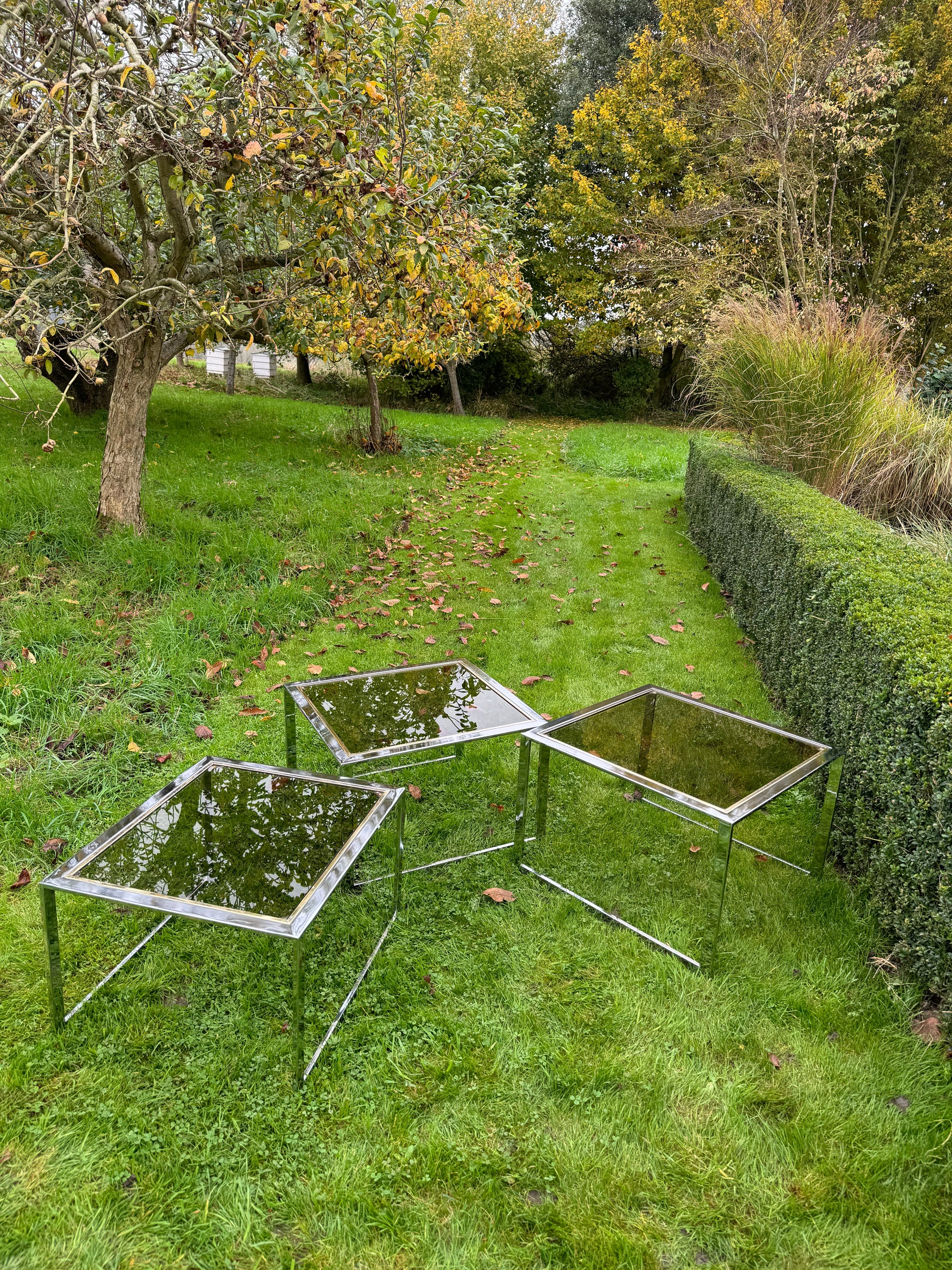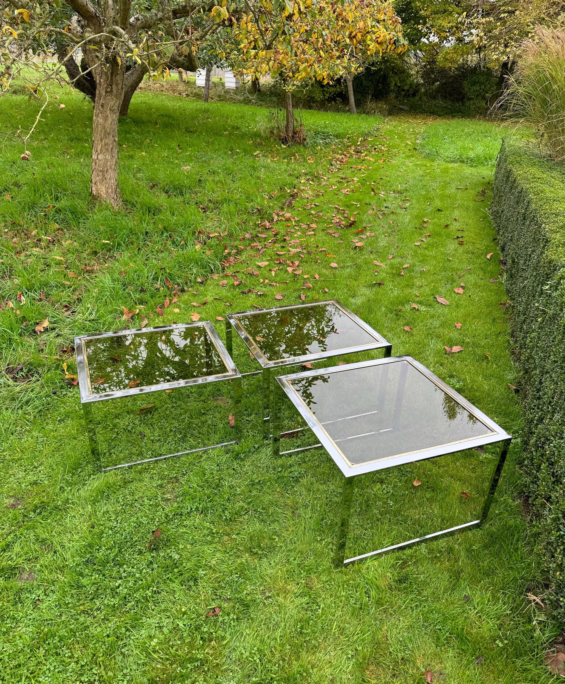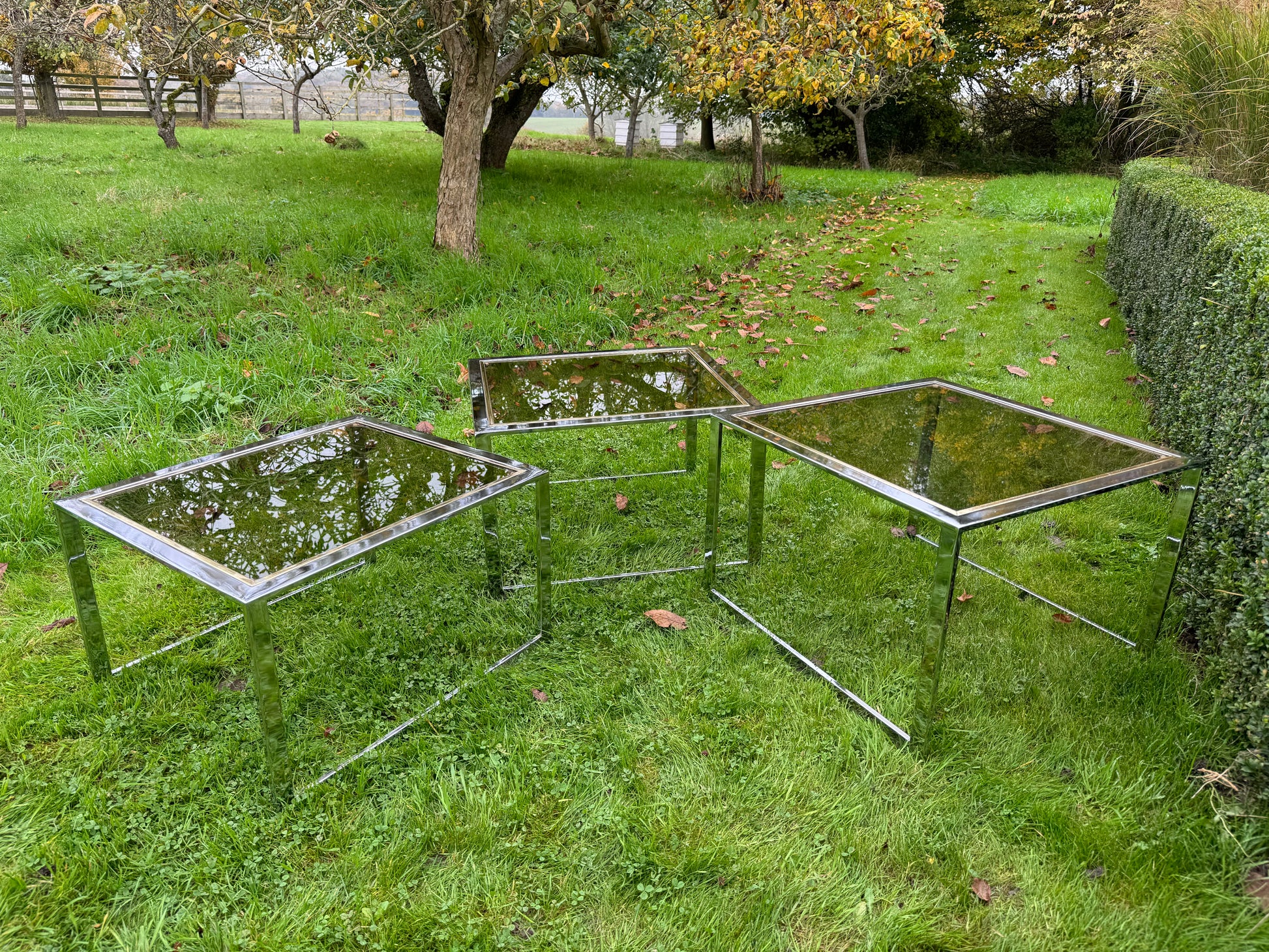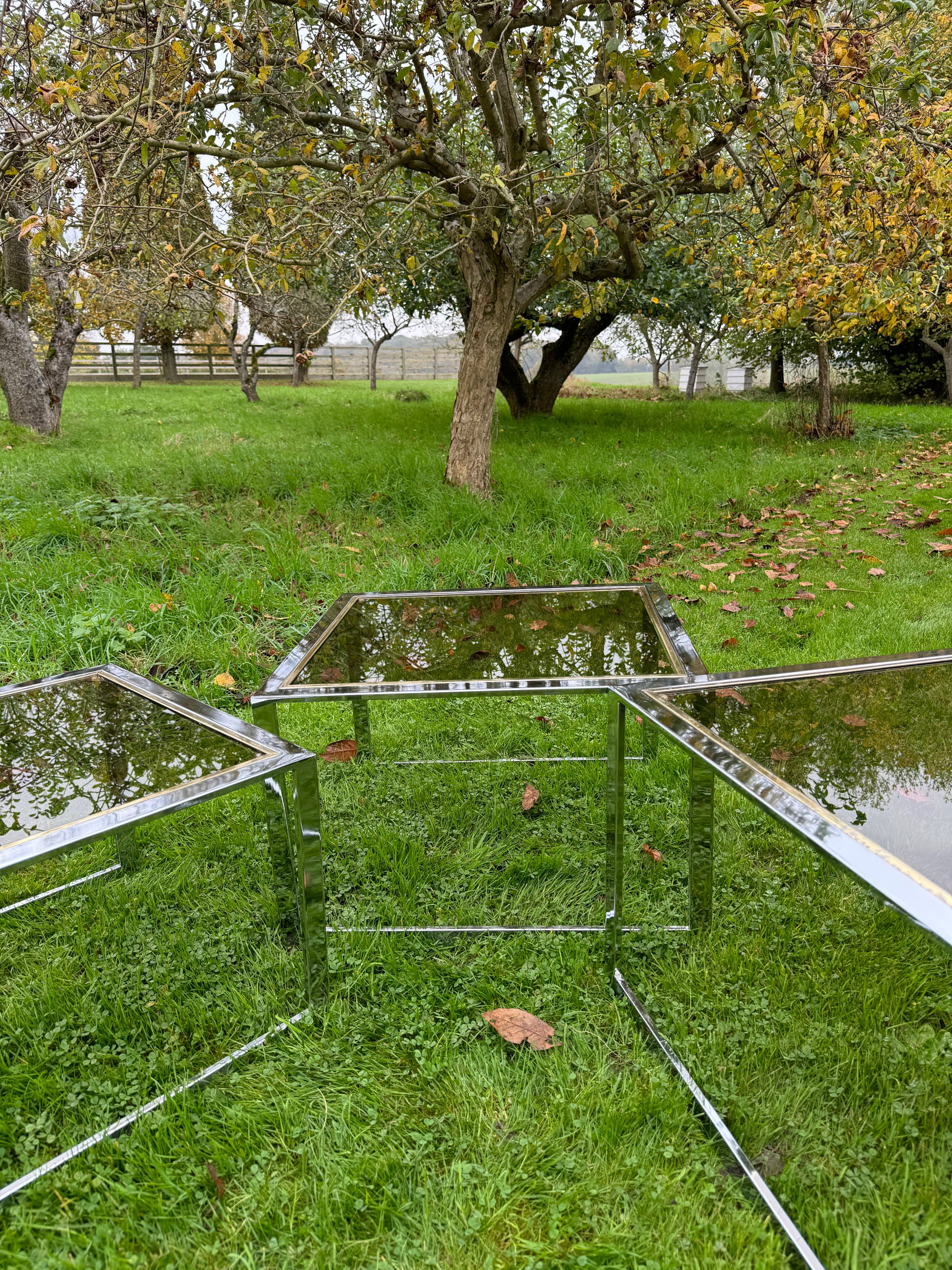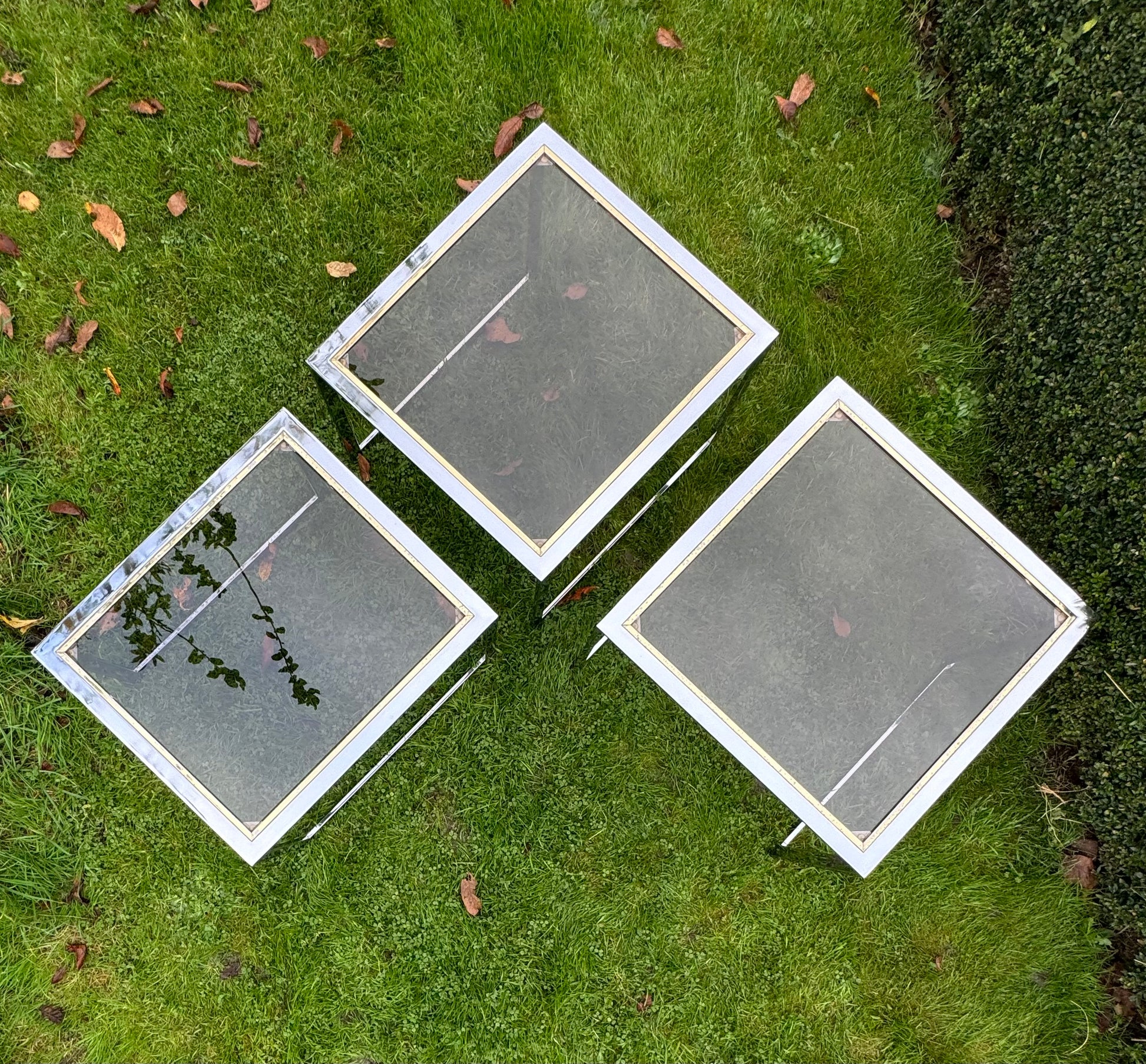 Chrome and glass, three differing sizes so they can fit inside each other.