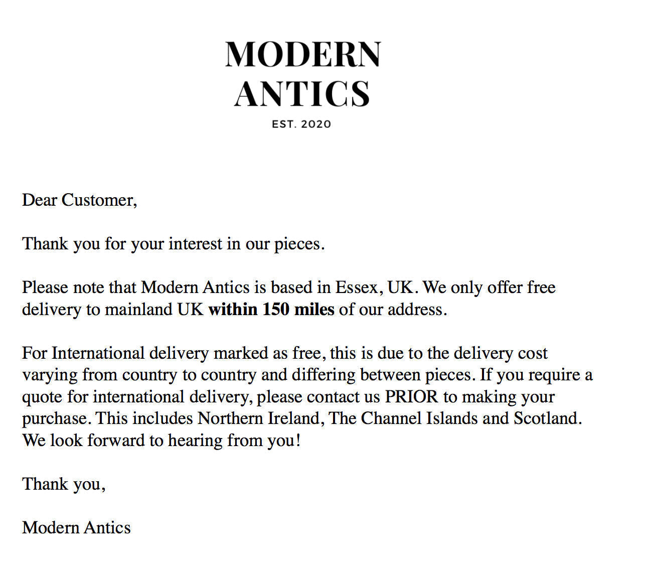 Please note that Modern Antics is based in Essex, UK. We only offer free delivery for all pieces to mainland UK within 75 miles of our address.