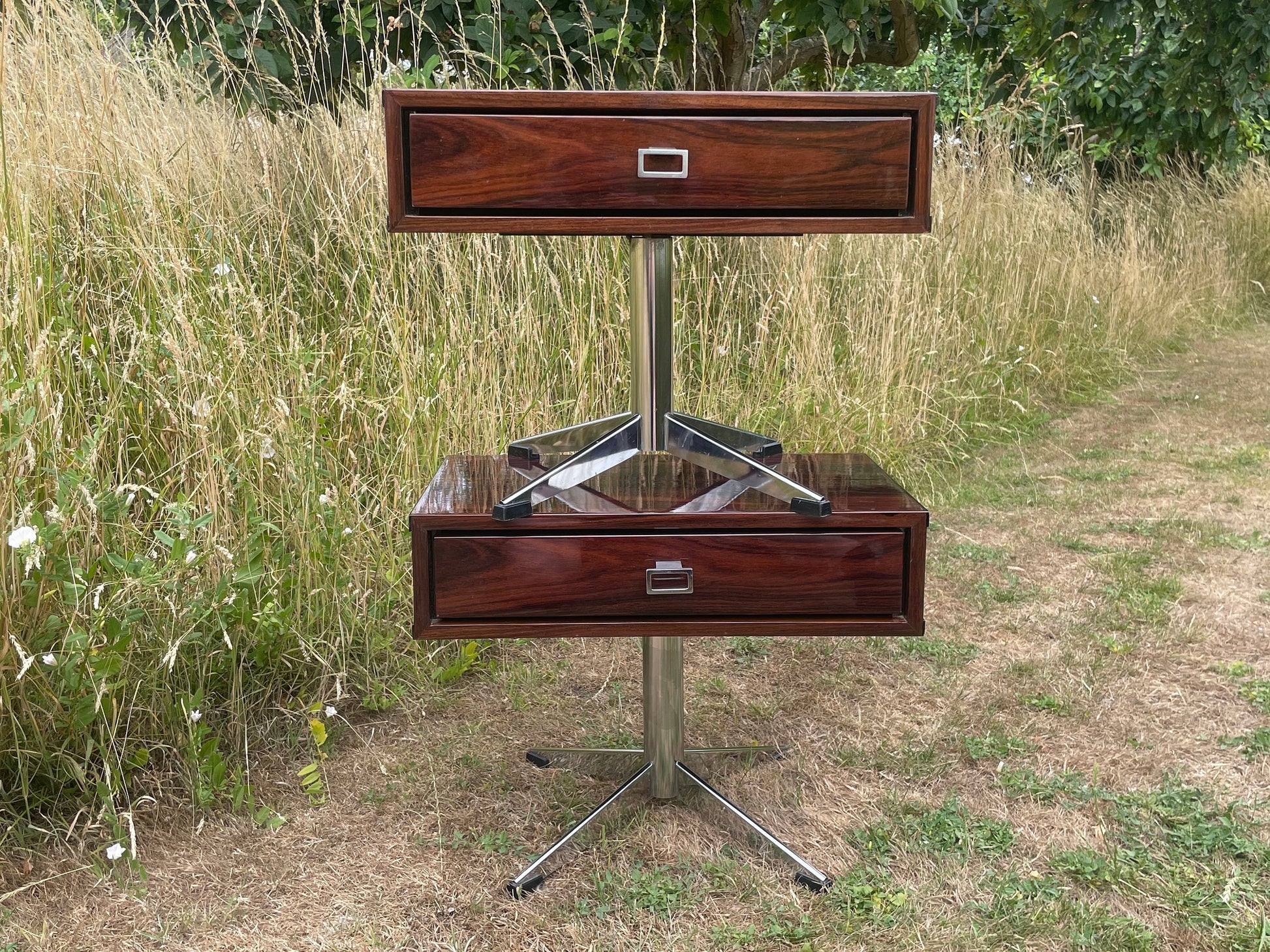 Super stylish pair of rosewood bedside tables/occasional tables. They have been finished with a beautiful lacquer, which brings out their beautiful rosewood grain. The legs are chrome, which are in a tripod shape. Lovely quality piece with sycamore drawers. The pair are beautiful detailed, with pretty chrome square pull handles.