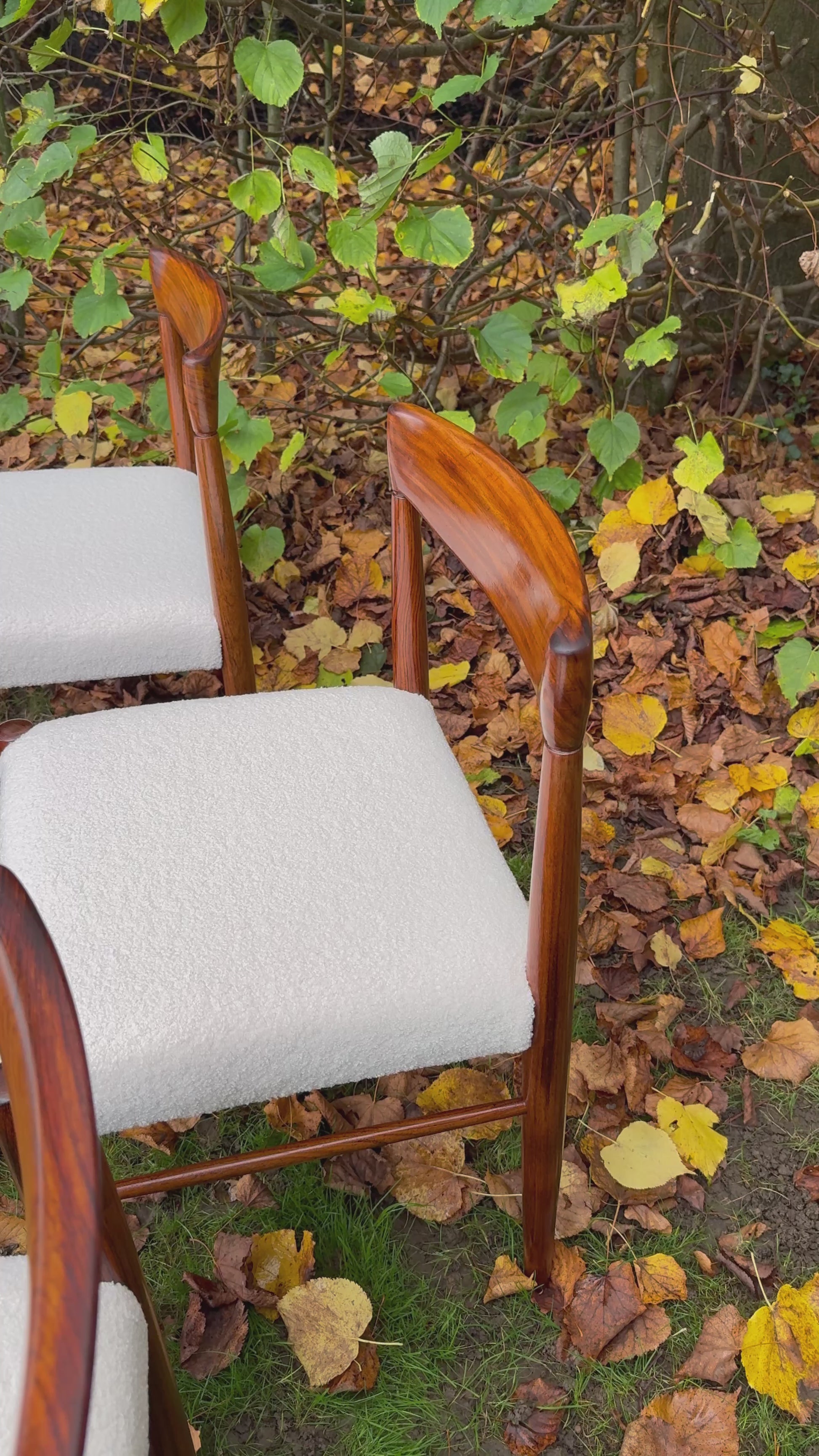 They have also been refinished and are in excellent condition. They have been reupholstered with new foam and covered in a luxurious off white boucle fabric.