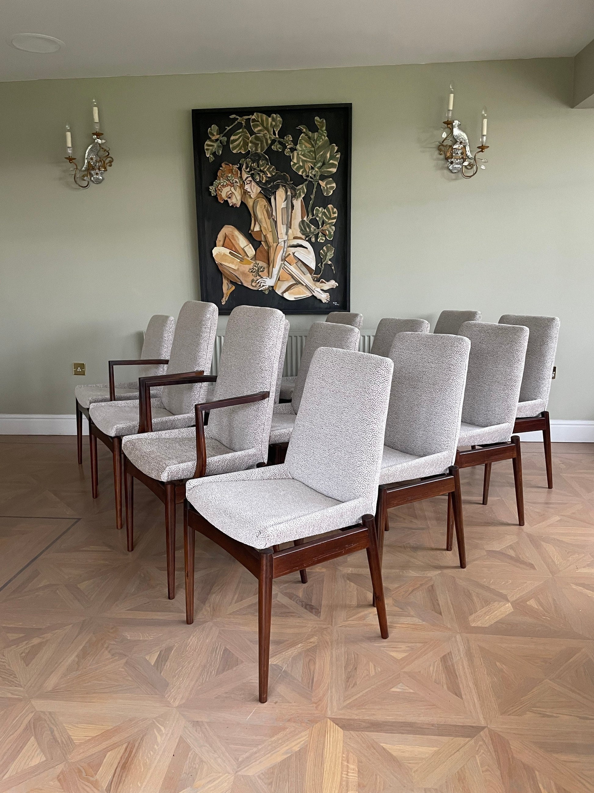 A sophisticated set of 10 rosewood dining chairs. Designed in the 1950’s by Archie Shine and produced by Robert Heritage, they define Mid Century Modern Class.