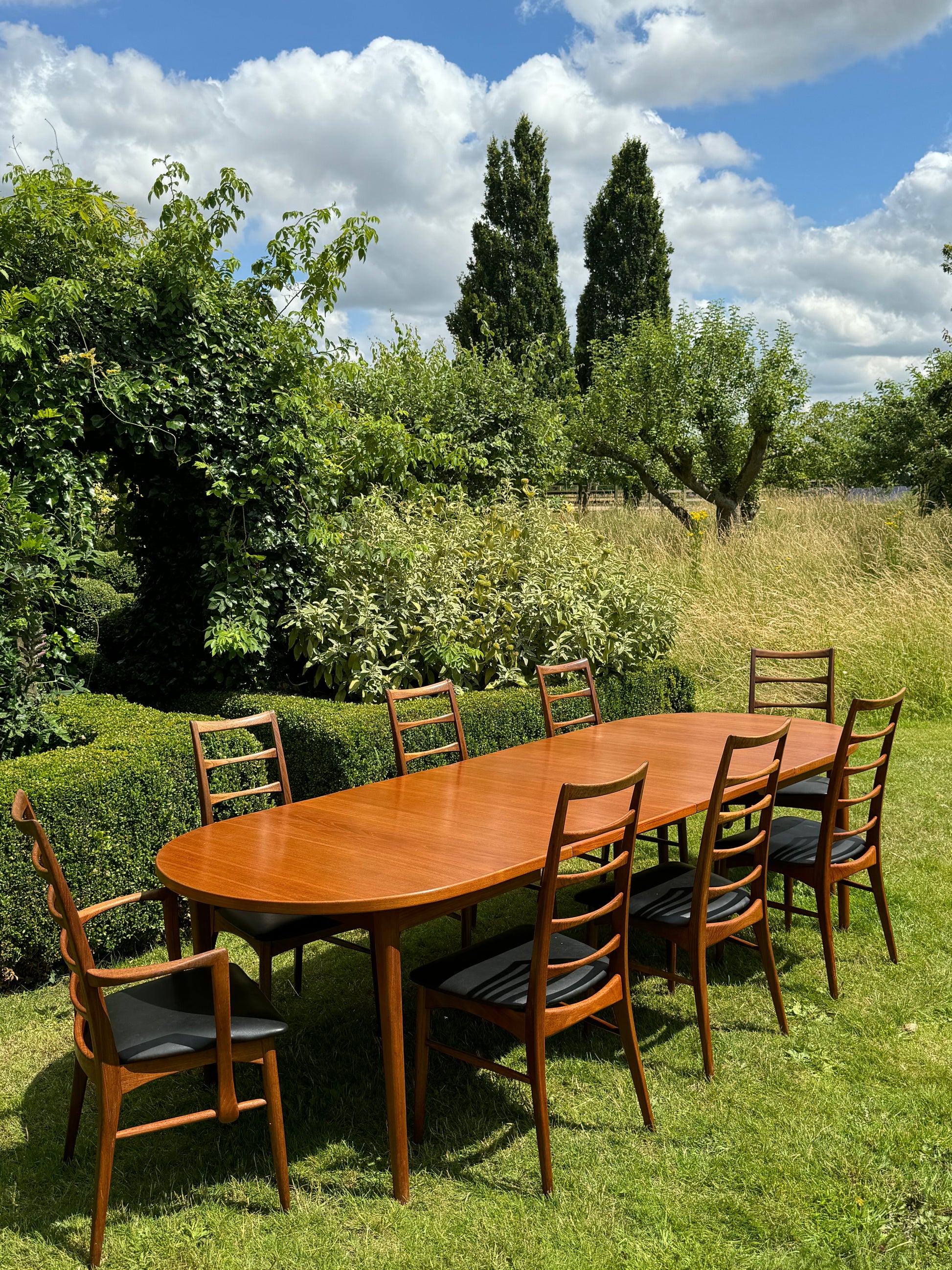 Includes six dining chairs and two carvers. All in wonderful vintage condition with the original vegan leather seats.