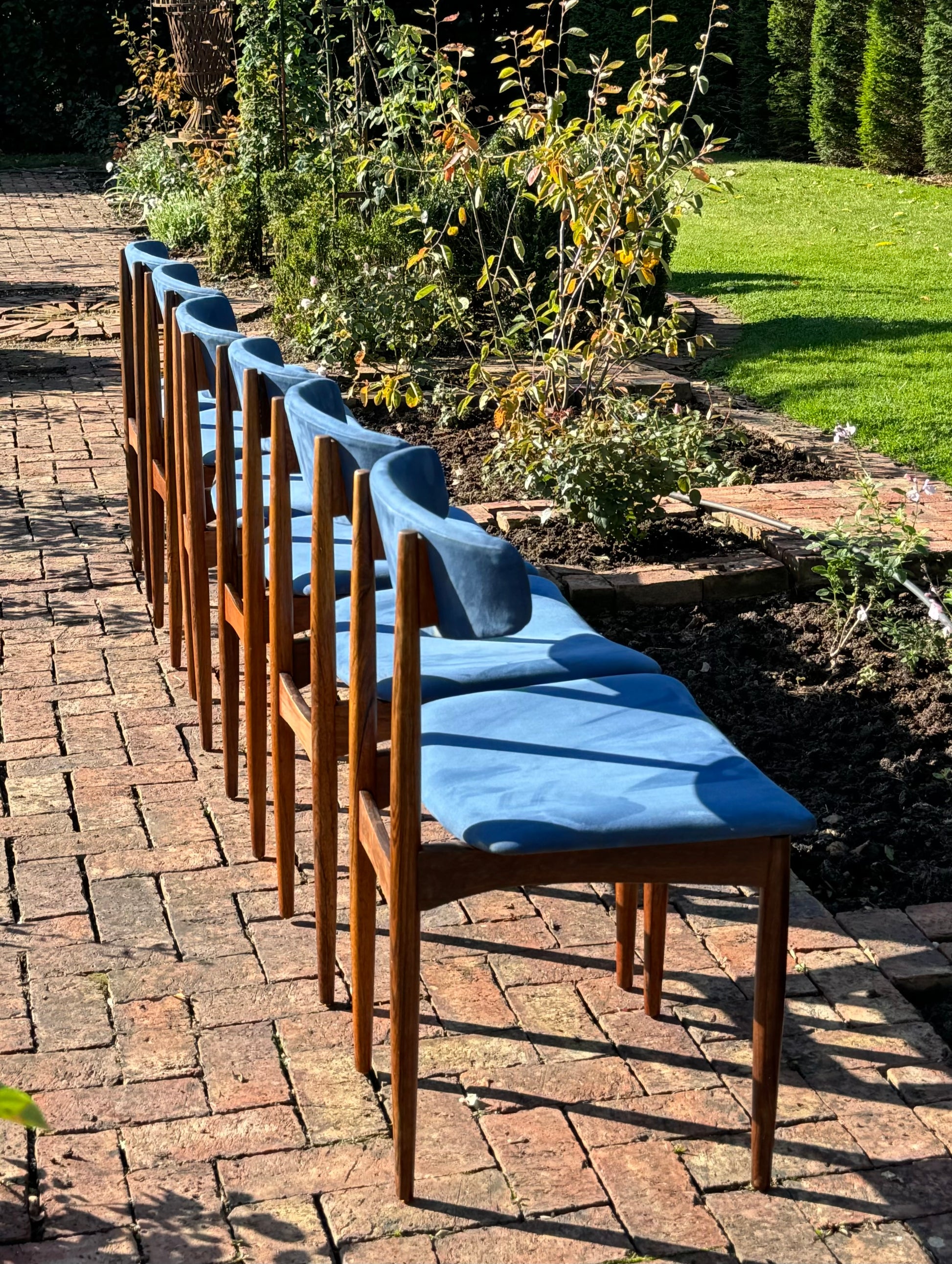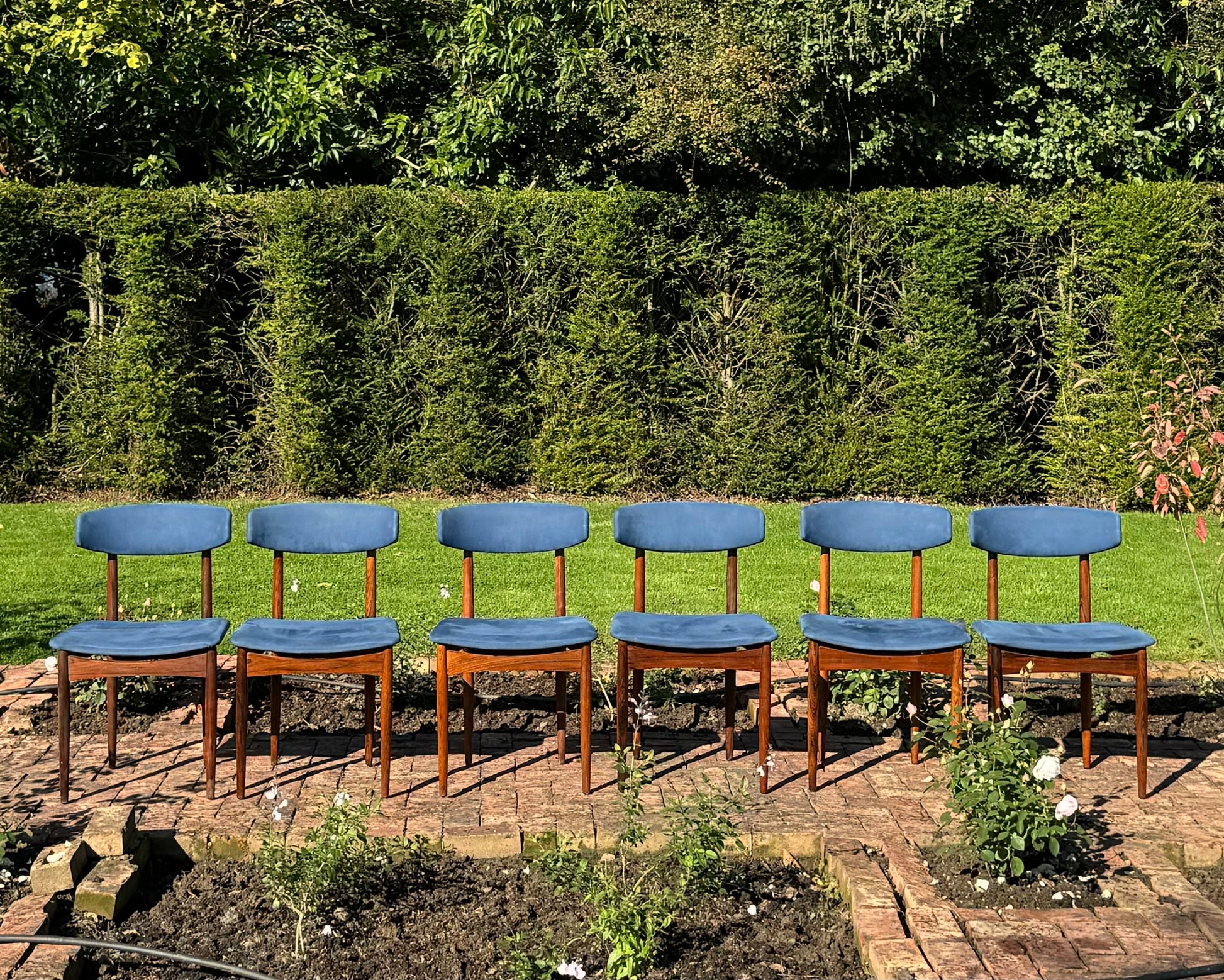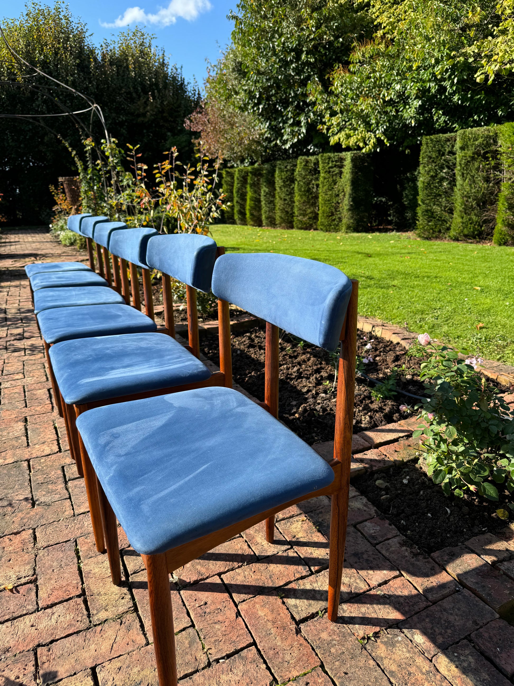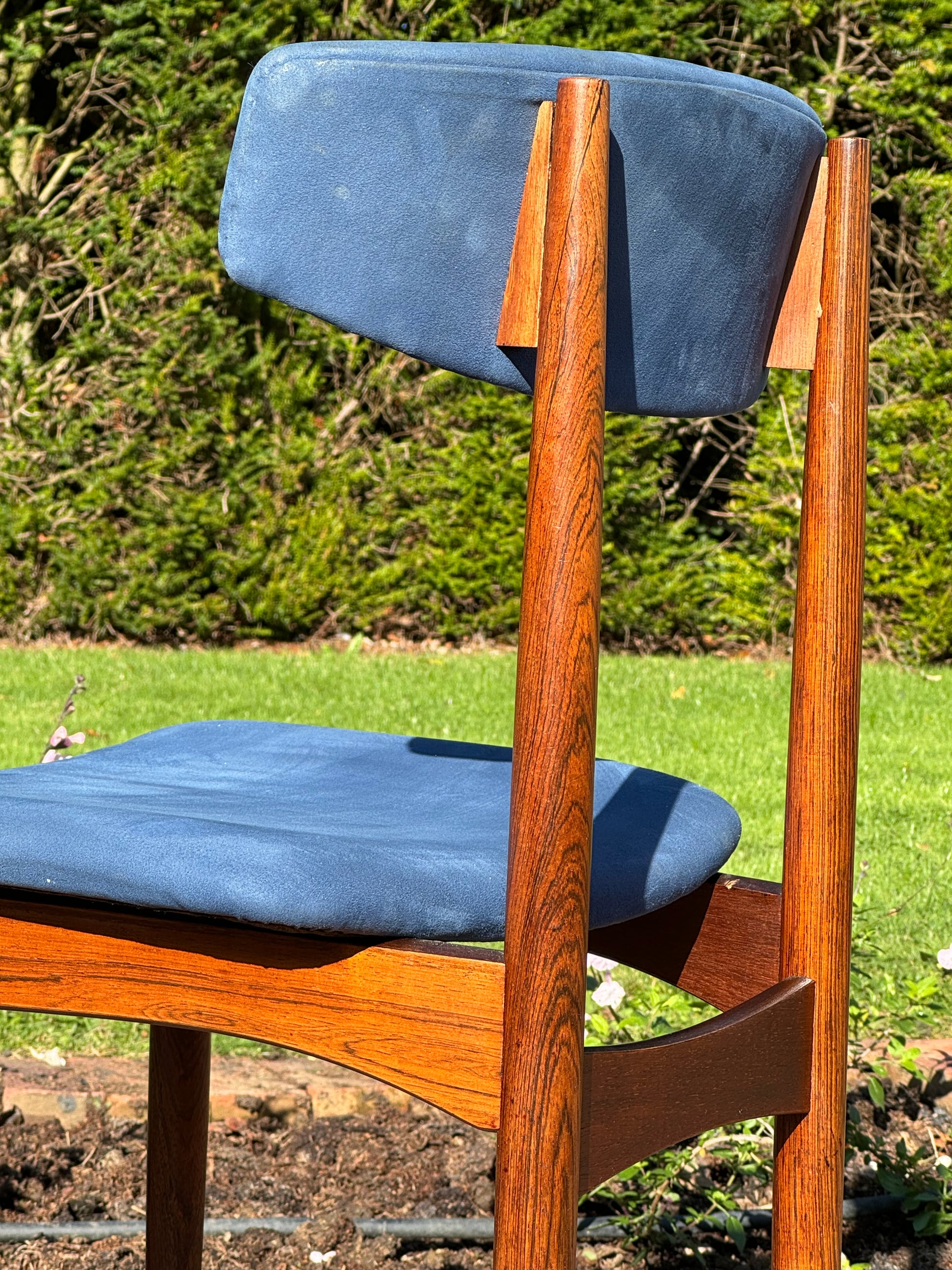 Six superb Danish rosewood dining chairs by Henry Rosengren Hansen with blue upholstered barbacks and fixed pad seats. The chairs are raised on turned slender tapering supports.