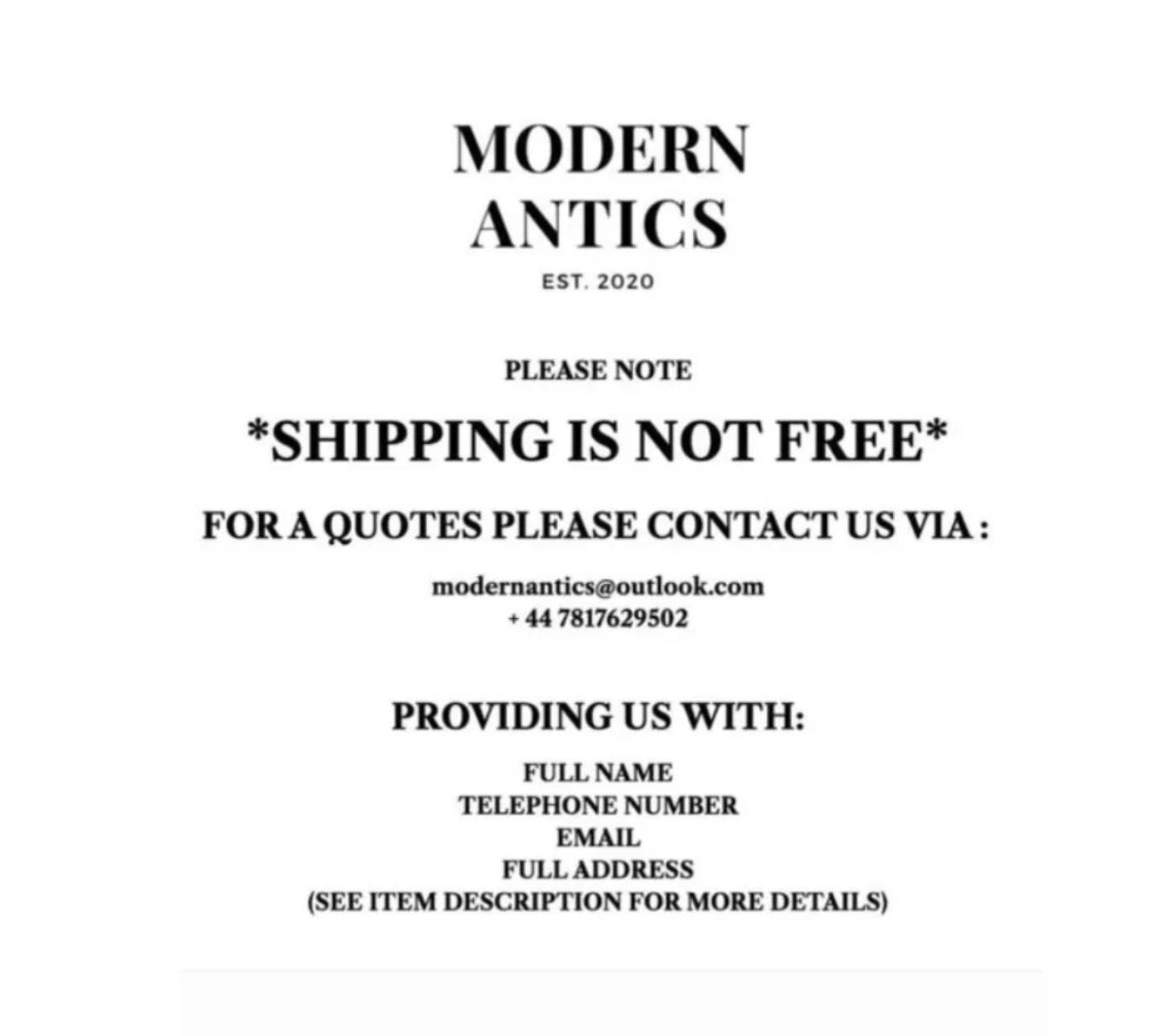 As we specialise in bespoke, one-off pieces, at Modern Antics, not one of our item’s shares the same dimensions as another. This makes it impossible for us to standardise our shipping rates, but is also another reason why every of our items is so special.