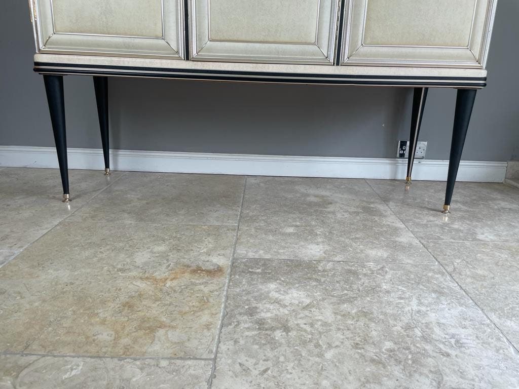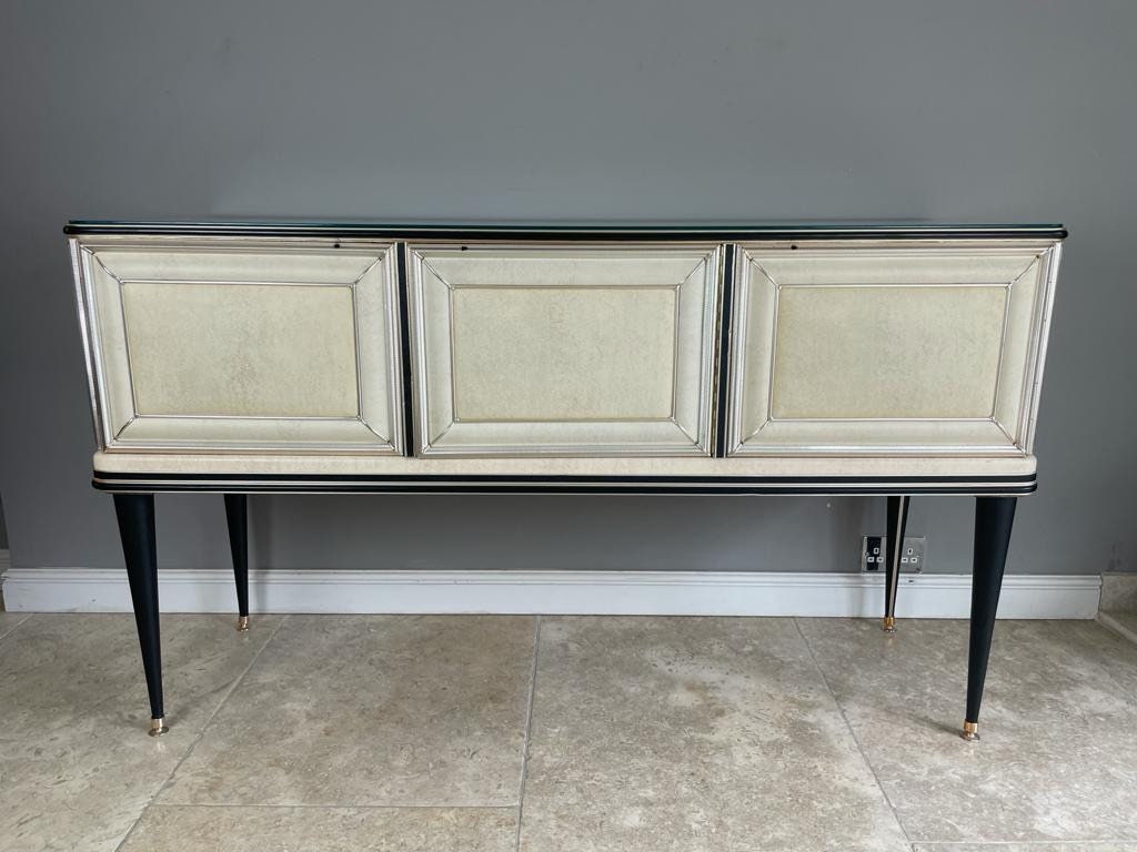 Early 1950s sideboard created by Umberto Mascagni of Bologna, Italy, imported to the UK by I. Barget and retailed through Harrod's, London, 1952-1955. Mascagni was known for his provocative use of new materials in furniture designs such as skai (PVC) and aluminium. The padded skai exterior which presents as a white vellum parchment is trimmed with polished aluminium. Rectangular case on four tapered legs. Three locking doors, each having inset mirror on the reverse of each door. Left and right are open compartments fully lined like the exterior; middle door opens to reveal three drawers lined with blue textured skai. Legs, which are also wrapped in black skai with vertical inlaid aluminium stripe, can be removed for ease of transport.