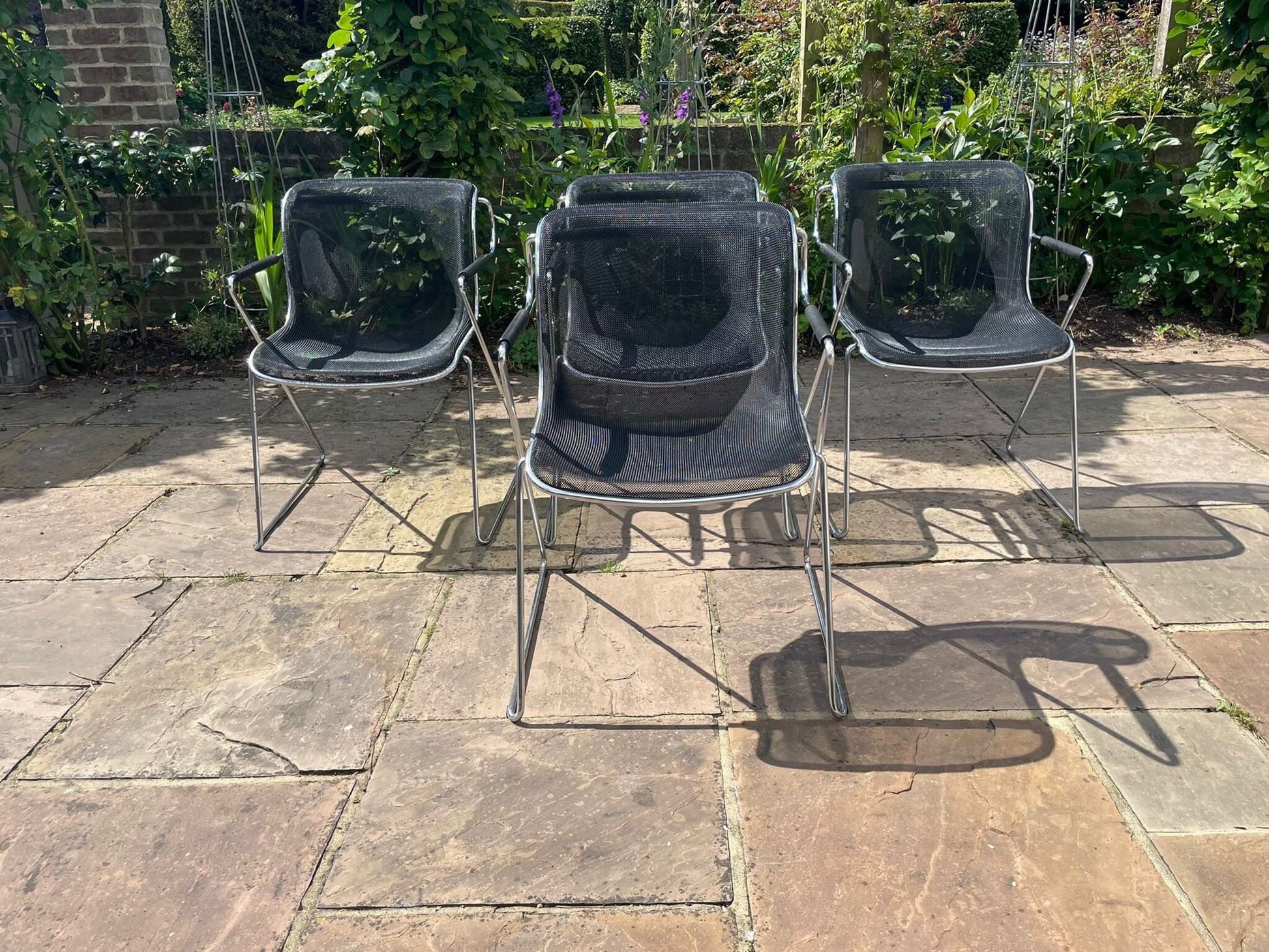 They were made in the 1970s and are set on tubular chrome with a black mesh seat. They are in vintage condition, consistent with their age and material (with some light pitting).