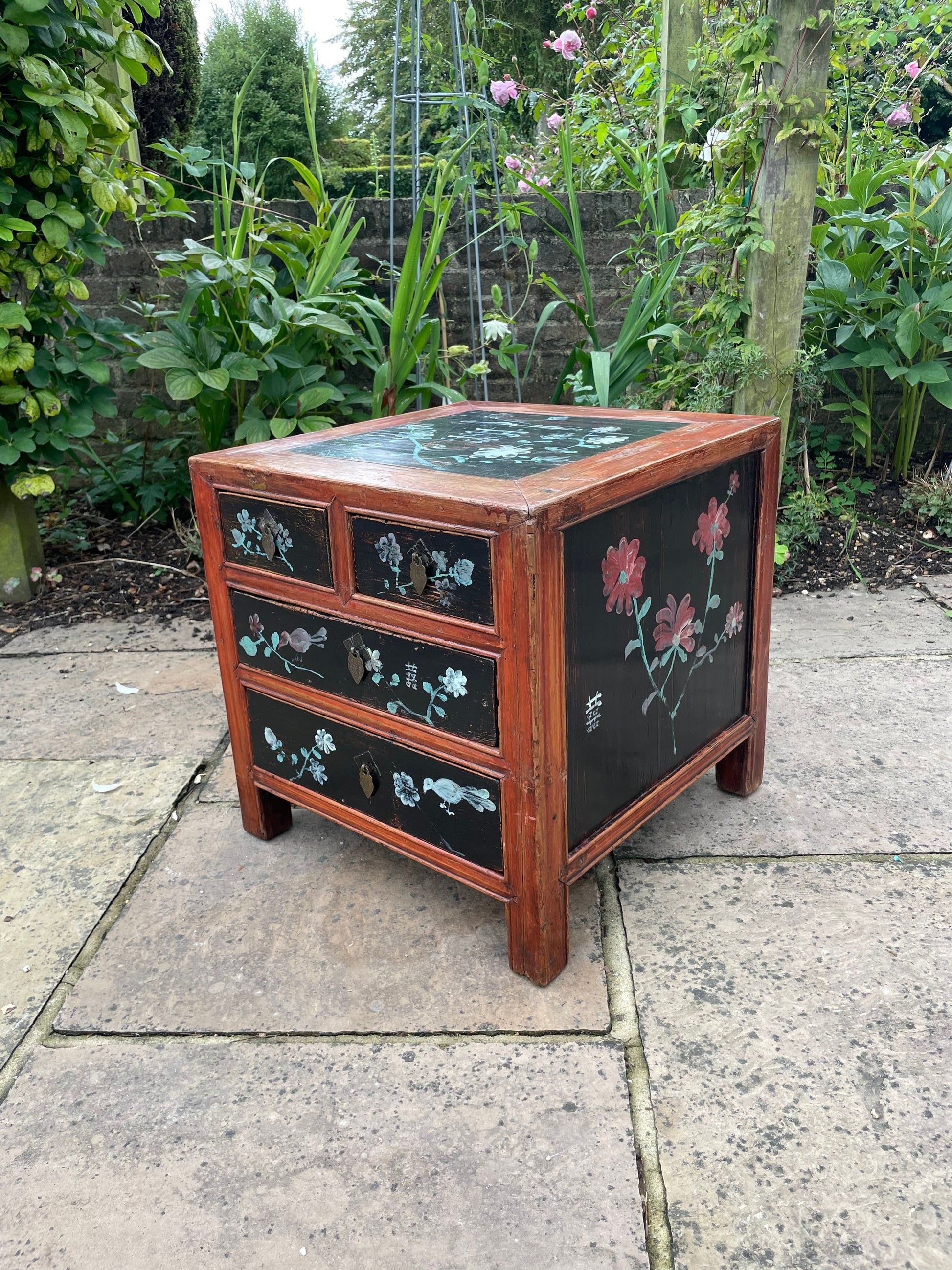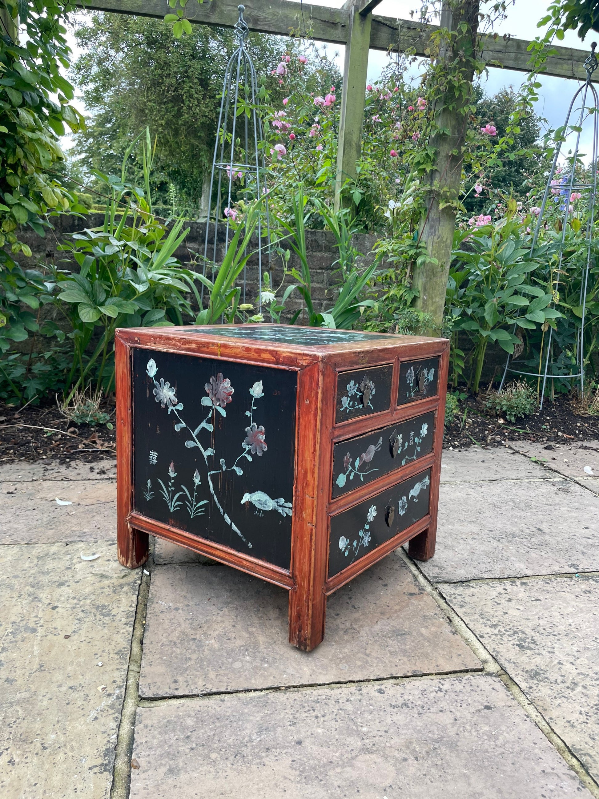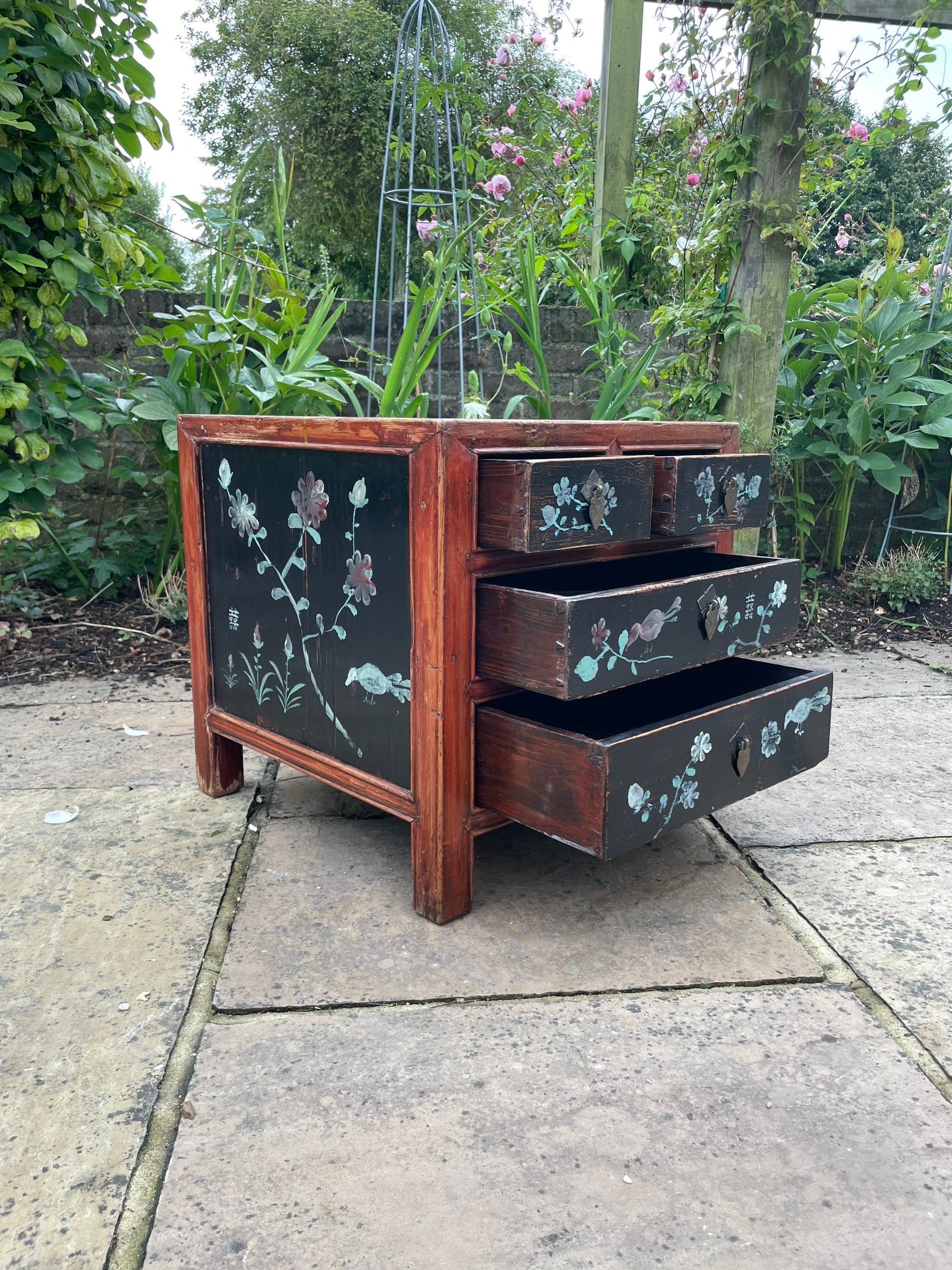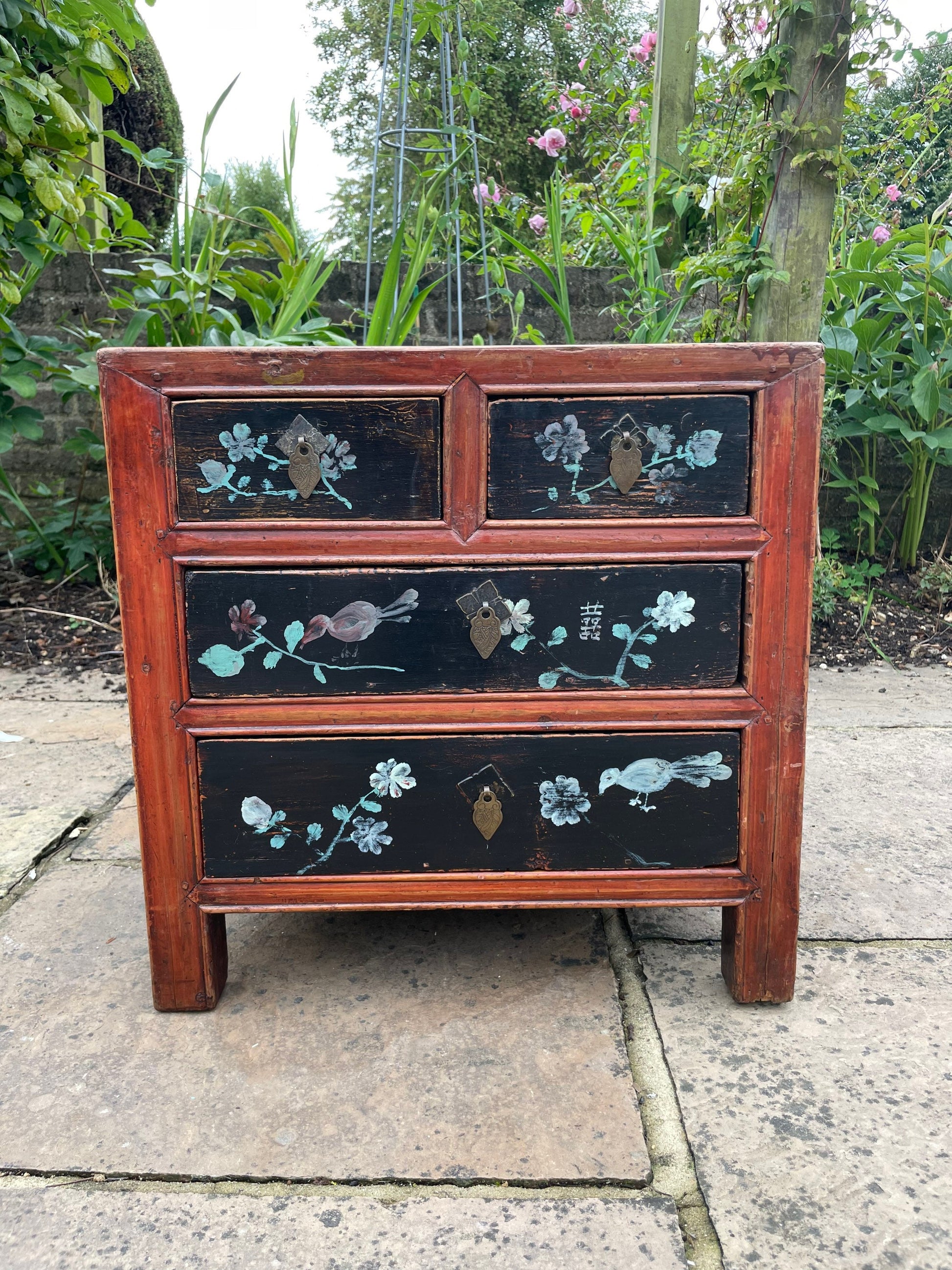Super pretty cabinet decorated in blue and gold with birds and flowers. A lovely versatile piece of furniture with useful storage. Would make a stunning bedside cabinetry or extra storage about the house.