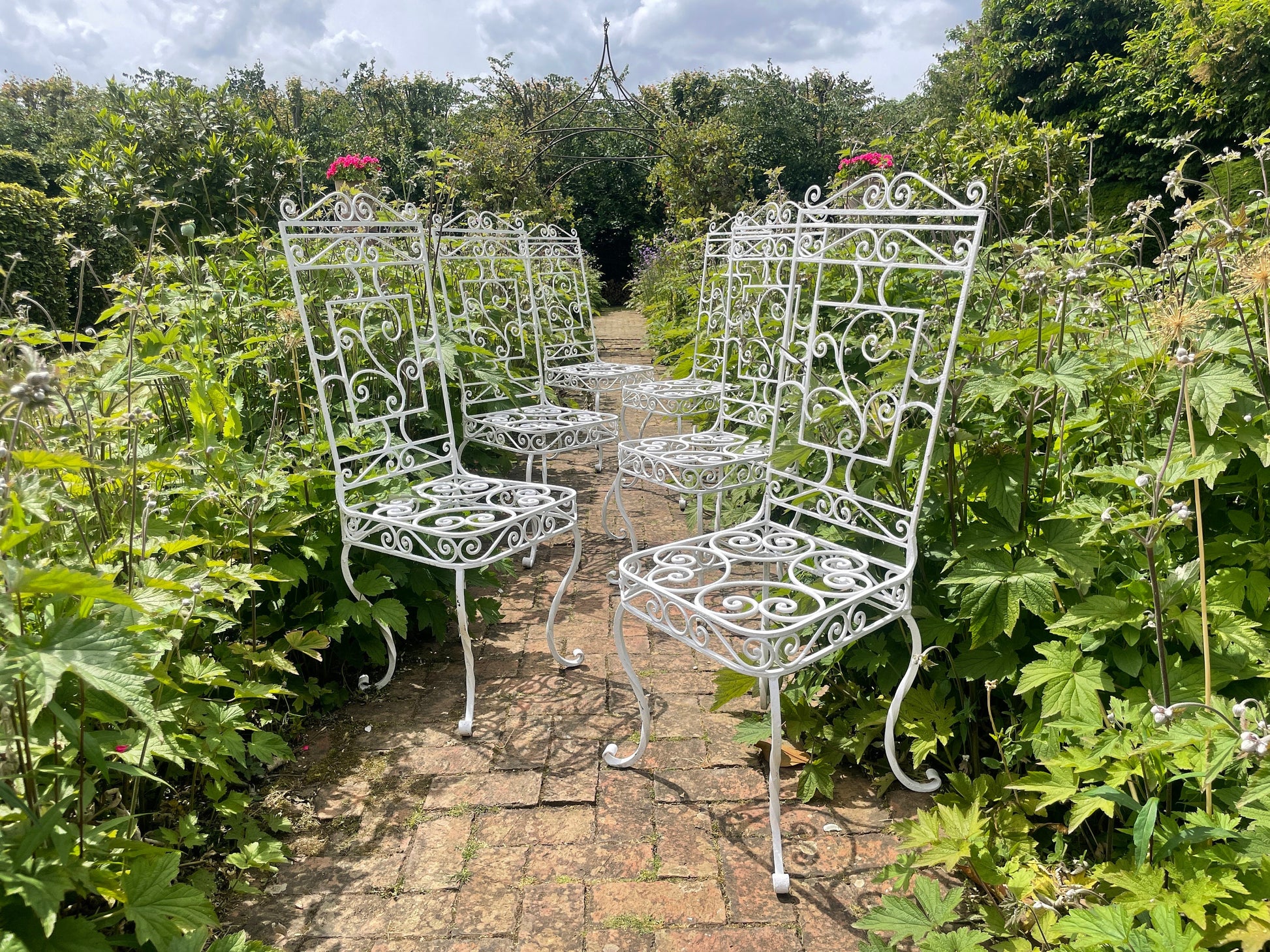 A set of 6 elegant French chairs. Beautifully, crafted and exceptional quality. They are a substantial weight, no chance these guys will blow over in the wind! Their presence will definitely not go a miss in any garden, with such intricate detail and striking high backs. A must for stylish alfresco dining.