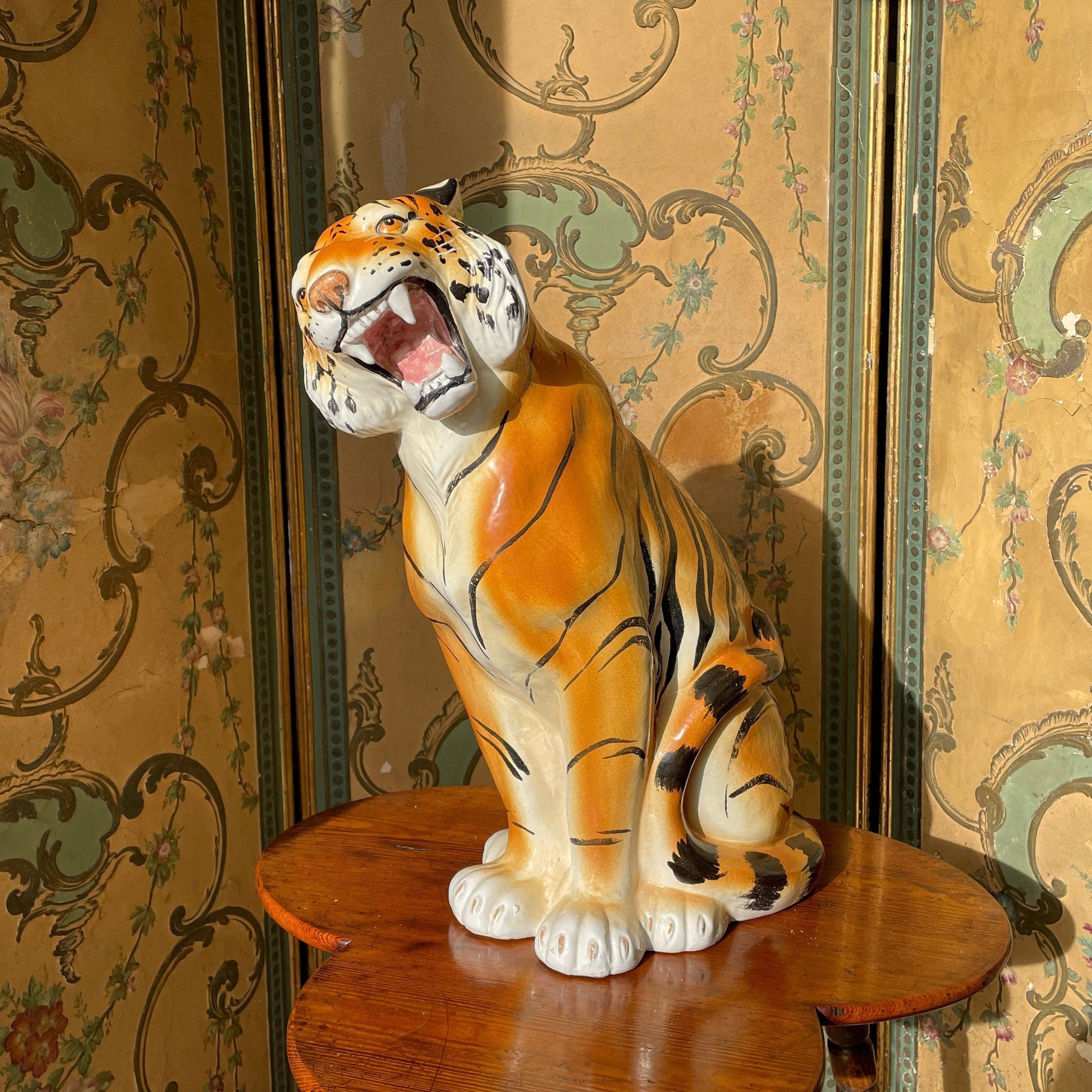 This absolutely fabulous vintage Italian ceramic Tiger statue is all you need to be be a tiger king. It's striking presence, is sure to add some jungle fever to any home. It was previously owned by a lovely young girl who was moving abroad after her studies and felt she couldn't give him the attention he needs. Could you provide this tiger with the sanctuary he needs?