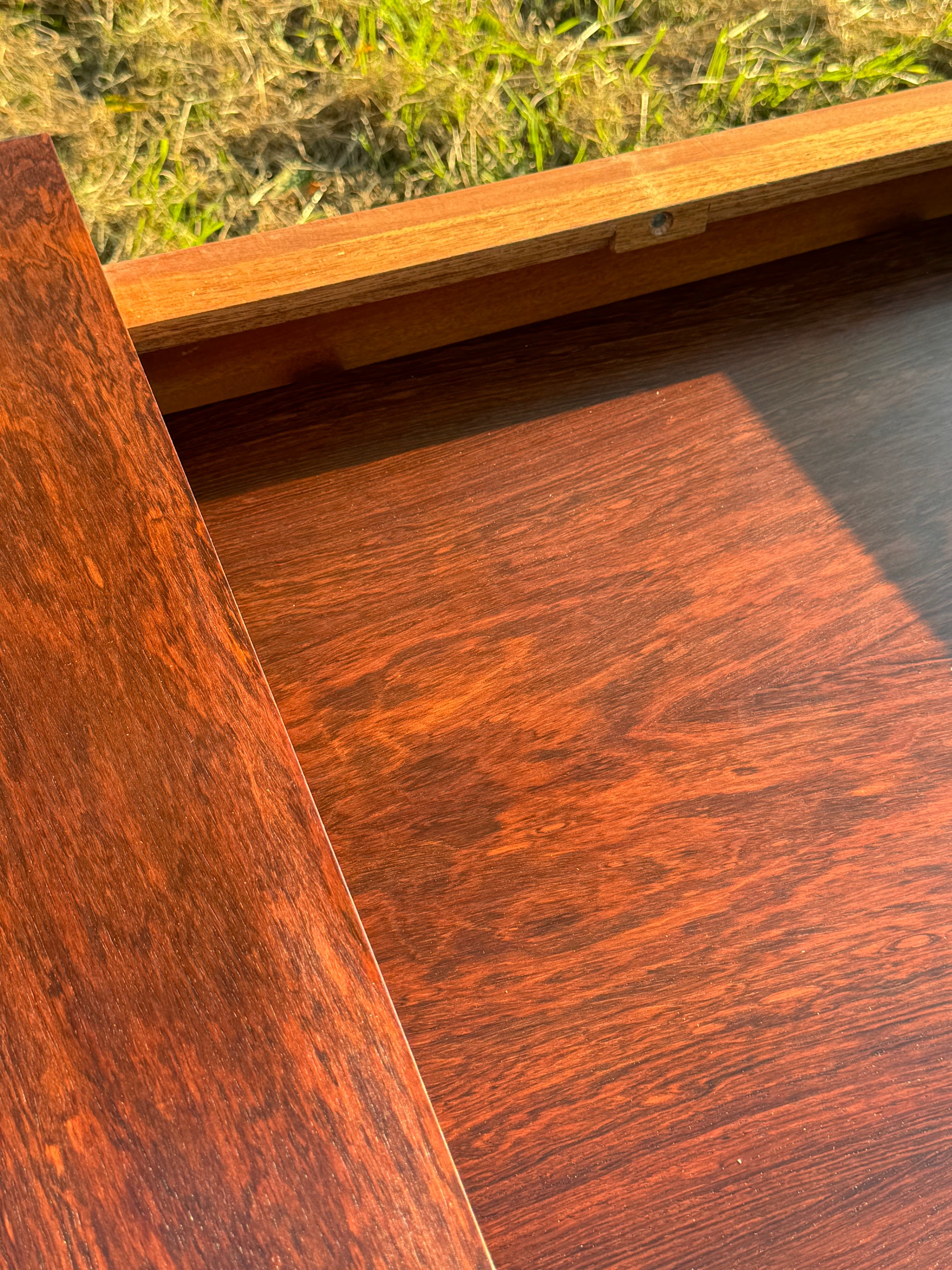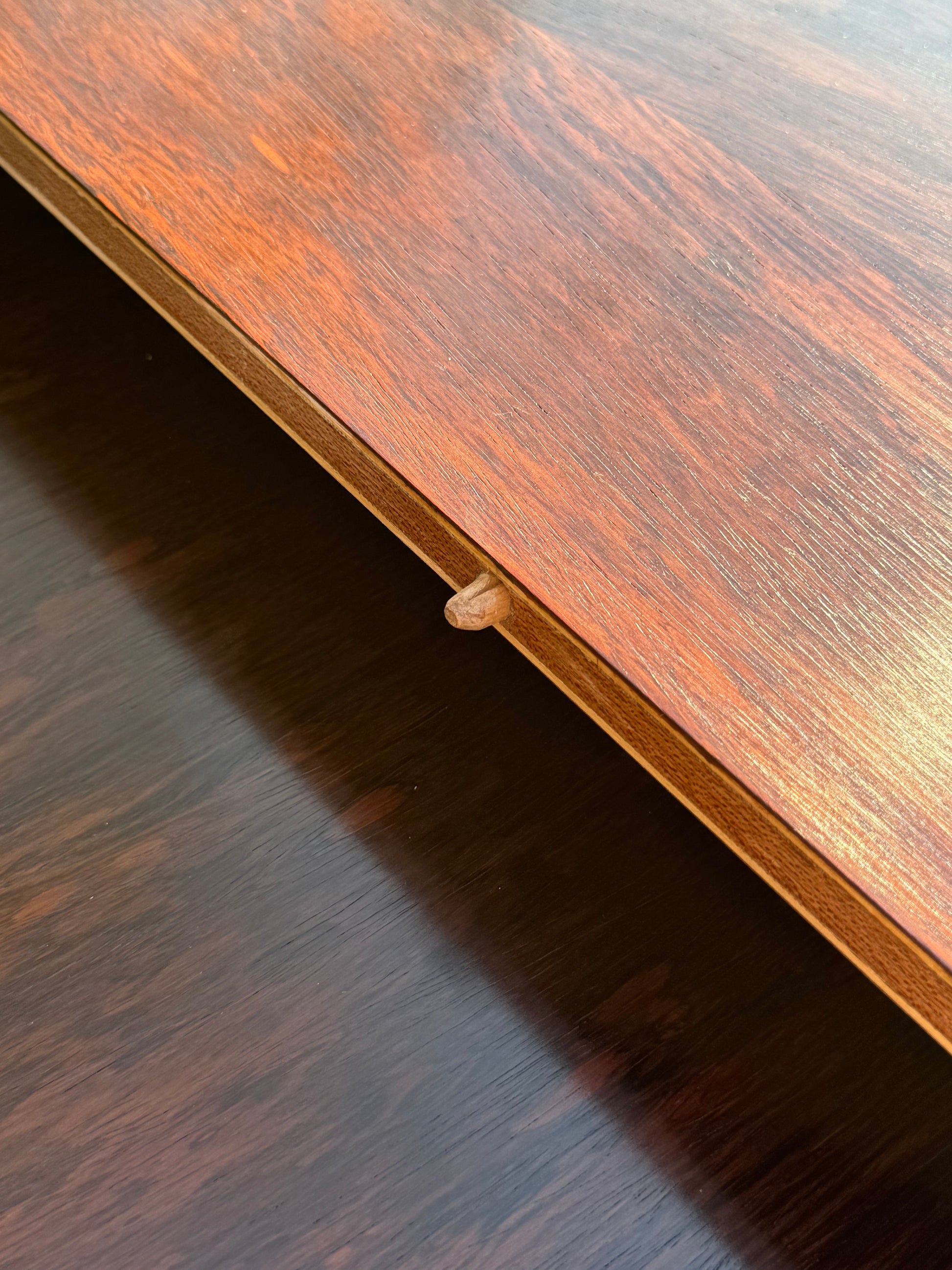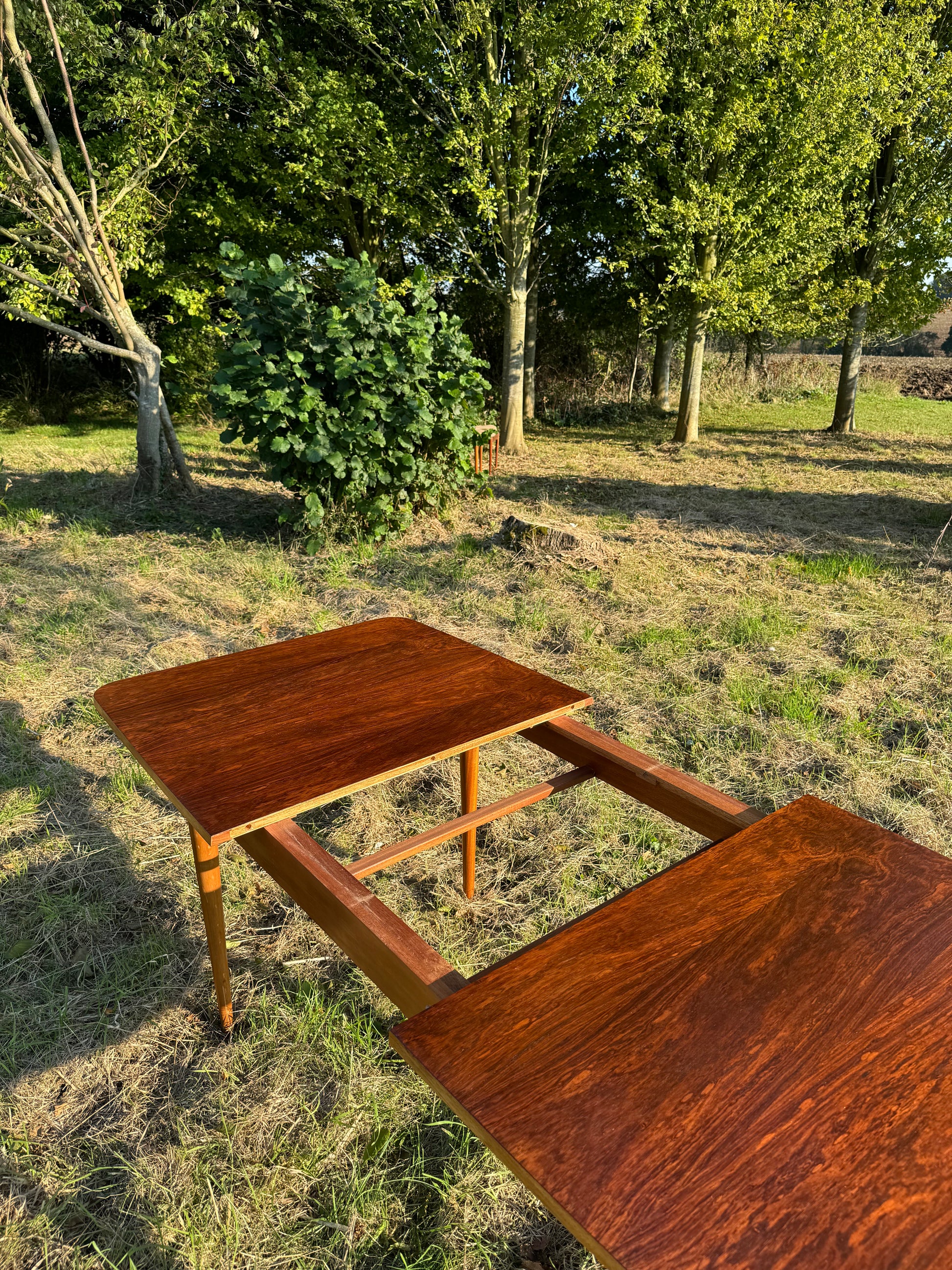 The table rosewood has been fully restored and is in excellent 1960s vintage condition with good colour and matching to the panels. It boasts an extra panel which stores in the body of the table.