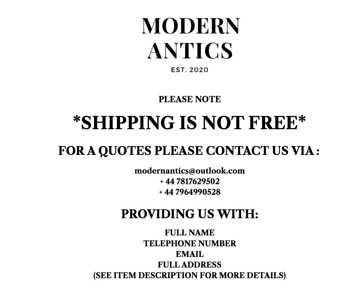 As we specialise in bespoke, one-off pieces, at Modern Antics, not one of our item’s shares the same dimensions as another. This makes it impossible for us to standardise our shipping rates, but is also another reason why every of our items is so special.