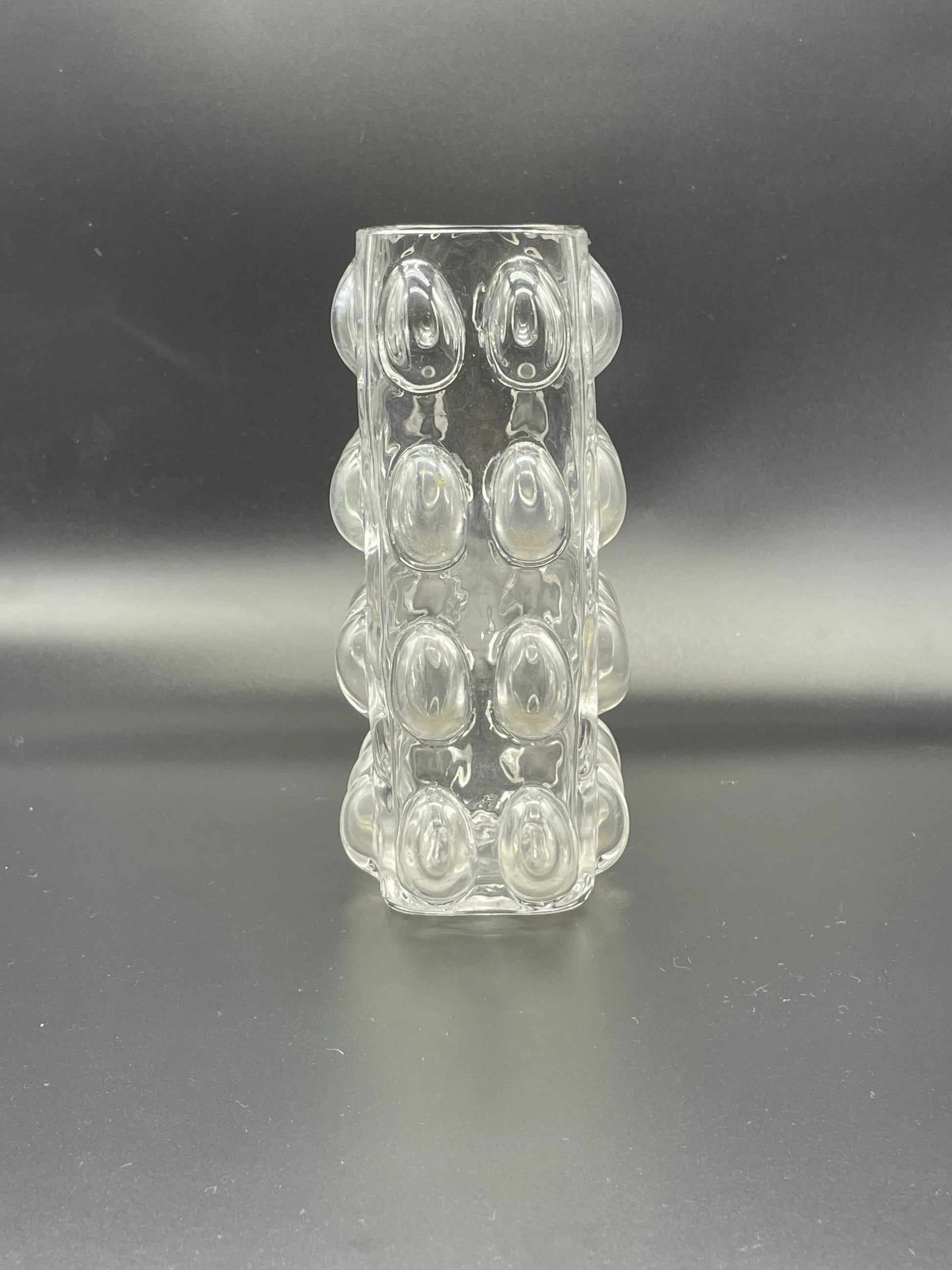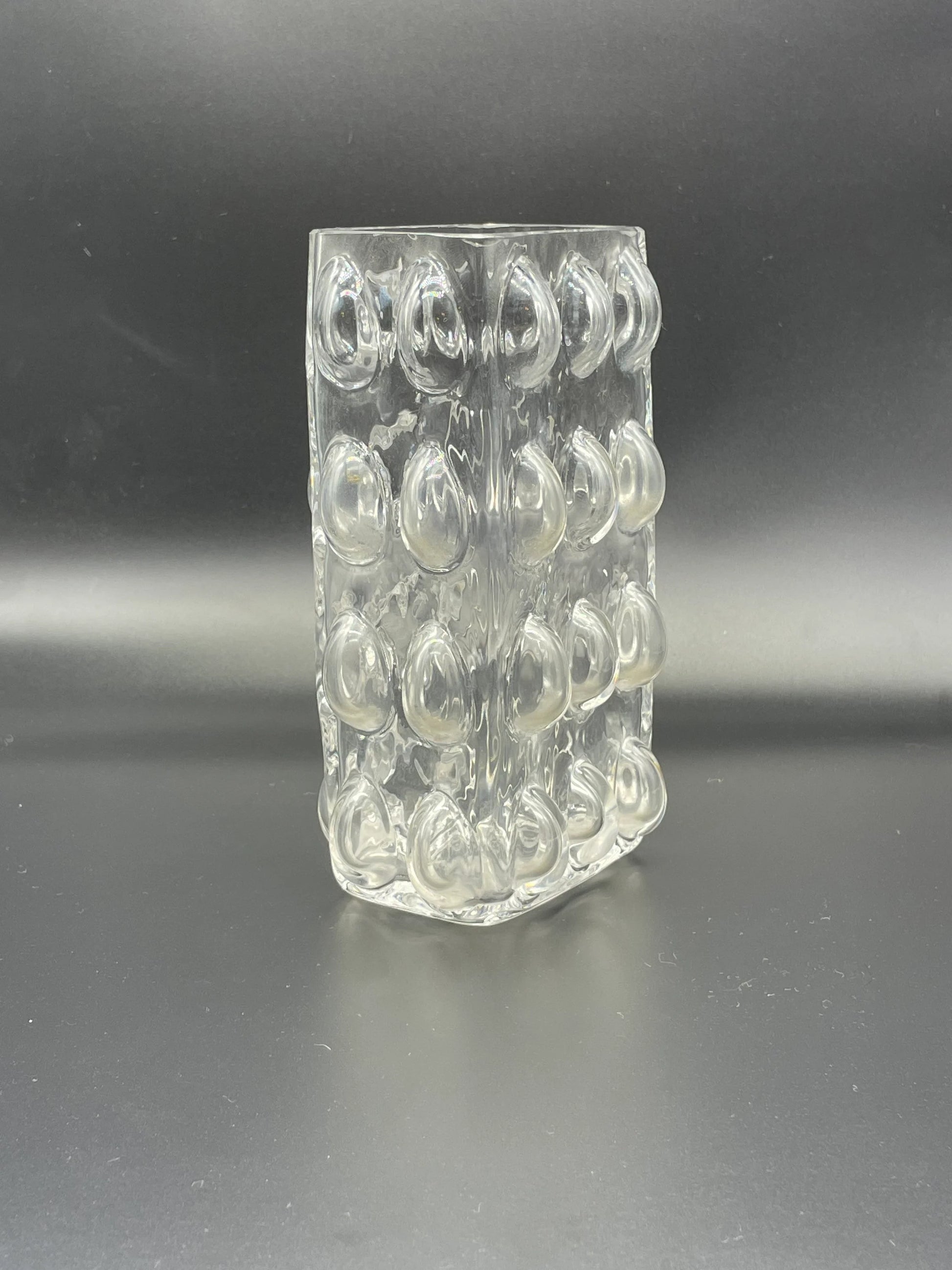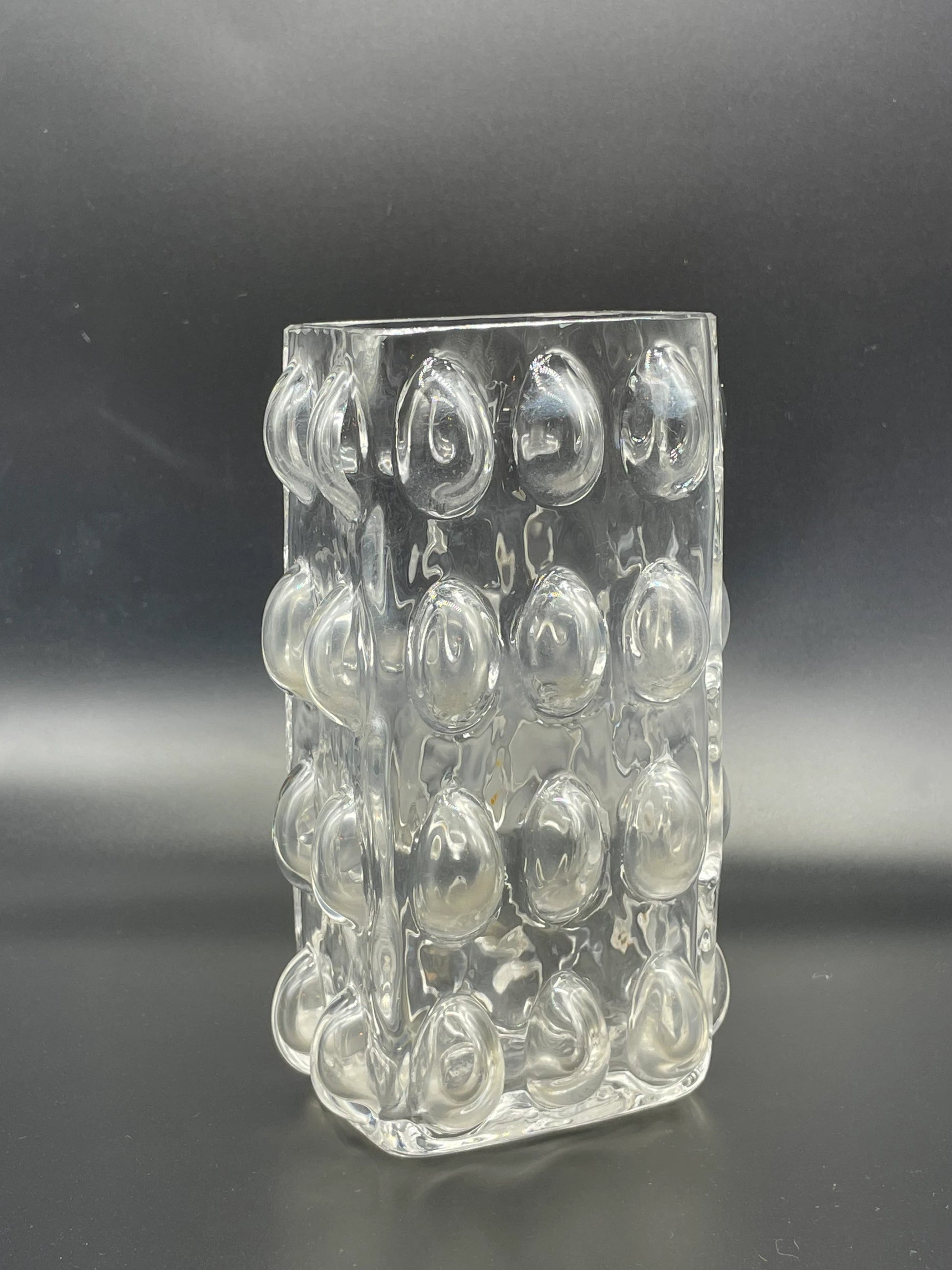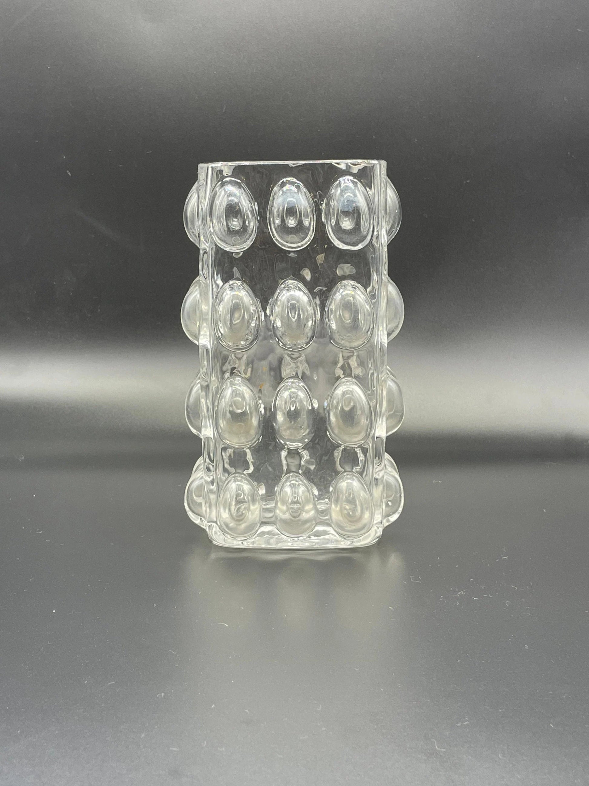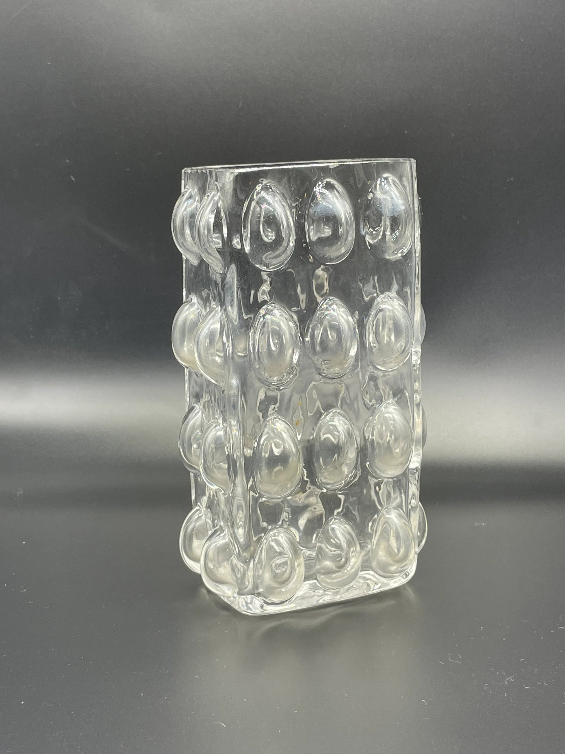 Super stylish glass mid century modern vase. It has a wonderful brutalist style to it and holds a makers sticker at the bottom. It would look great on a coffee table or on a mantlepiece with some flowers to brighten the room. It is in good vintage condition.