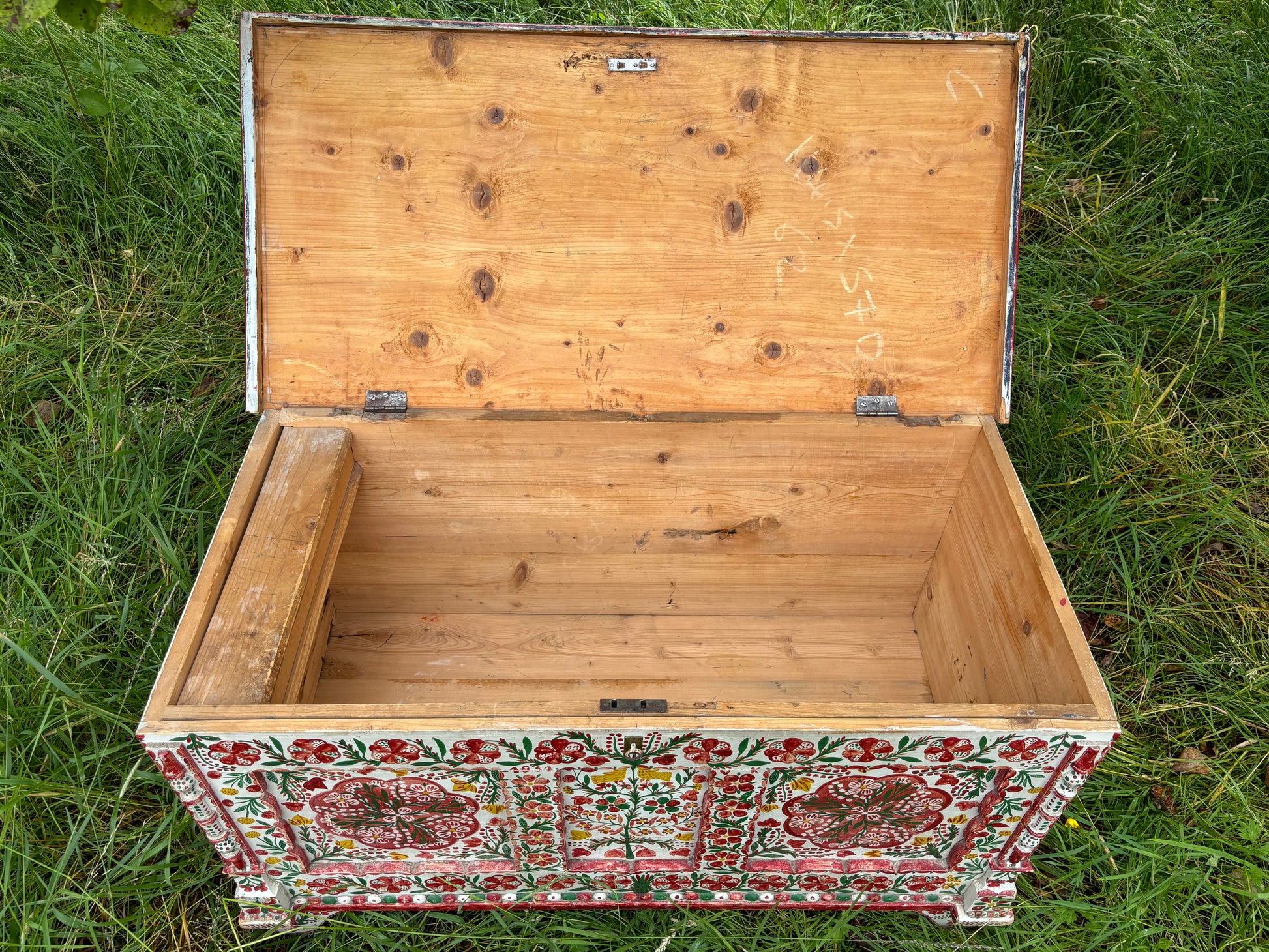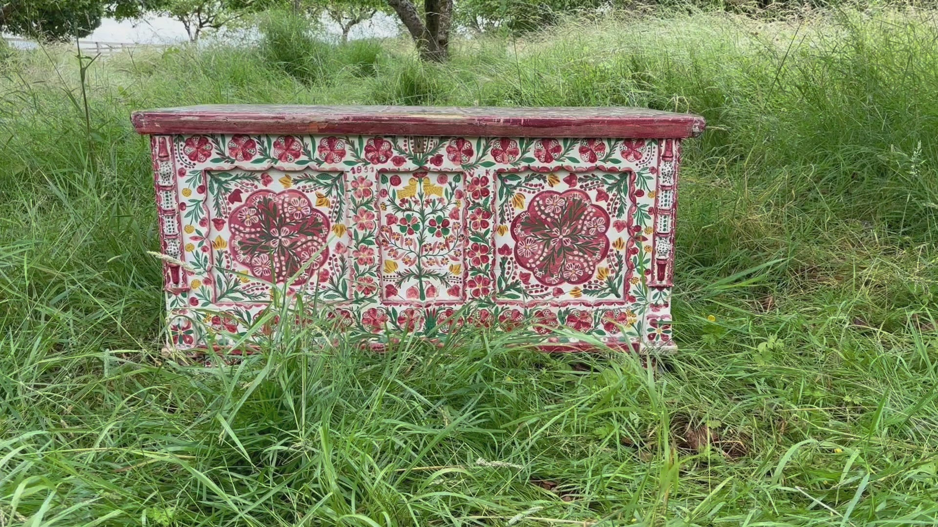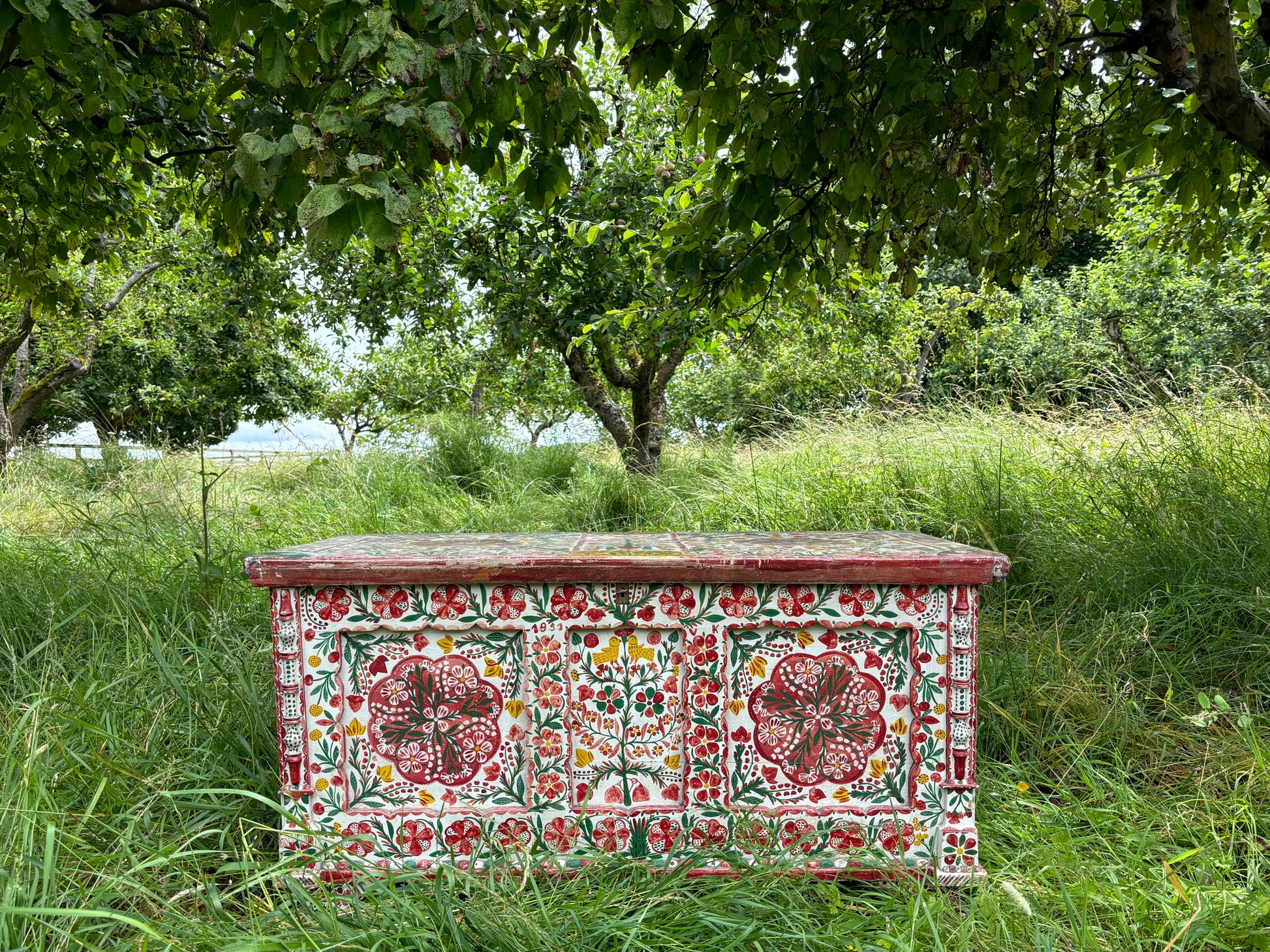 Antique marriage chest / trunk with a gorgeous ornate colourful hand-painted floral design. The front of the chest also features two yellow birds alongside the initials "VK" and "1951".